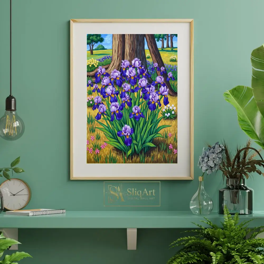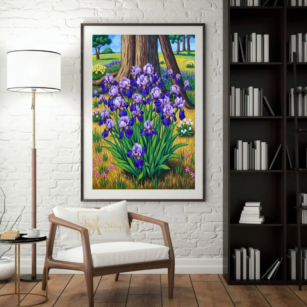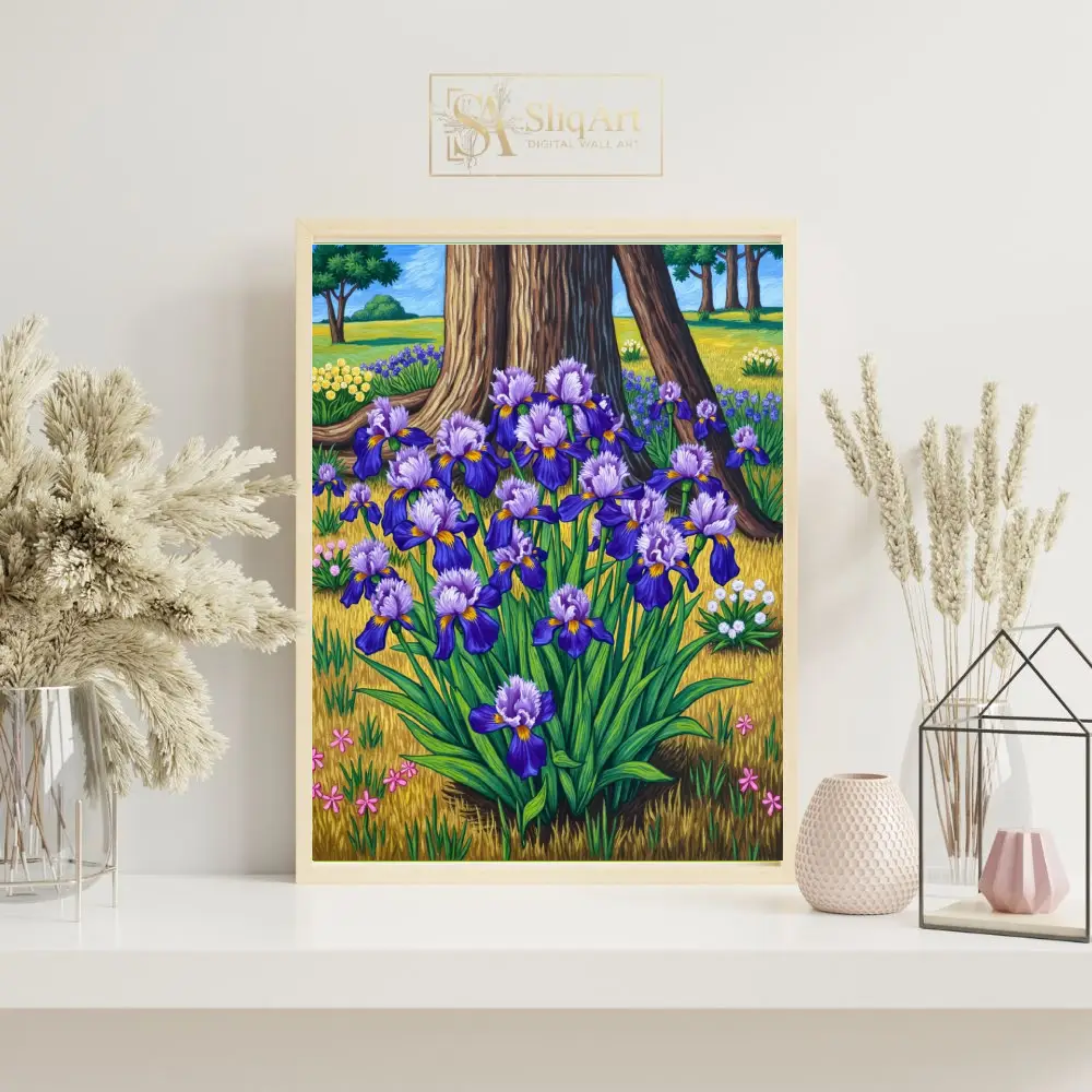 Bring the serene beauty of a spring garden into your home with this stunning painting of purple irises. Set against the textured bark of ancient trees and a sun-drenched meadow, these vibrant blooms command attention with their rich indigo petals and delicate lavender centers.