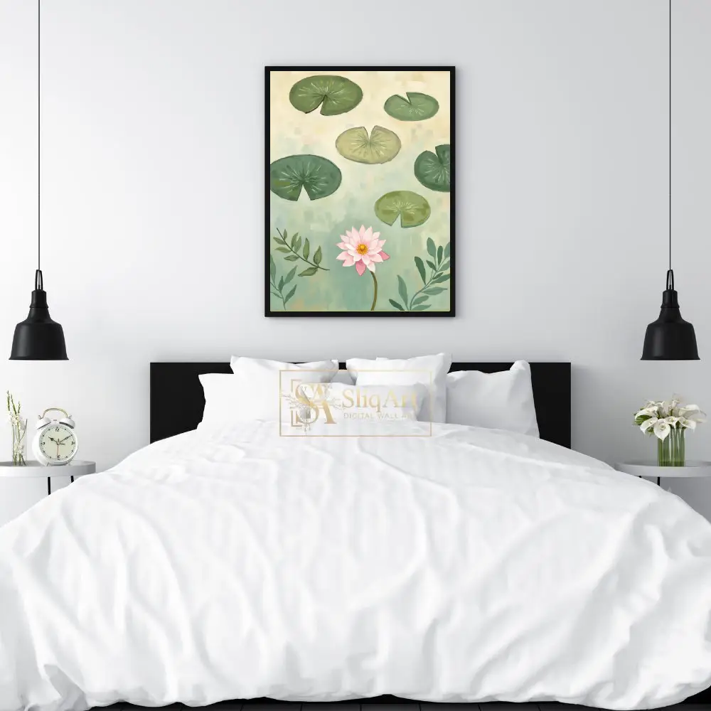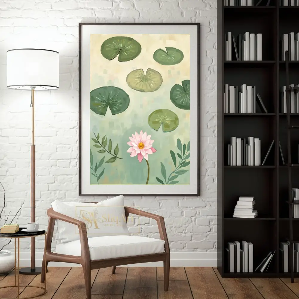 The background shifts from a warm cream to a cool mint green, mimicking the gentle ripples and reflections of a peaceful pond. This artwork’s harmonious color palette and natural subject matter evoke a sense of stillness and zen, making it an ideal choice for creating a soothing atmosphere in any room.