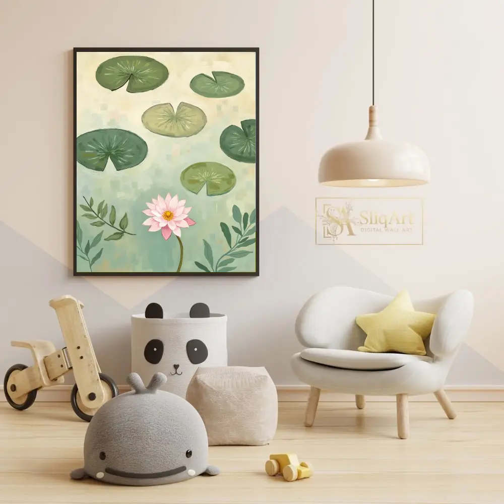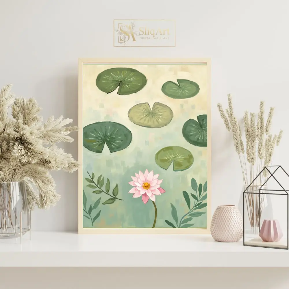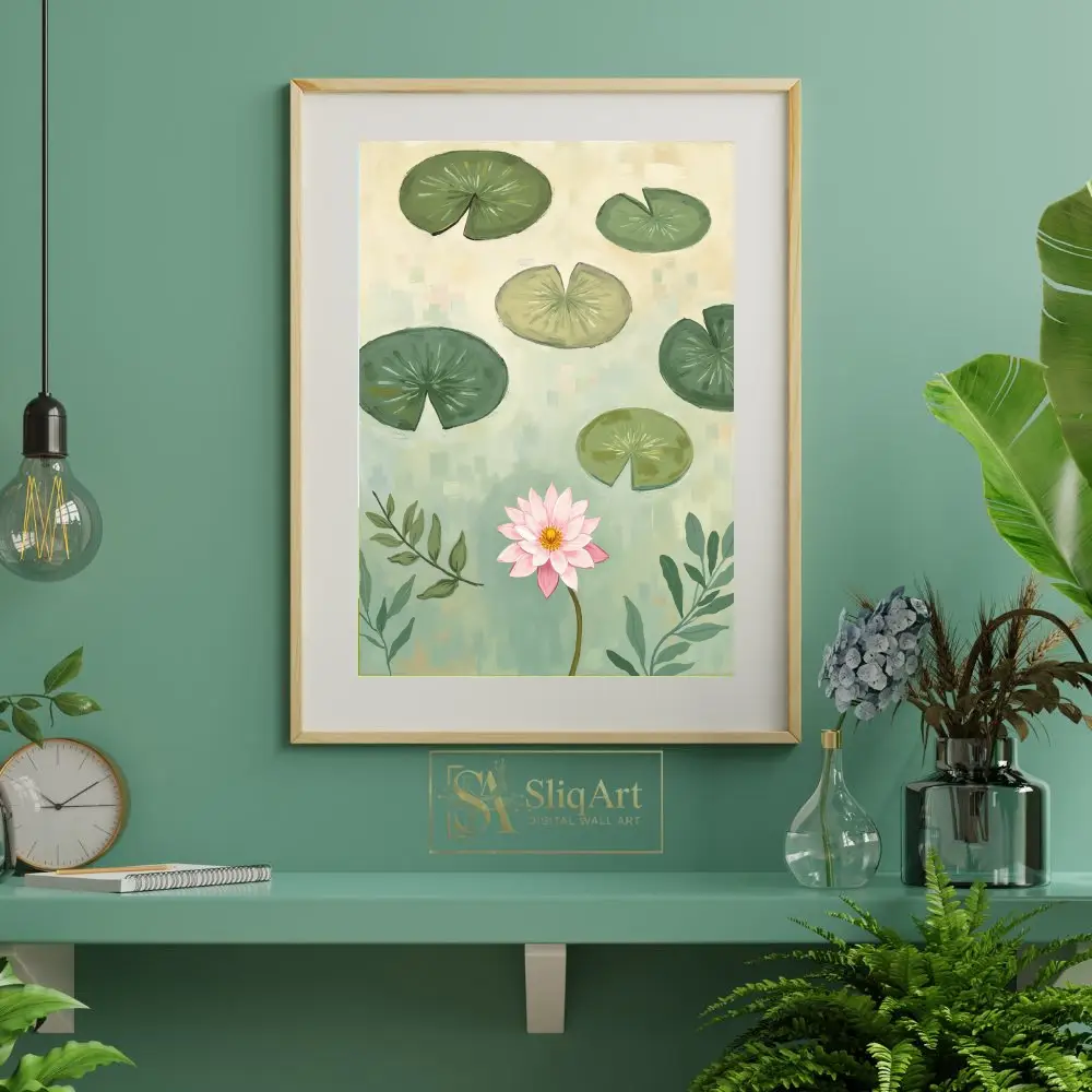 Transform your living space into a tranquil retreat with this stunning impressionist painting of a blooming pink water lily. The composition features a vibrant central lotus blossom floating amongst a sea of lush green lily pads, captured with soft, textured brushstrokes.