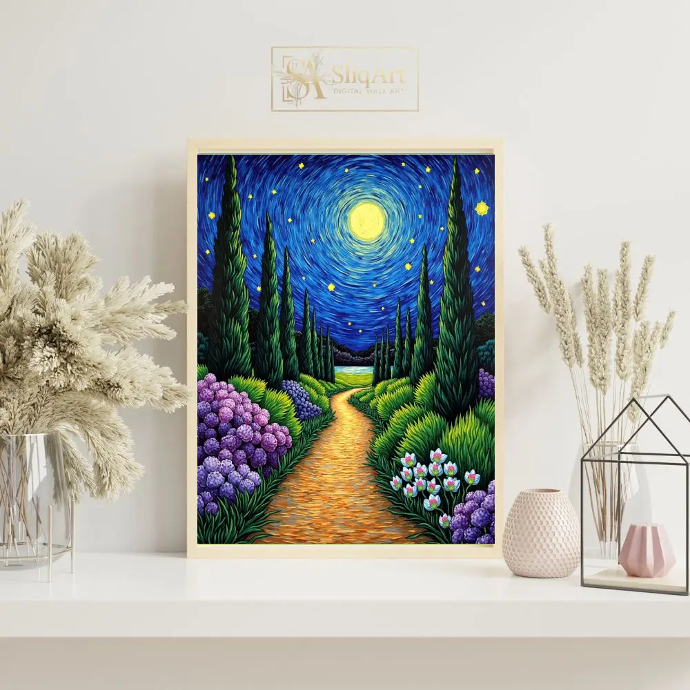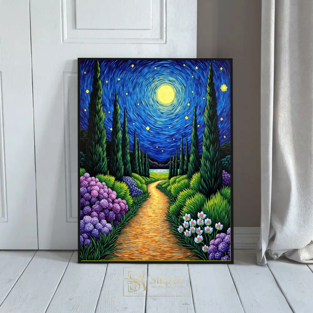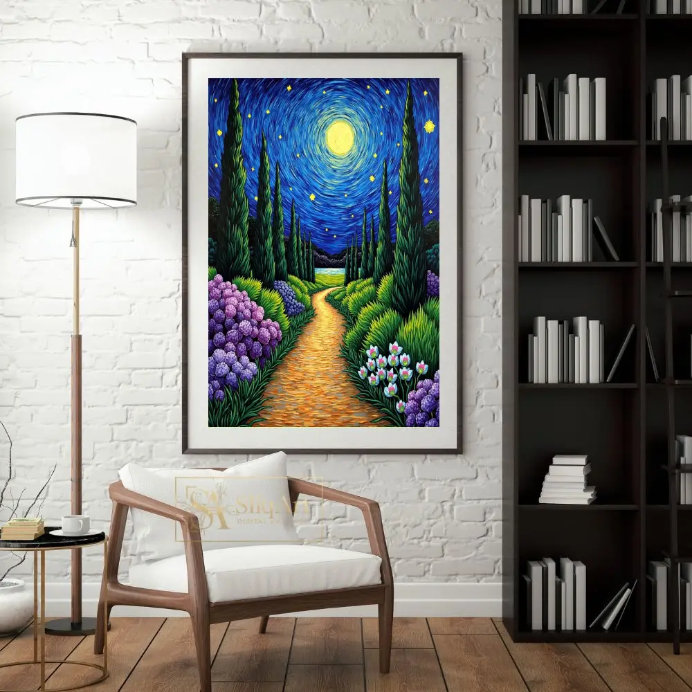 Immerse your space in the enchanting glow of ‘Starry Night Garden Path,’ a vibrant tribute to Post-Impressionist mastery. This captivating piece features a winding golden trail leading through a lush garden of deep purple hydrangeas and delicate white blooms.