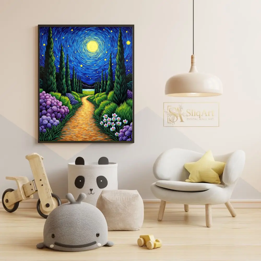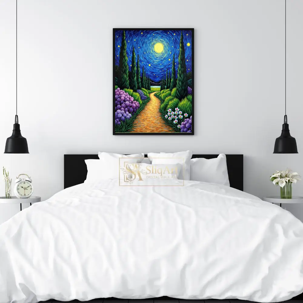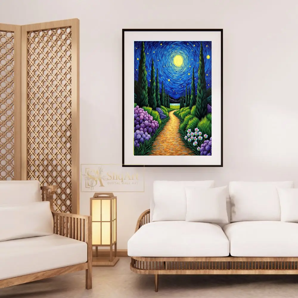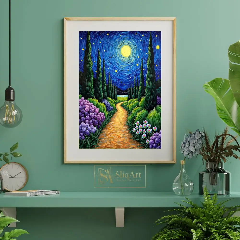 Immerse your space in the enchanting glow of ‘Starry Night Garden Path,’ a vibrant tribute to Post-Impressionist mastery. This captivating piece features a winding golden trail leading through a lush garden of deep purple hydrangeas and delicate white blooms.