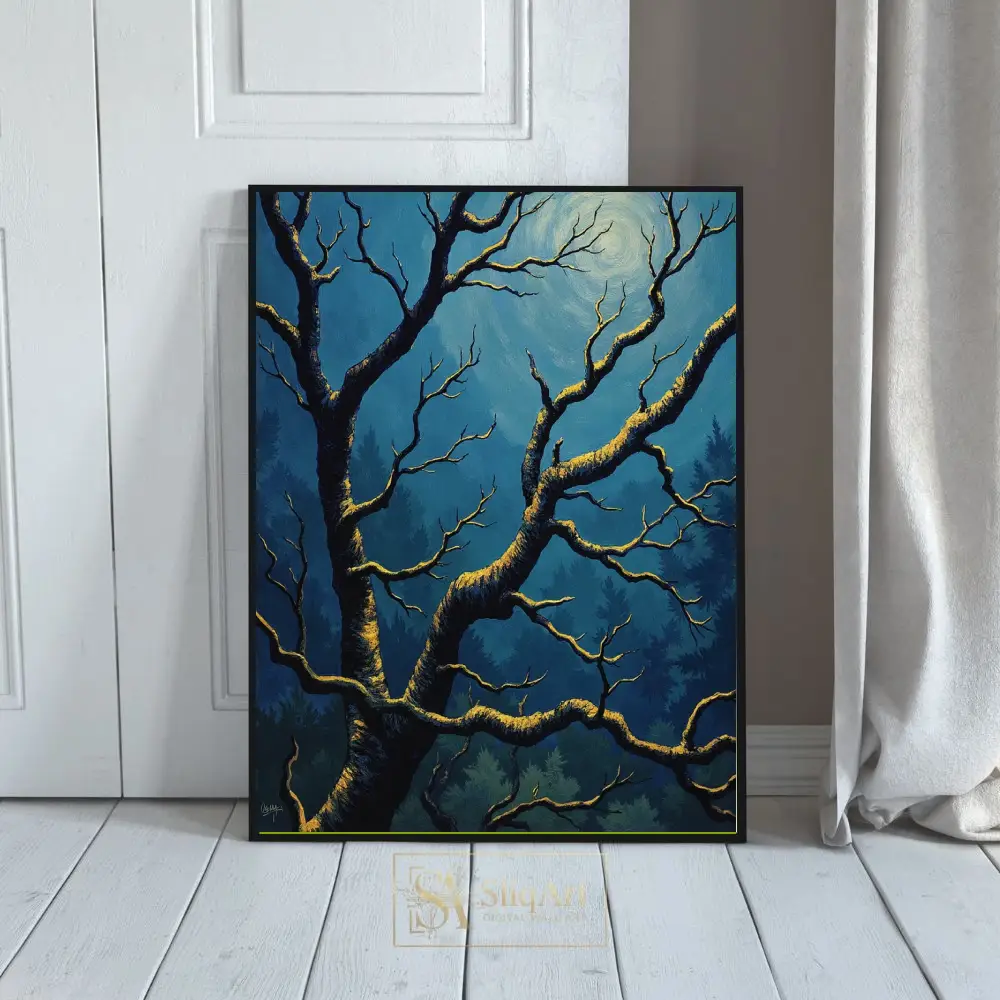 Moonlit Gnarled Tree Wall Art – Night Forest Canvas Print