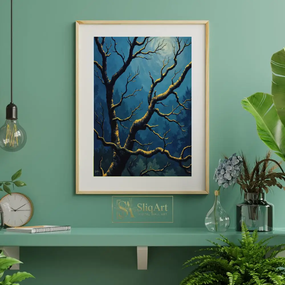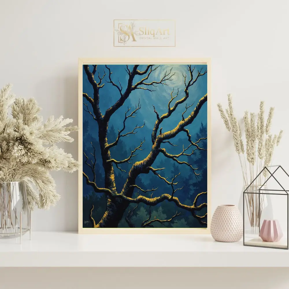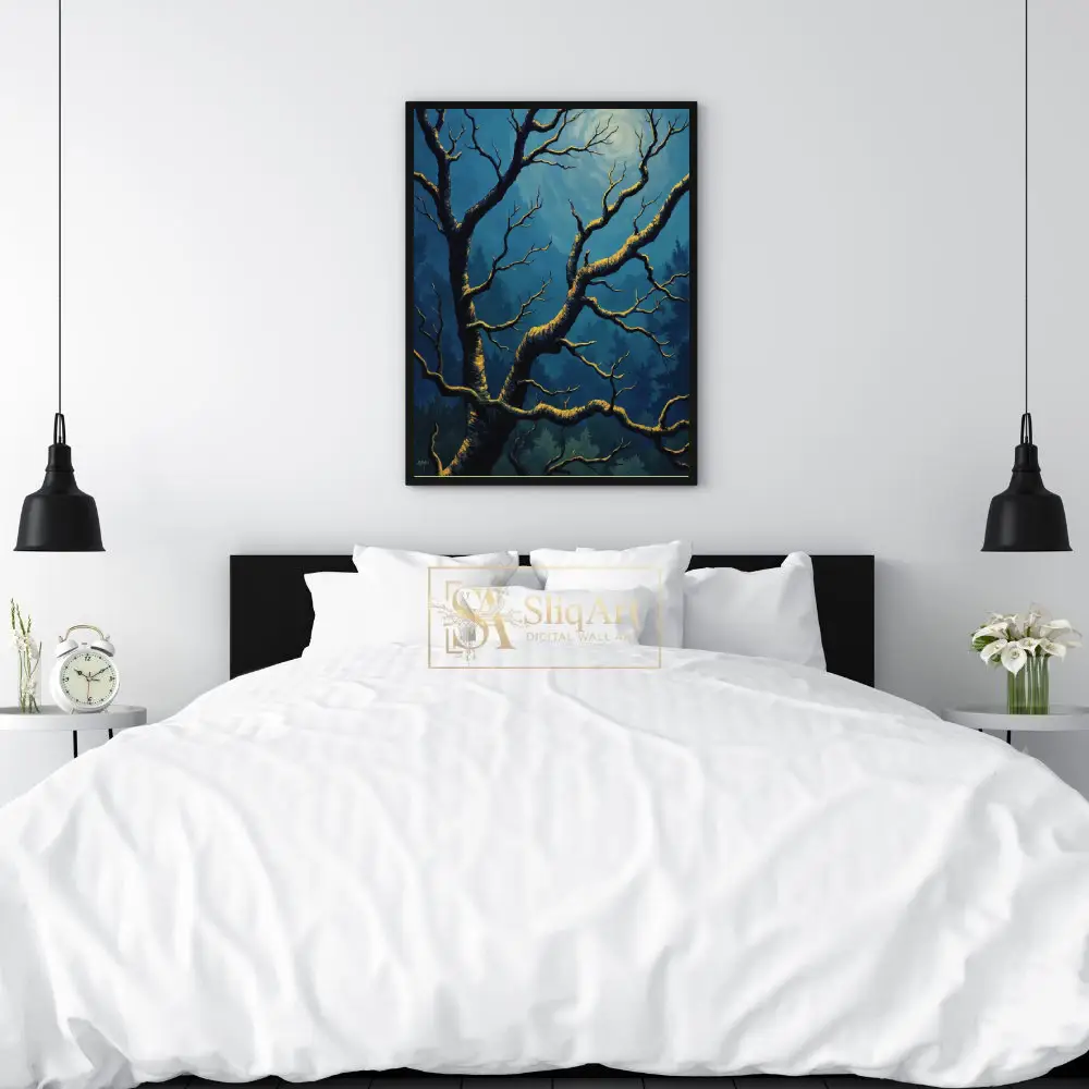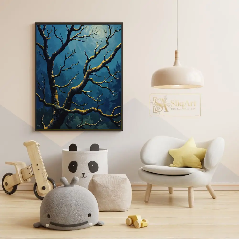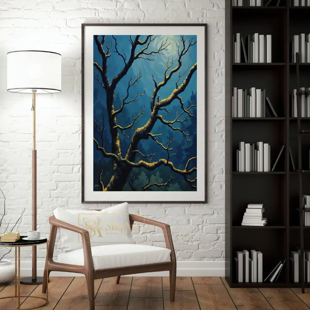 Set against a backdrop of deep indigo and teal pine forests, the golden highlights on the textured bark create a stunning visual contrast. This piece captures the mystical essence of a midnight grove, blending serene cool tones with warm, ethereal light to bring a sense of peaceful mystery to any interior space.