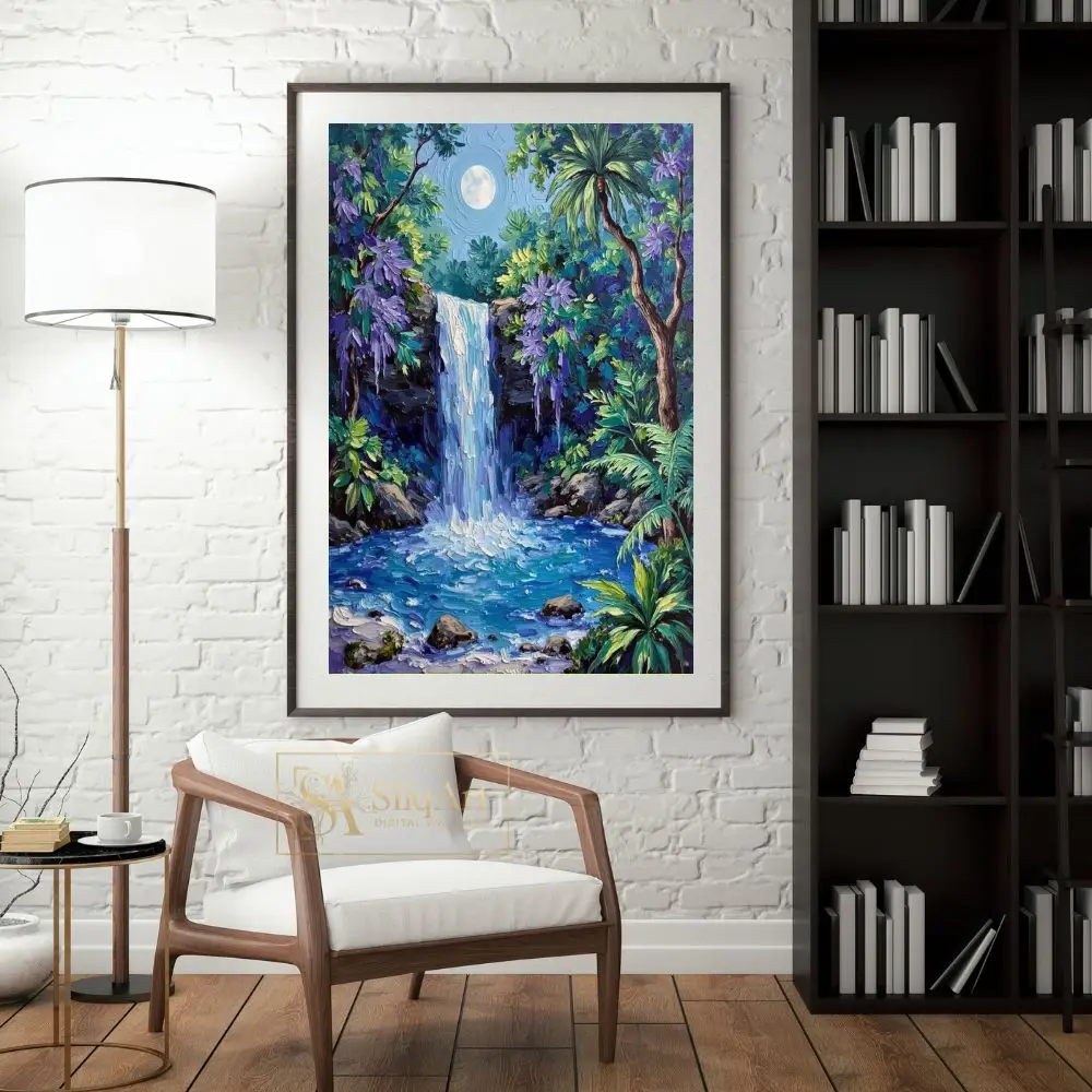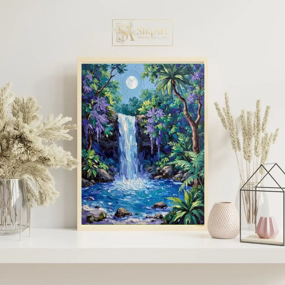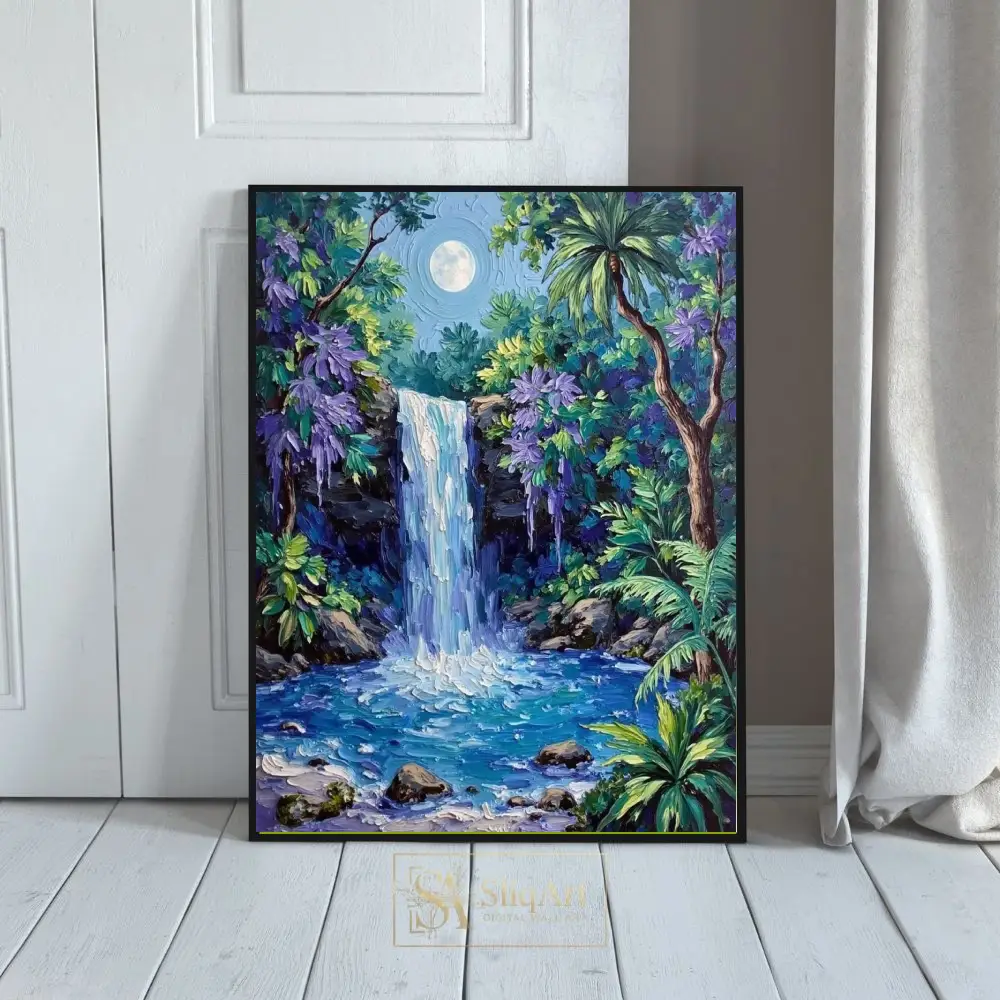 Experience the tranquil beauty of a nocturnal paradise with this stunning impasto oil painting. Capturing a majestic waterfall in the heart of a tropical jungle, the piece uses thick, textured brushstrokes to bring life to the flowing water and moonlit lagoon.