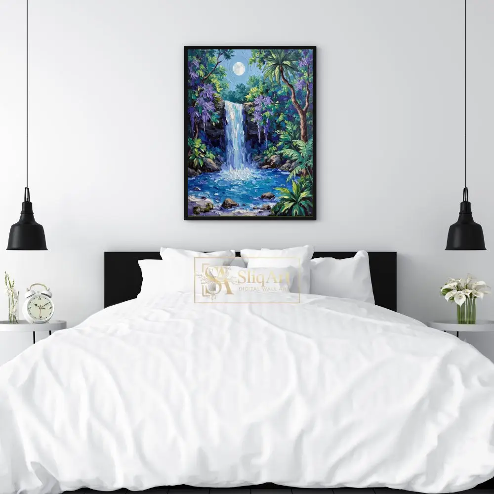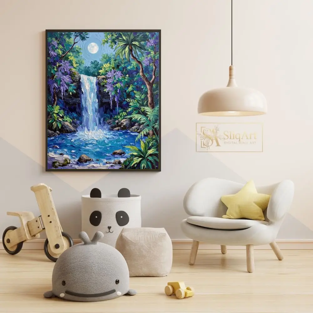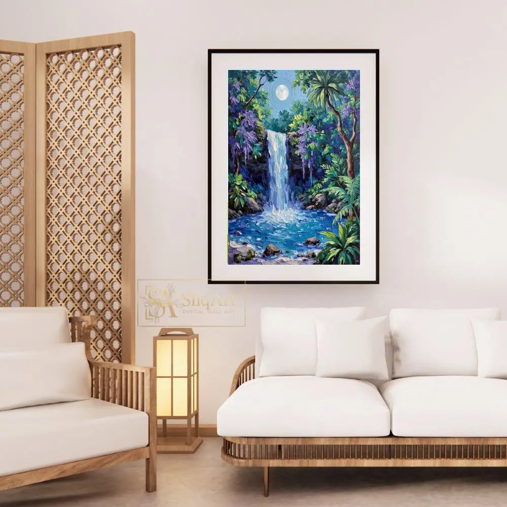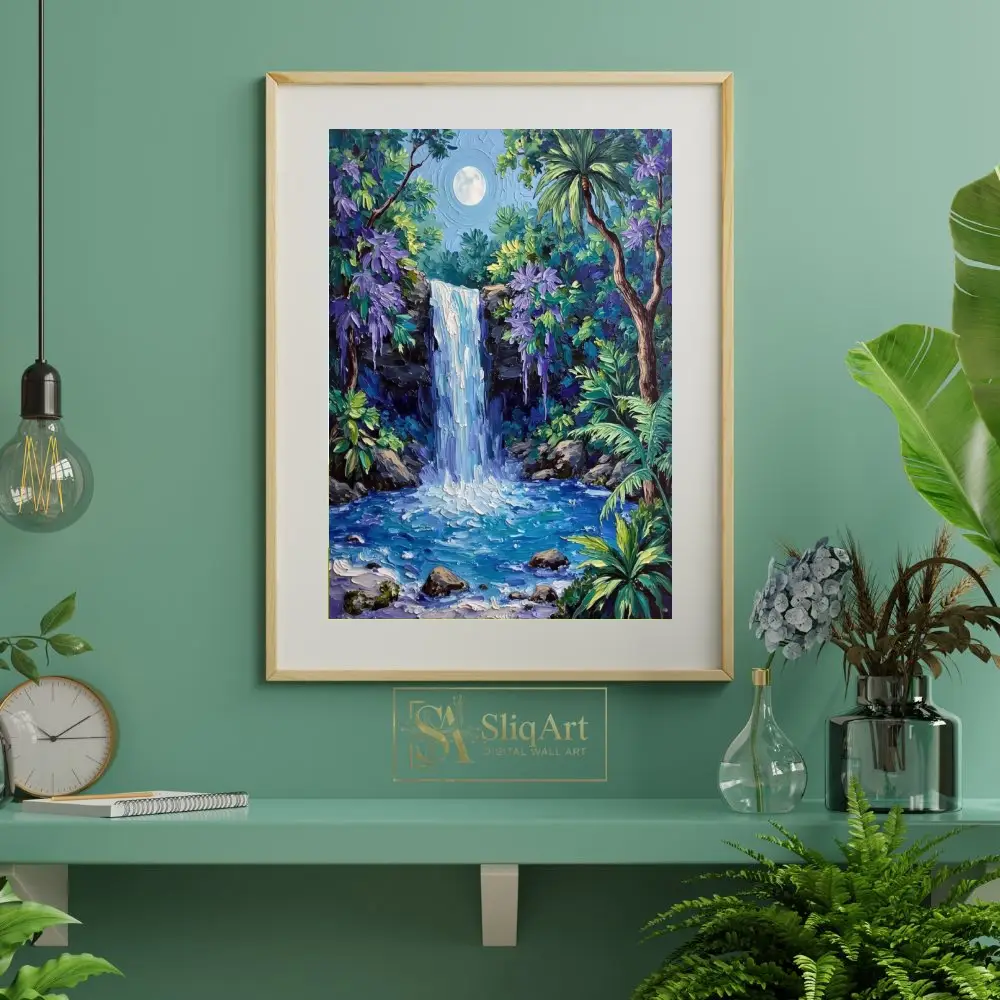 Experience the tranquil beauty of a nocturnal paradise with this stunning impasto oil painting. Capturing a majestic waterfall in the heart of a tropical jungle, the piece uses thick, textured brushstrokes to bring life to the flowing water and moonlit lagoon.