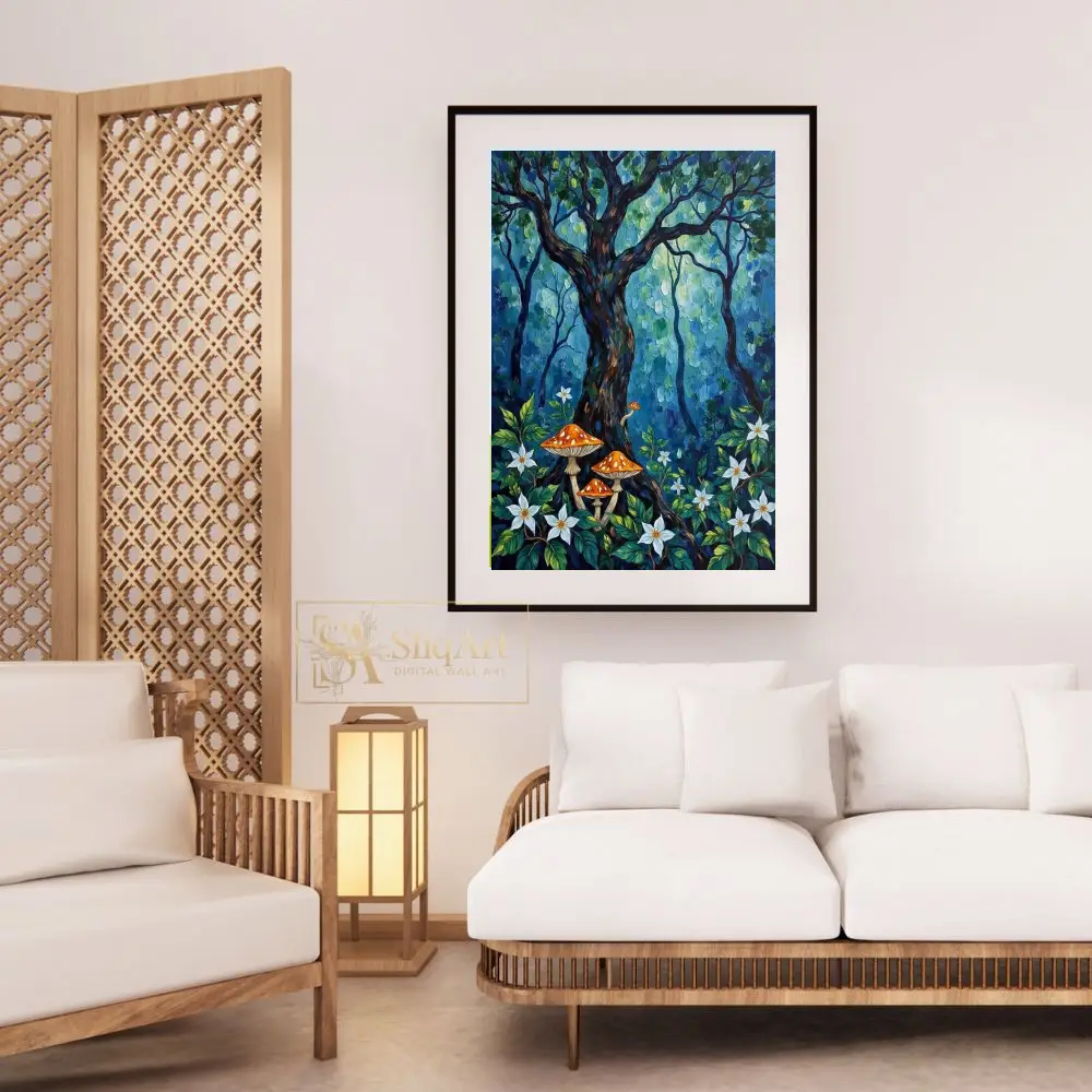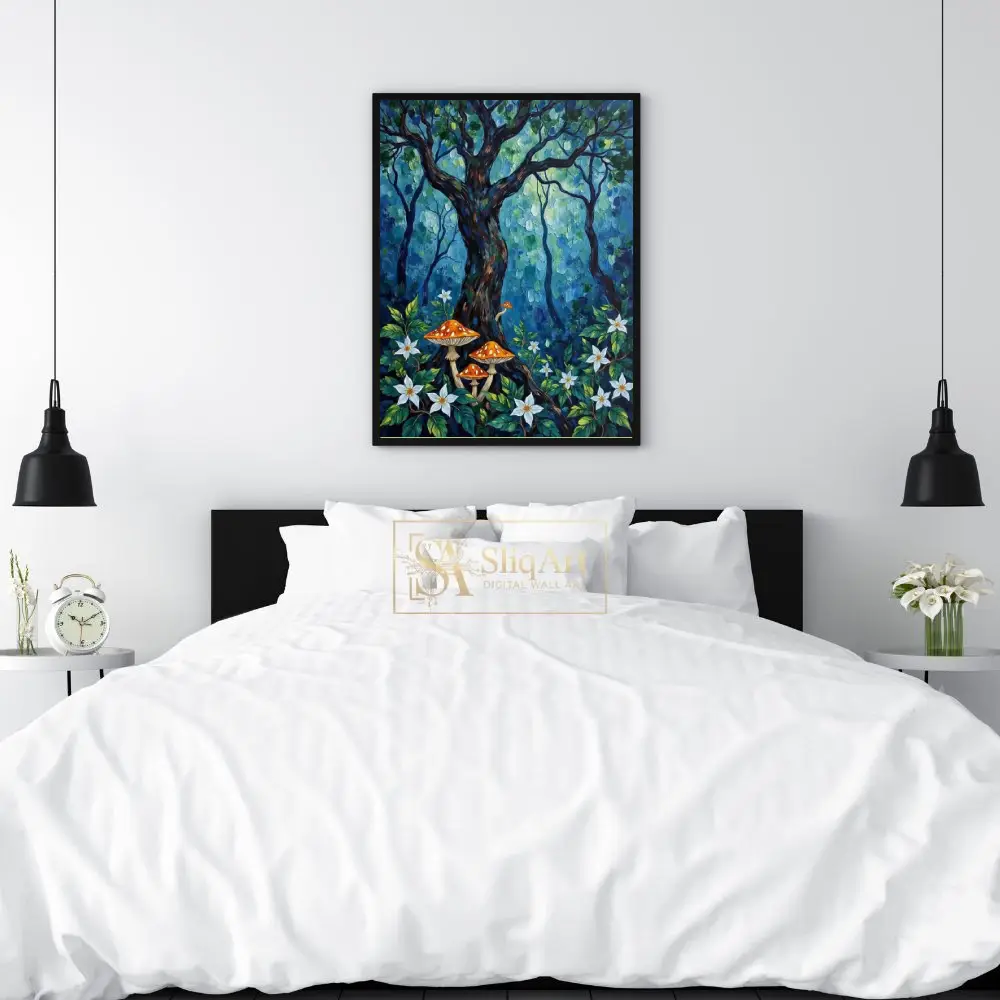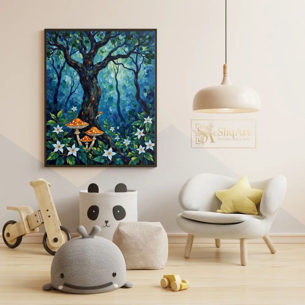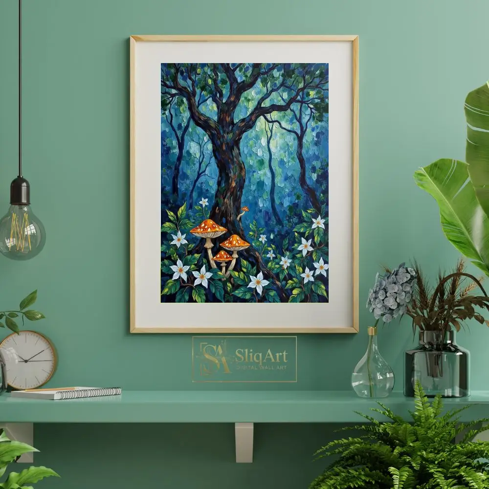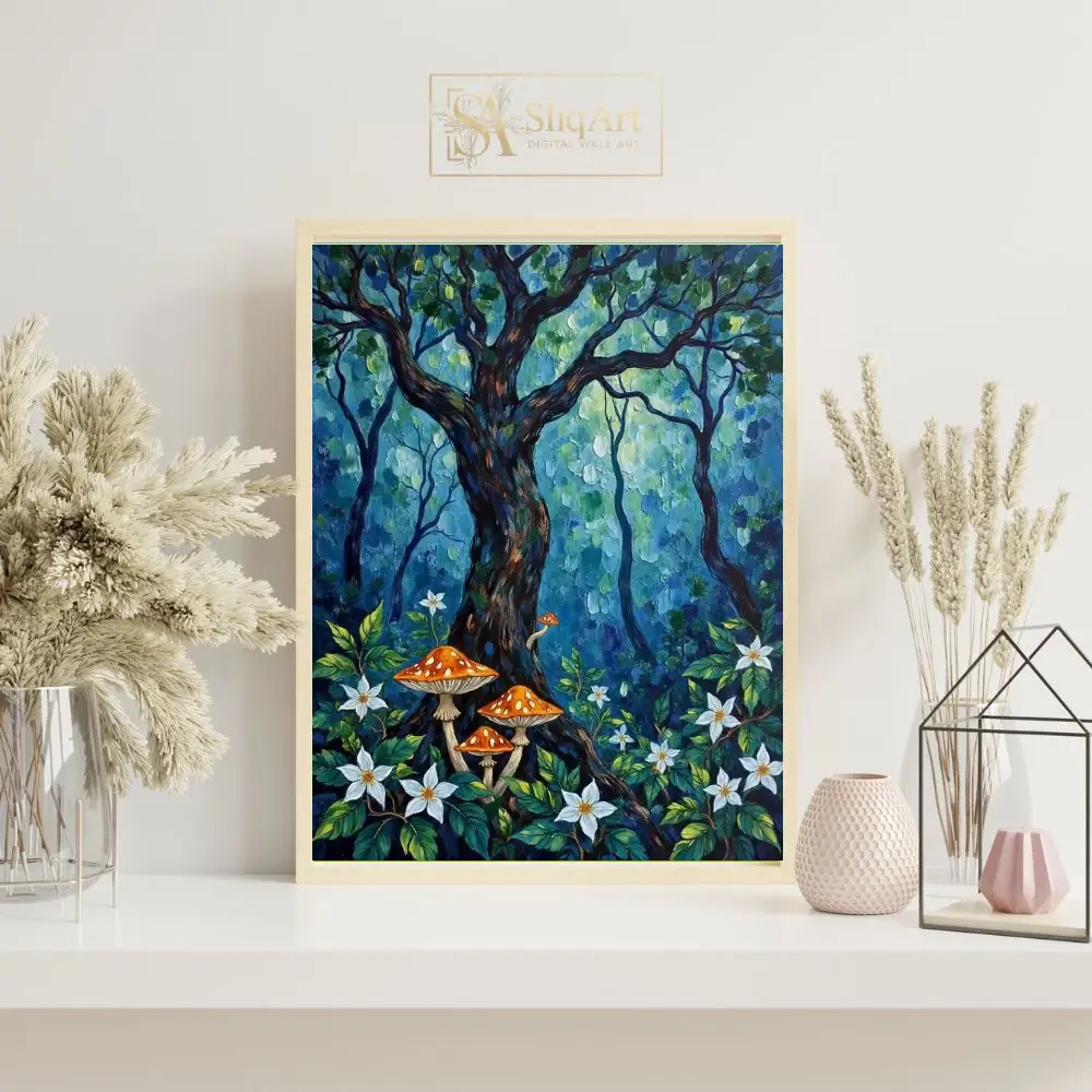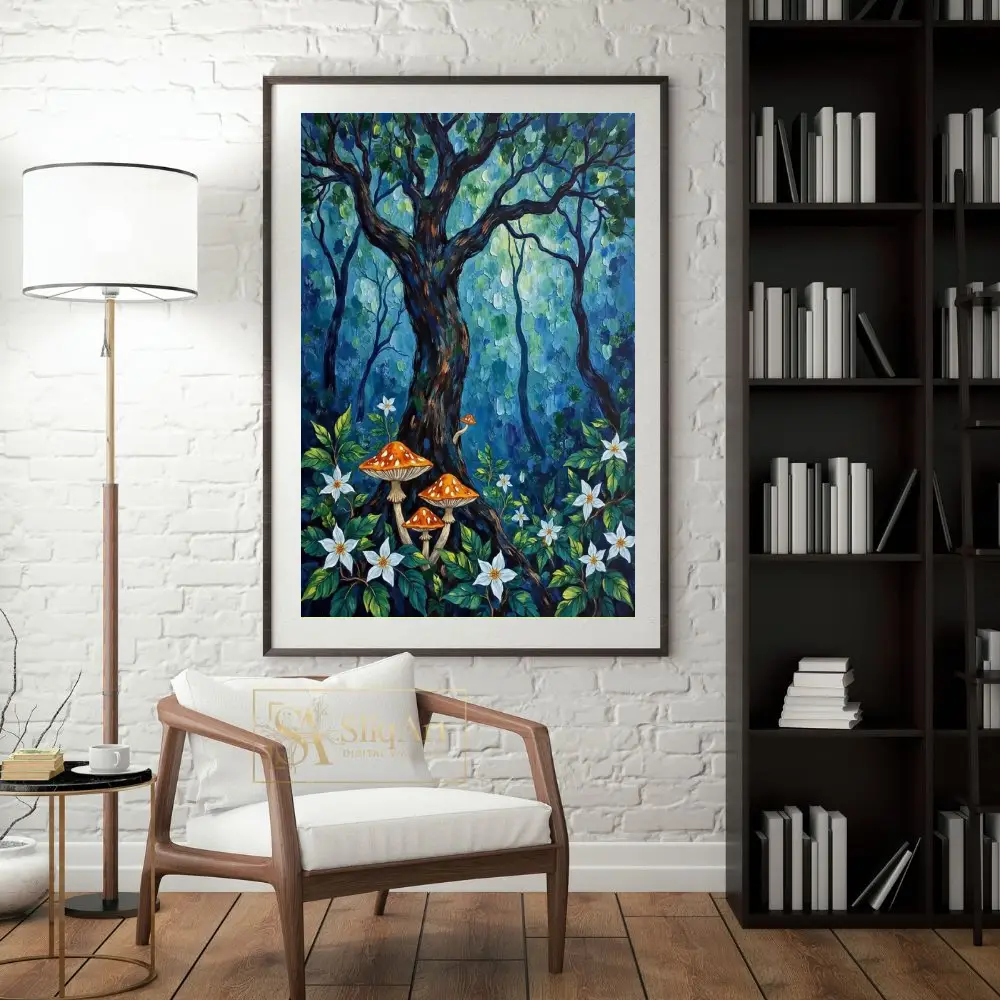 This stunning impasto-style painting captures the magical essence of an enchanted forest. The central focus is a majestic, gnarled tree surrounded by vibrant orange mushrooms and delicate white wildflowers.