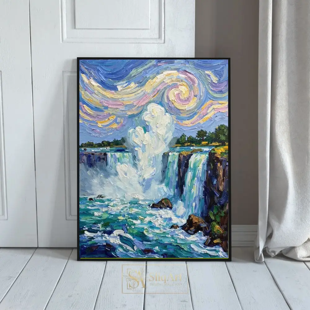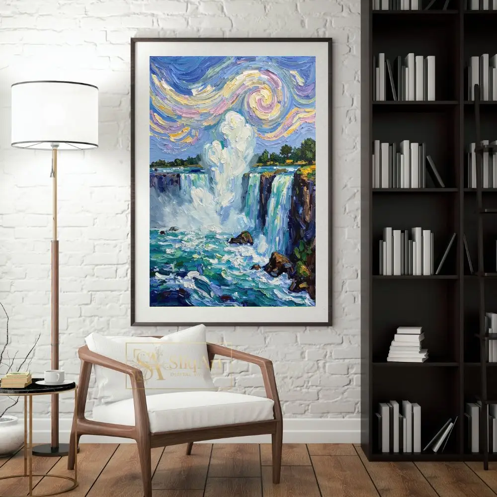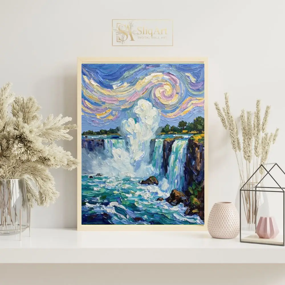 This breathtaking wall art piece captures the majestic power of a cascading waterfall through a lens of Post-Impressionist masterwork. Utilizing thick, textured impasto brushstrokes that echo the style of Van Gogh, the painting features a dynamic sky filled with swirling patterns of pastel yellow, soft pink, and deep blue.