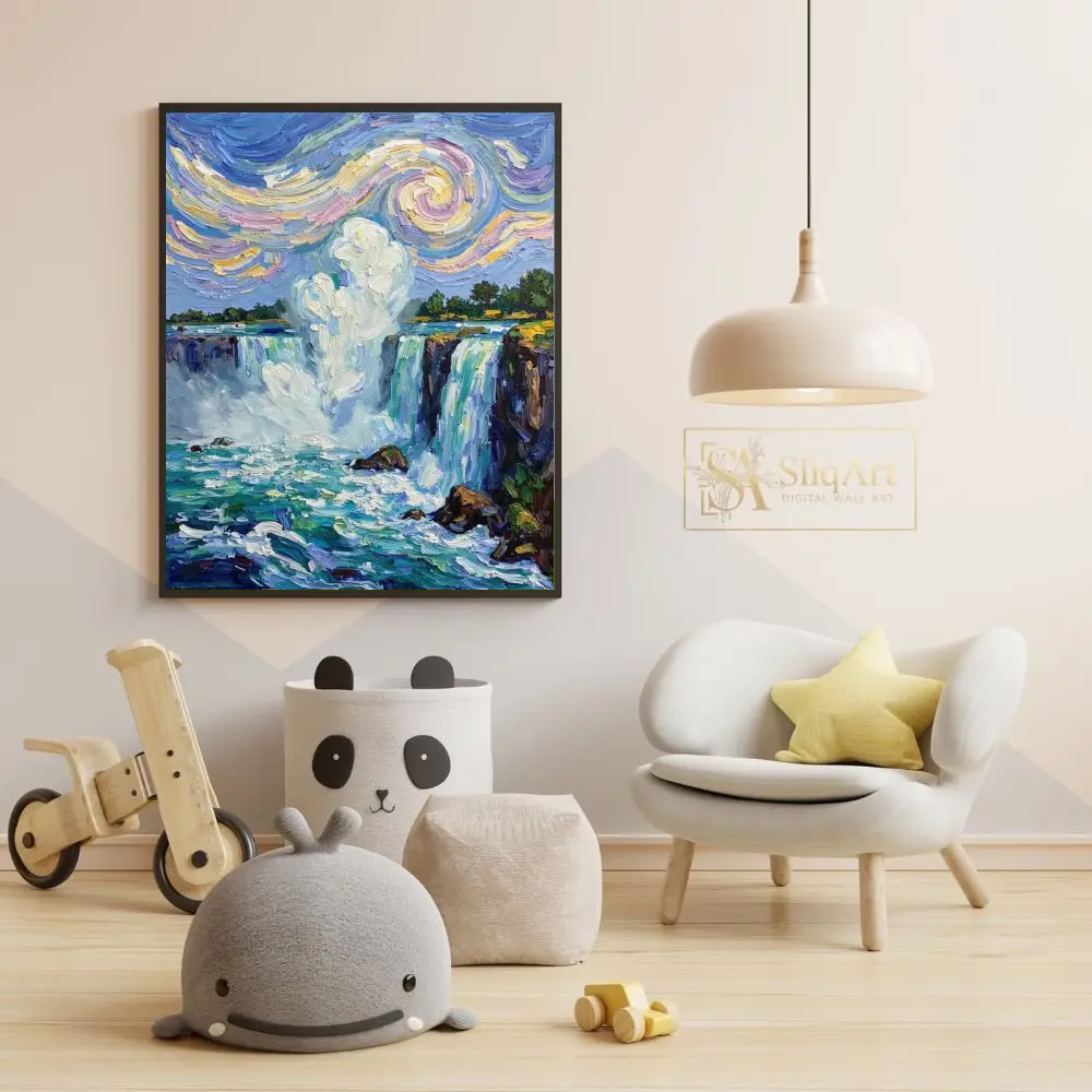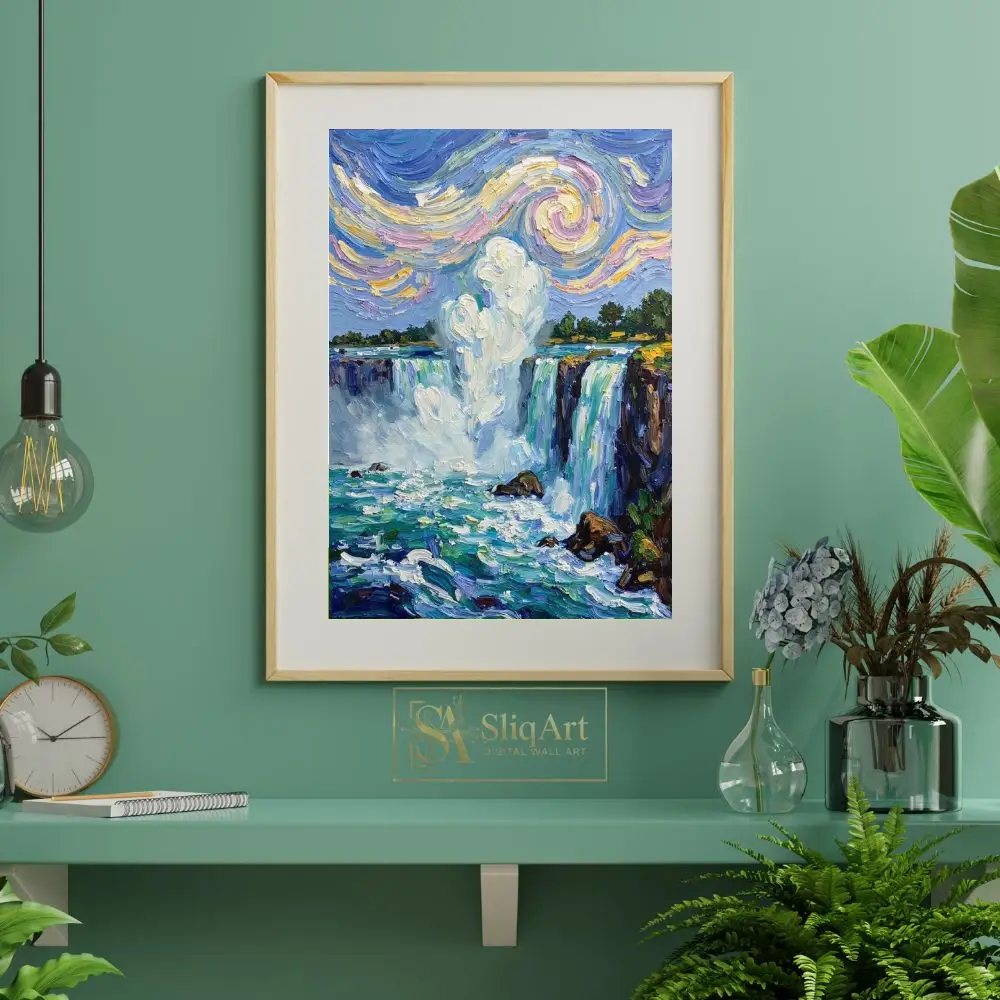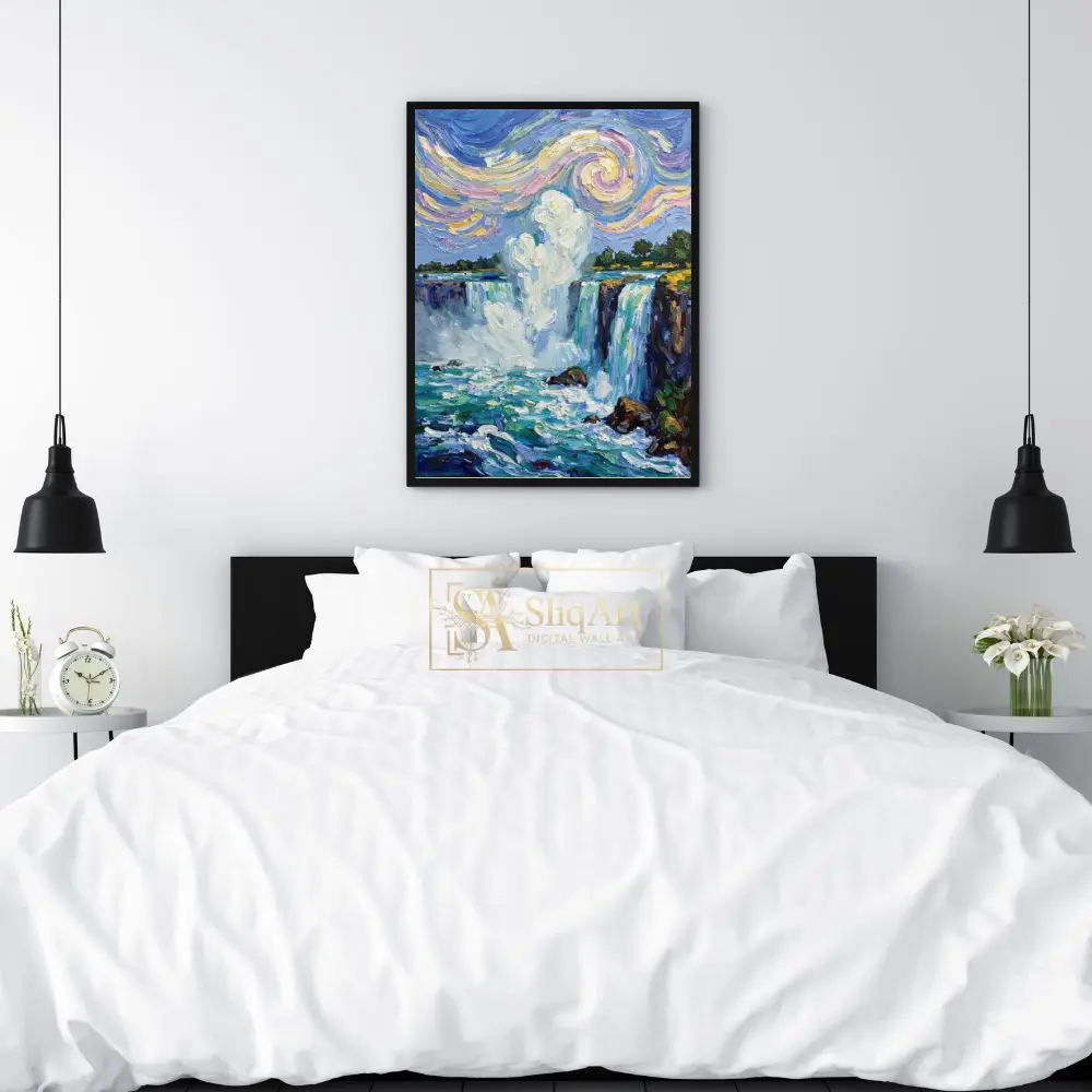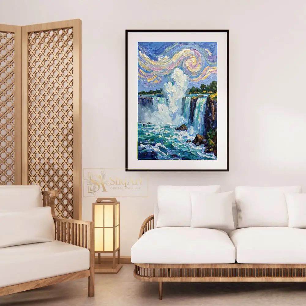 This breathtaking wall art piece captures the majestic power of a cascading waterfall through a lens of Post-Impressionist masterwork. Utilizing thick, textured impasto brushstrokes that echo the style of Van Gogh, the painting features a dynamic sky filled with swirling patterns of pastel yellow, soft pink, and deep blue.