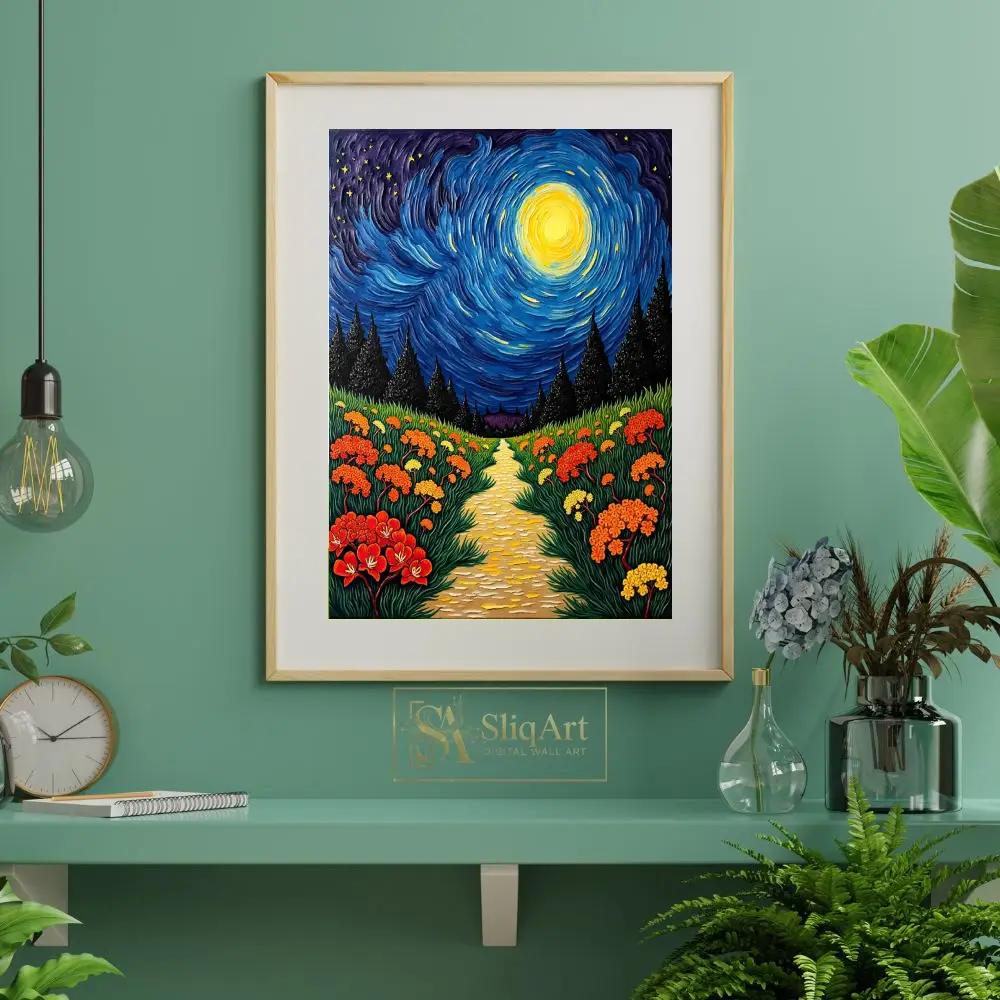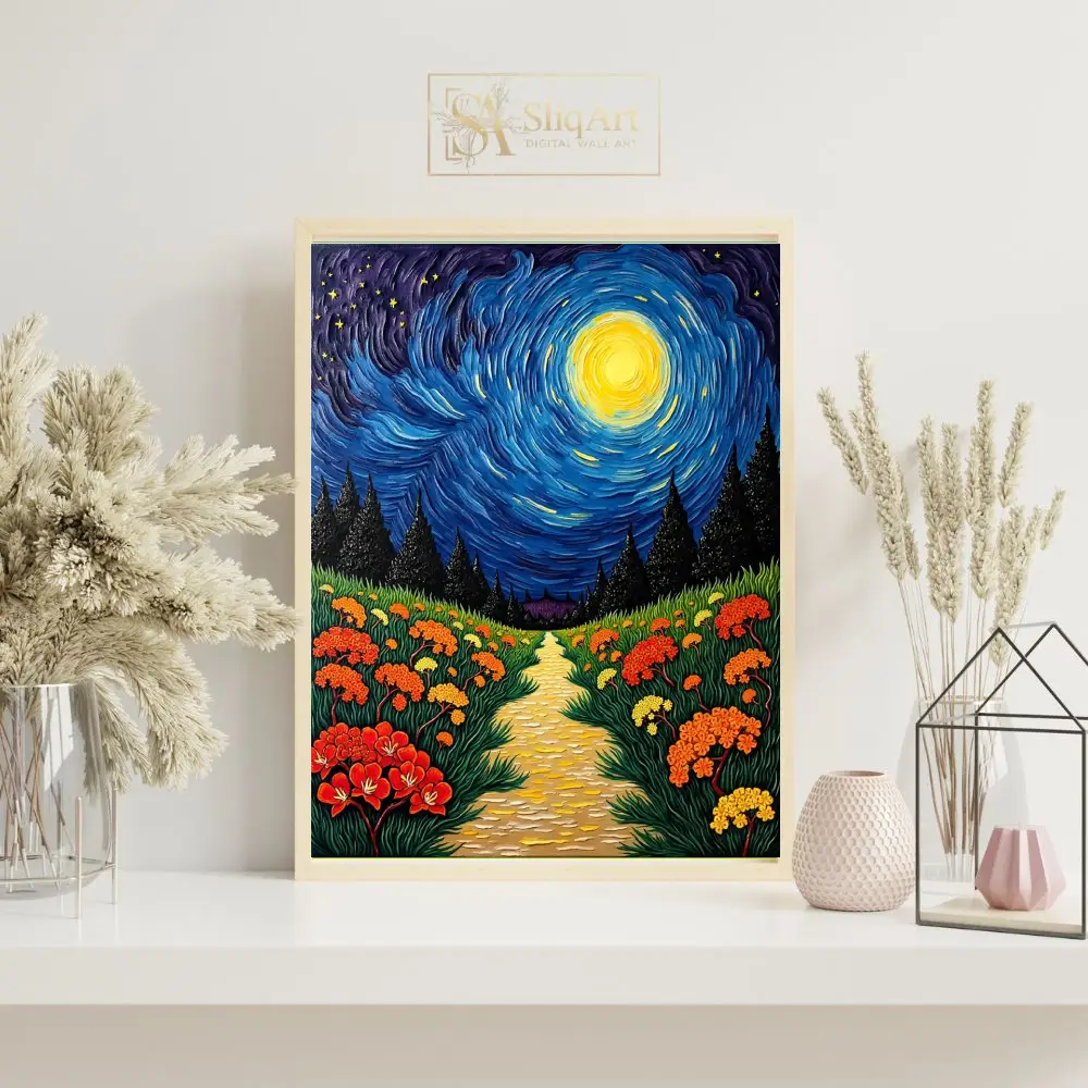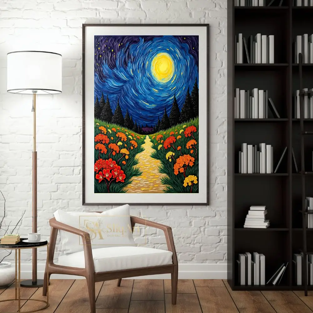 Transform your space with this stunning post-impressionist landscape, featuring a vibrant, swirling night sky inspired by classic celestial masterpieces. The artwork depicts a textured golden path that winds through a lush field of orange and yellow wildflowers, leading toward a dark forest of silhouetted evergreens.