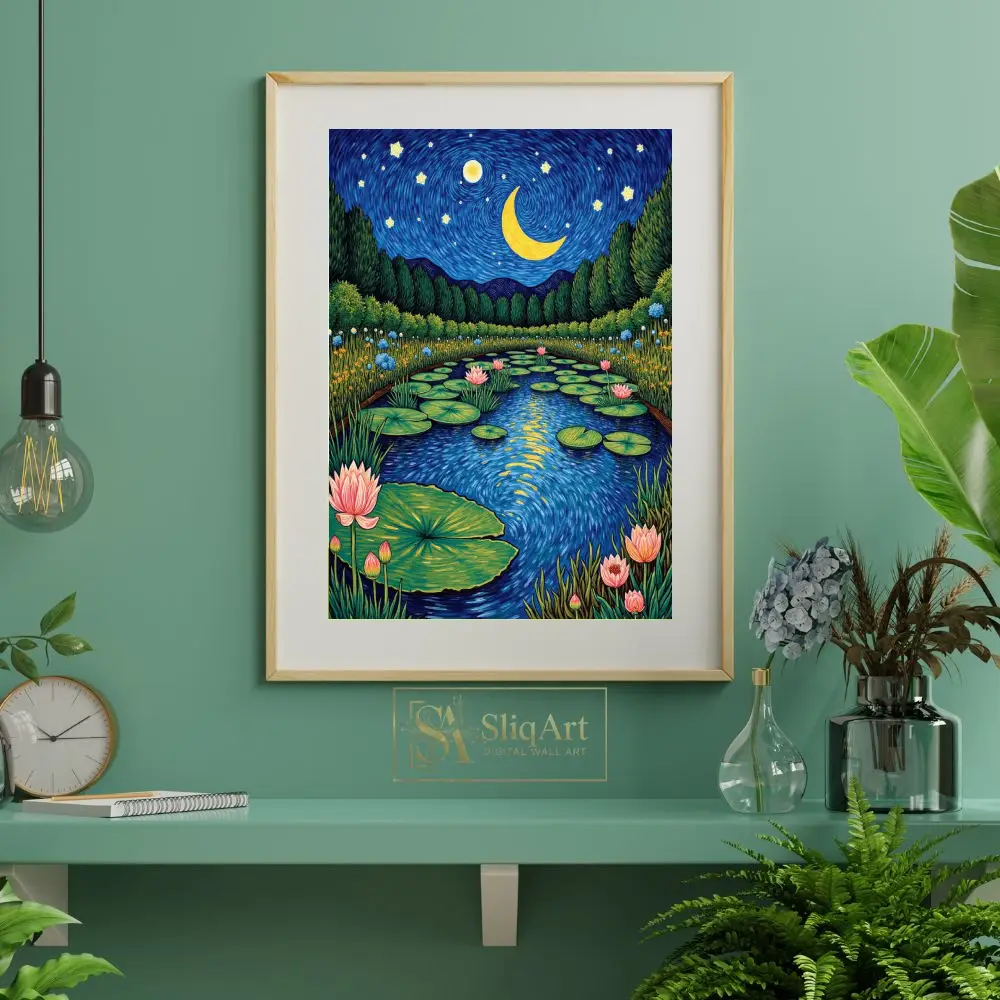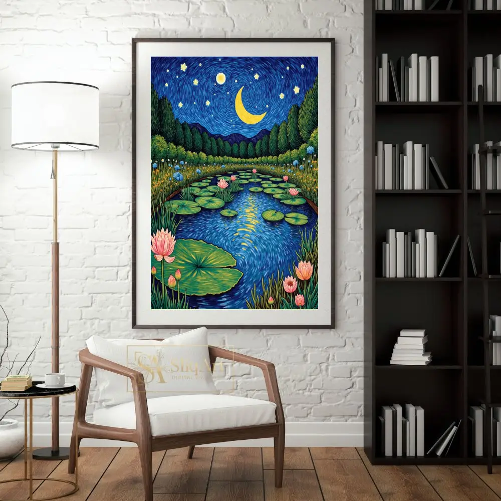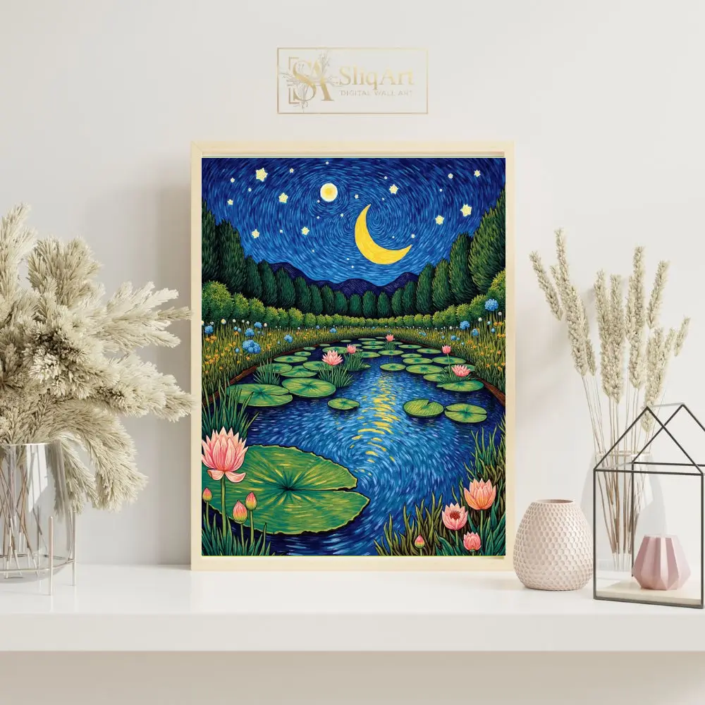 A captivating fusion of iconic Impressionist styles, featuring a moonlit lily pond beneath a vibrant, swirling starry sky. Perfect for bringing tranquility and artistic flair to your space.