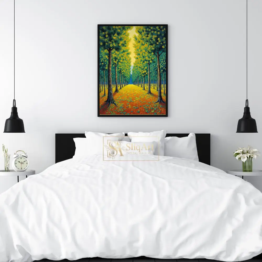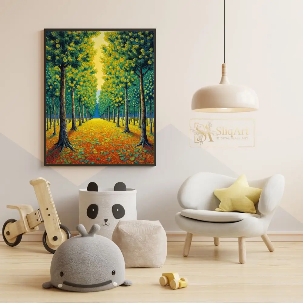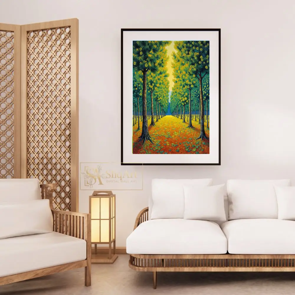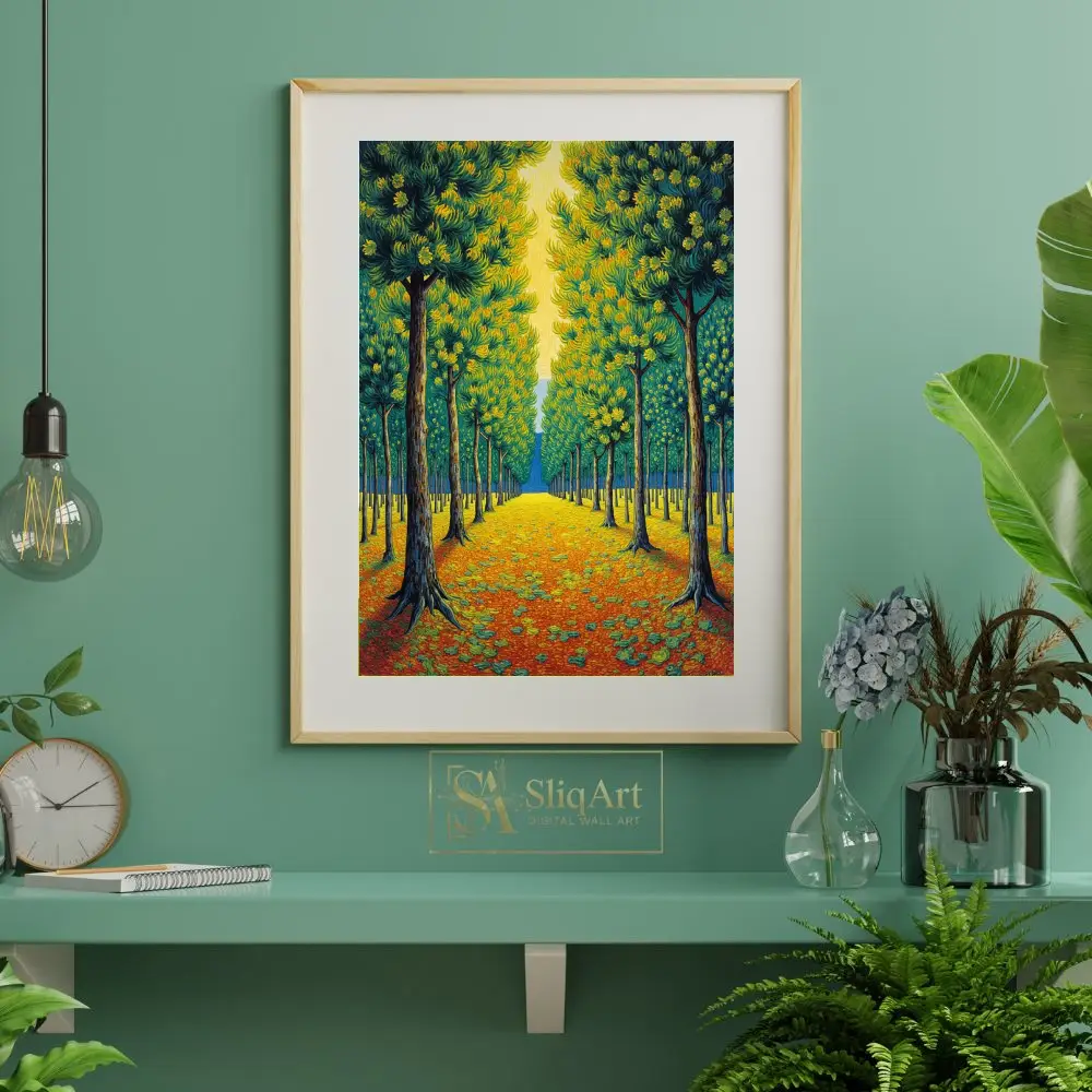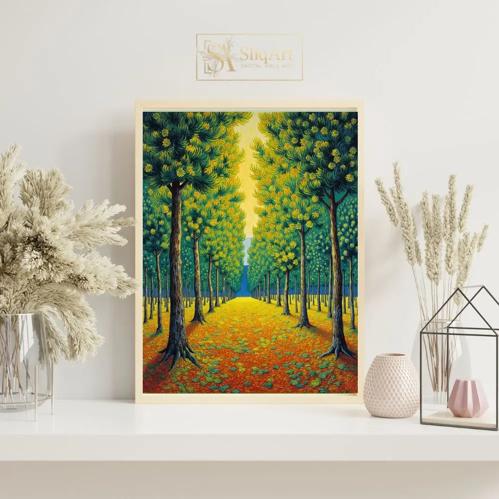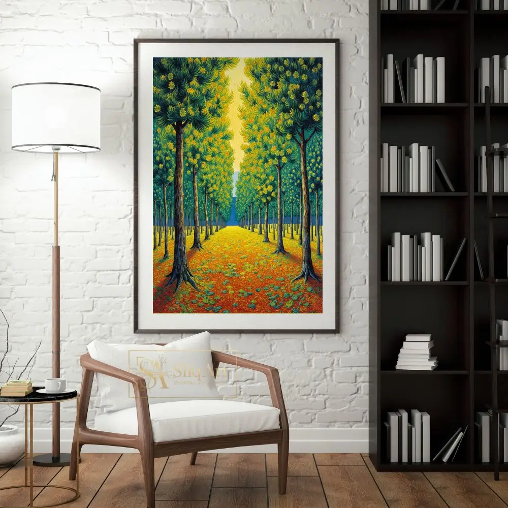 Transform your home with this captivating Post-Impressionist landscape, featuring a rhythmic avenue of stylized trees. Drawing inspiration from the thick, expressive brushwork of masters like Van Gogh, this piece captures a sun-drenched forest path in vibrant detail.