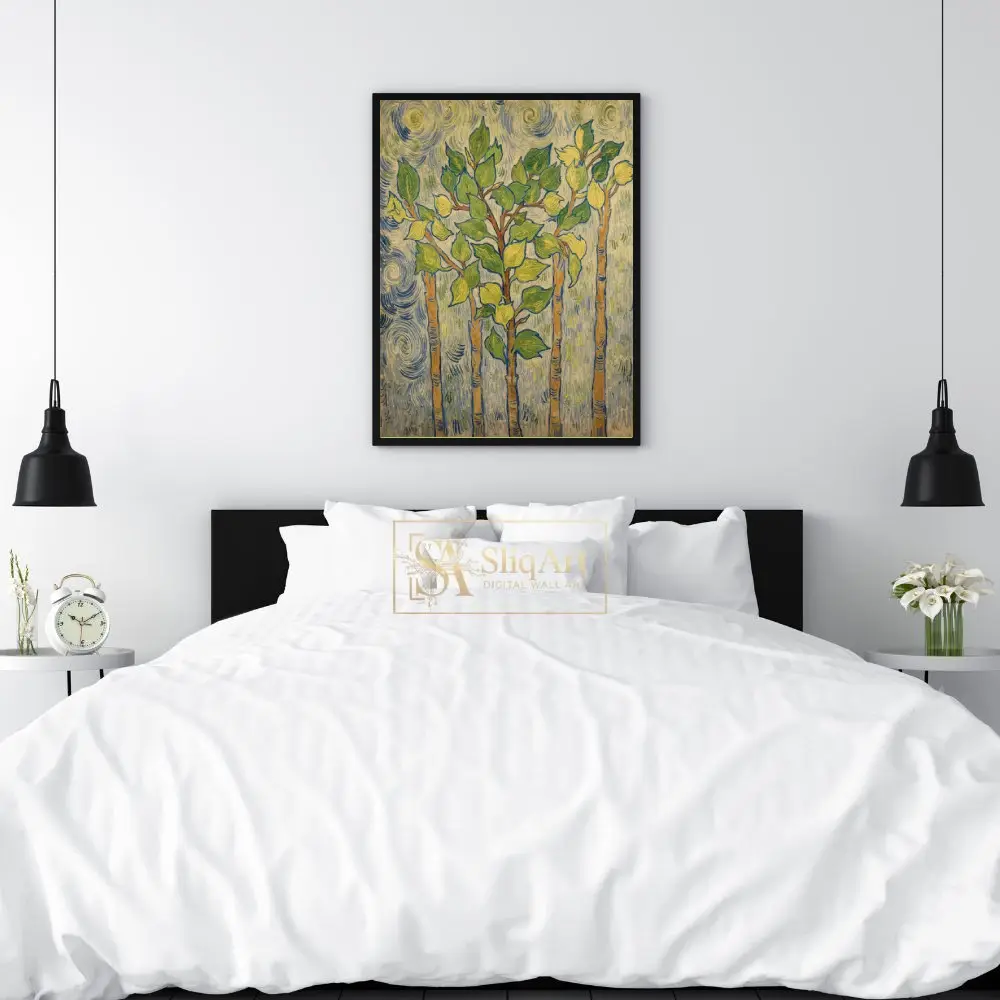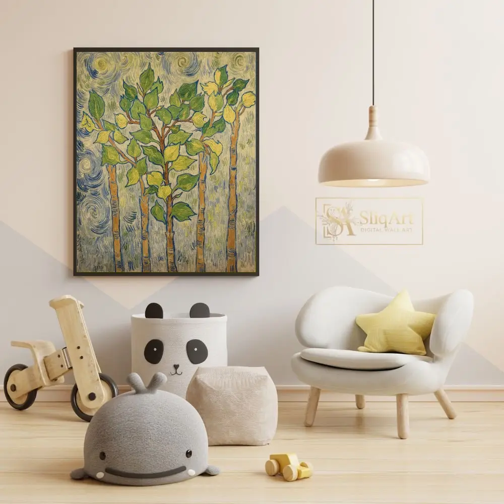 The thick, expressive brushstrokes and bold use of color—vibrant greens, golden yellows, and deep blues—create a sense of movement and life that will transform any space. This piece serves as a timeless tribute to the beauty of nature and the power of emotional expression through art.