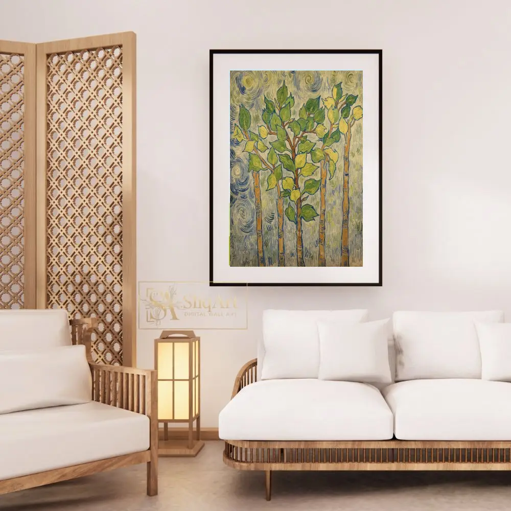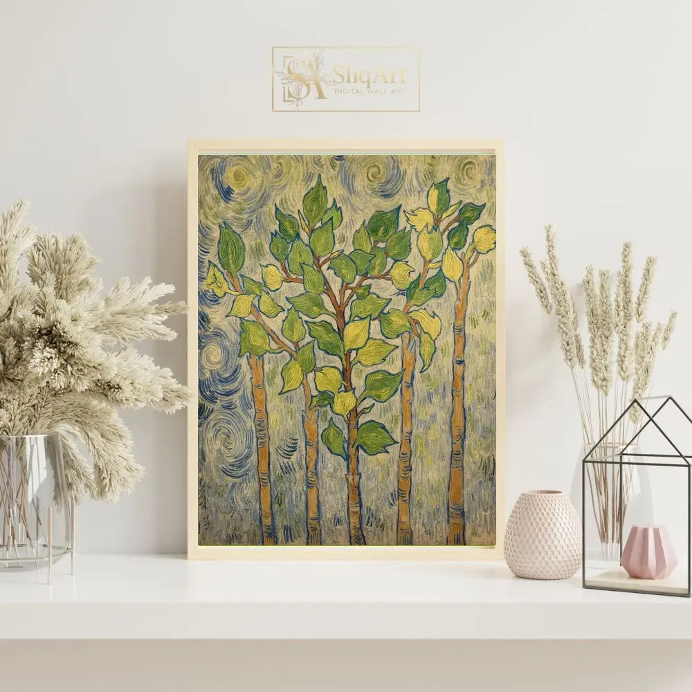Experience the vibrant energy of the countryside with this stunning post-impressionist masterpiece. Featuring slender poplar trees reaching toward a swirling, rhythmic sky, this artwork captures the essence of Vincent van Gogh’s iconic style.