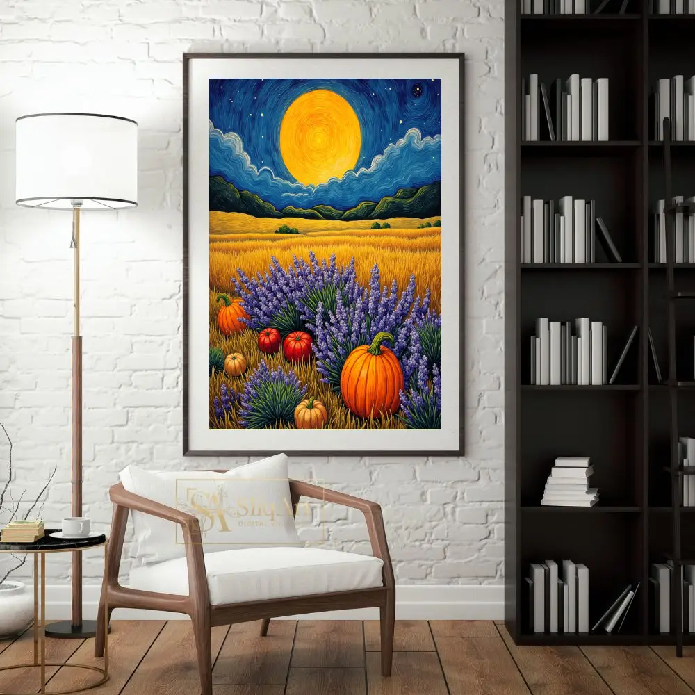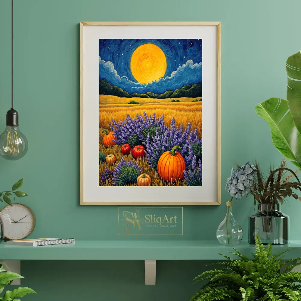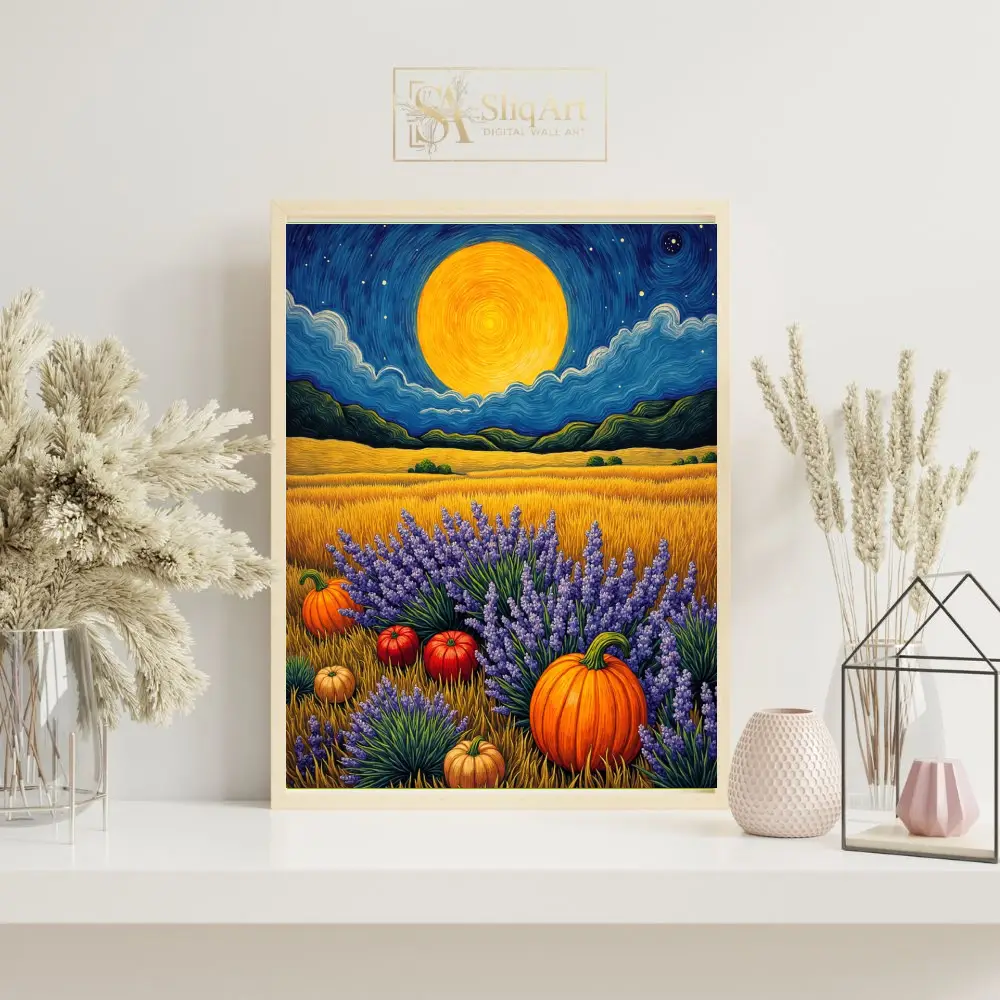 In the foreground, vibrant orange pumpkins nestled among lush purple lavender bushes create a striking contrast of colors. The rhythmic brushstrokes and rich textures evoke a sense of peace and seasonal wonder, making it a perfect centerpiece for nature lovers.