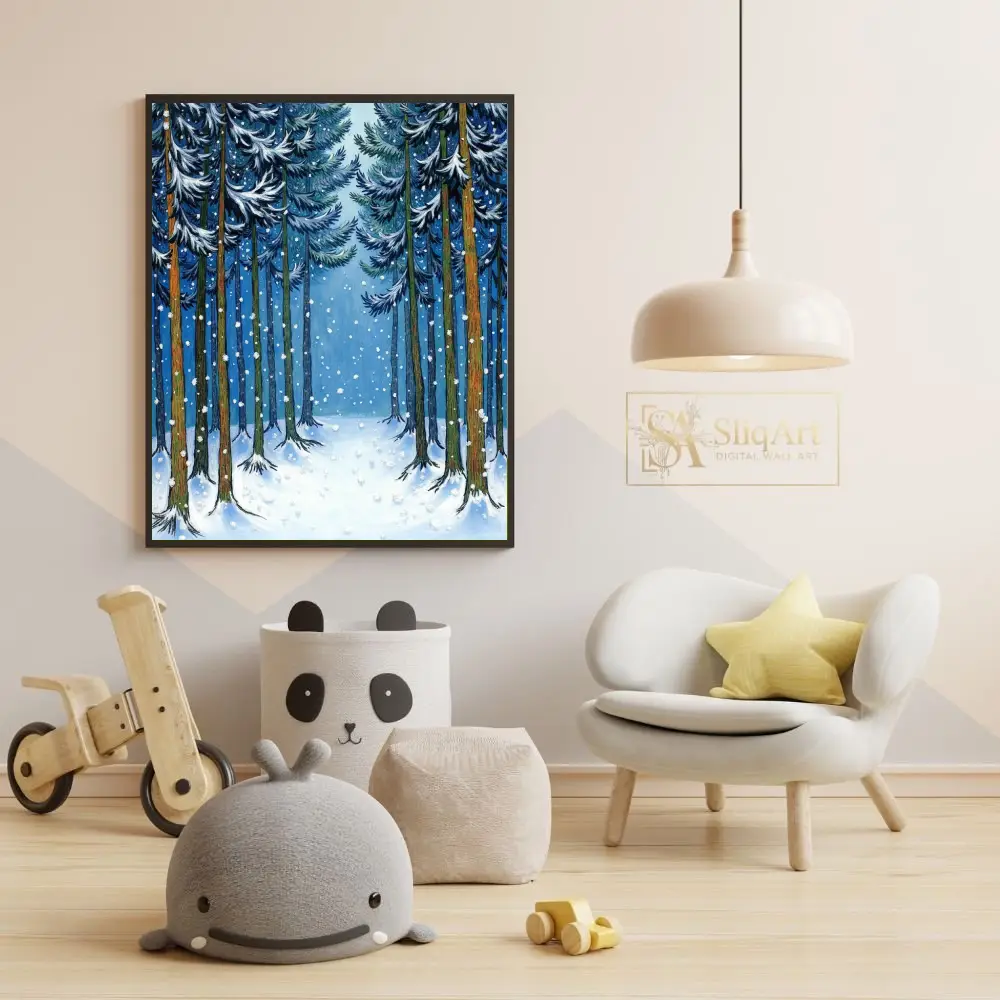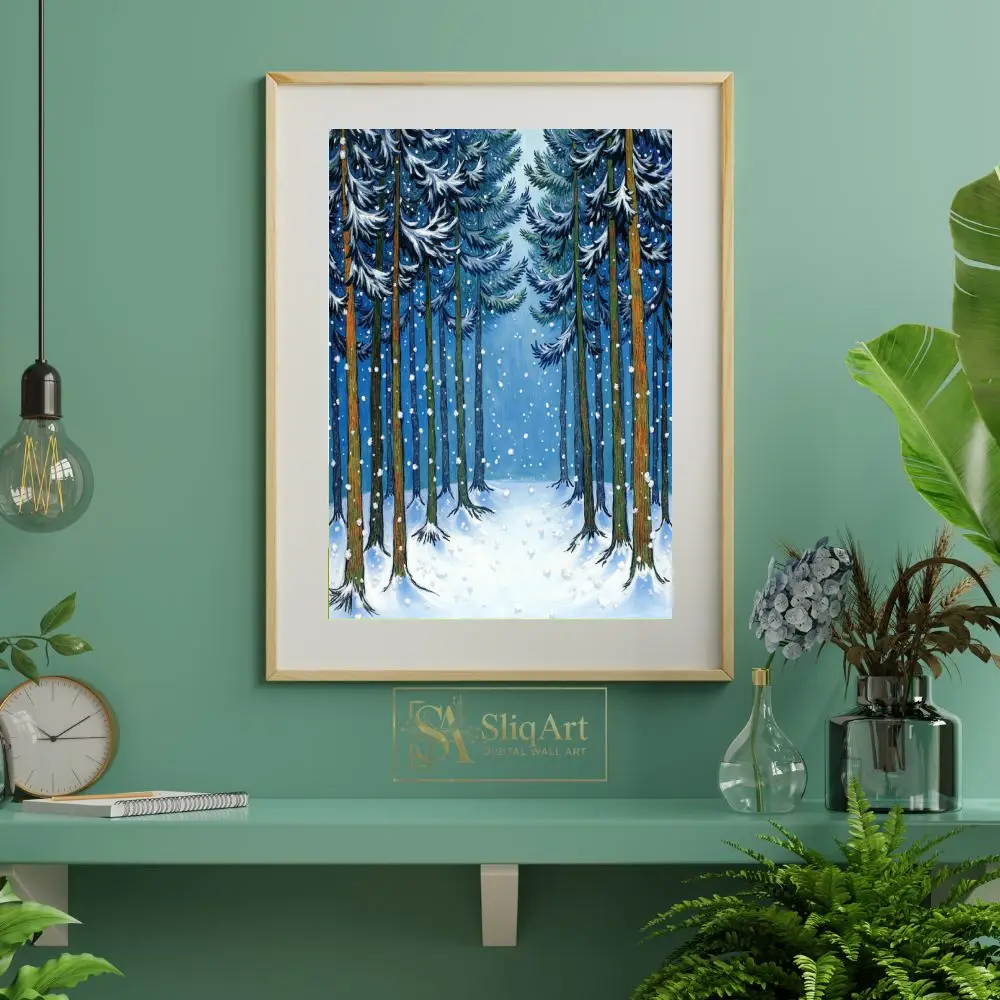 Experience the quiet tranquility of a snowy woodland with this enchanting evergreen forest illustration. The artwork features towering, slender pine trees laden with fresh snow, set against a calming blue sky as large, whimsical snowflakes gently fall.