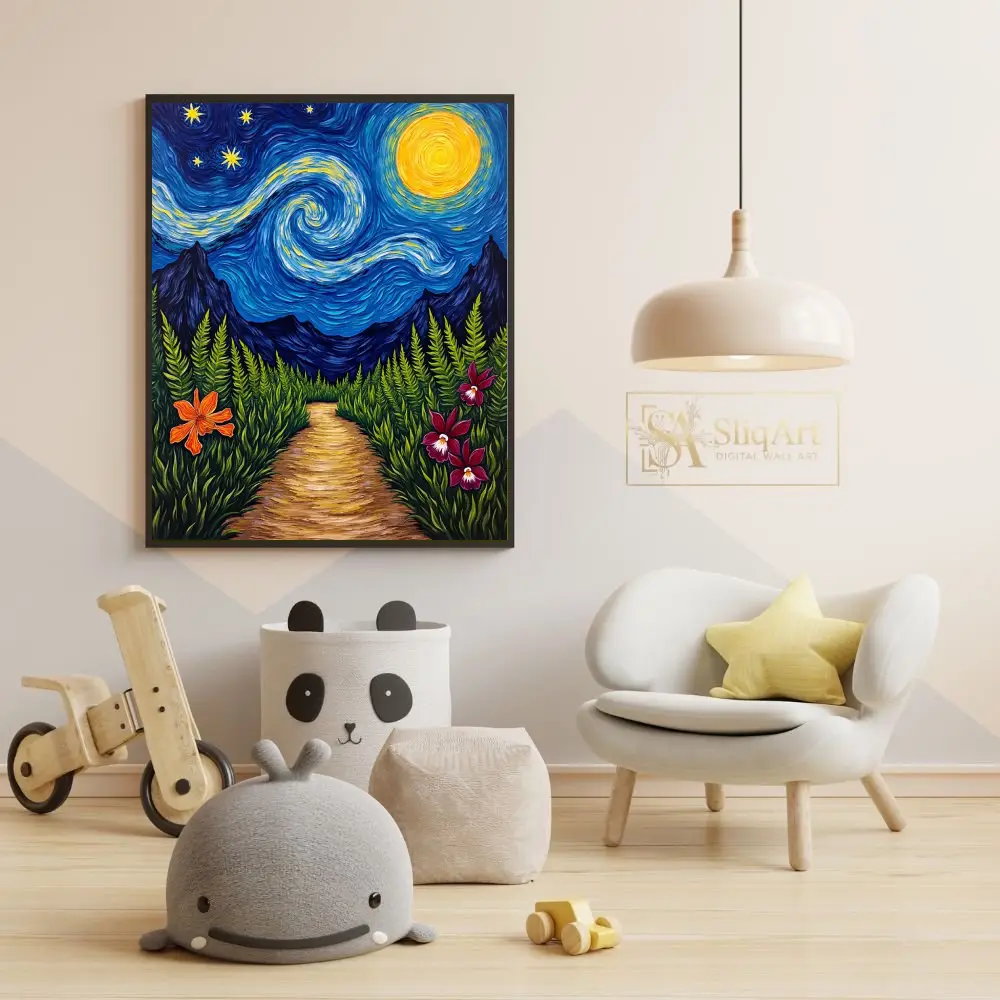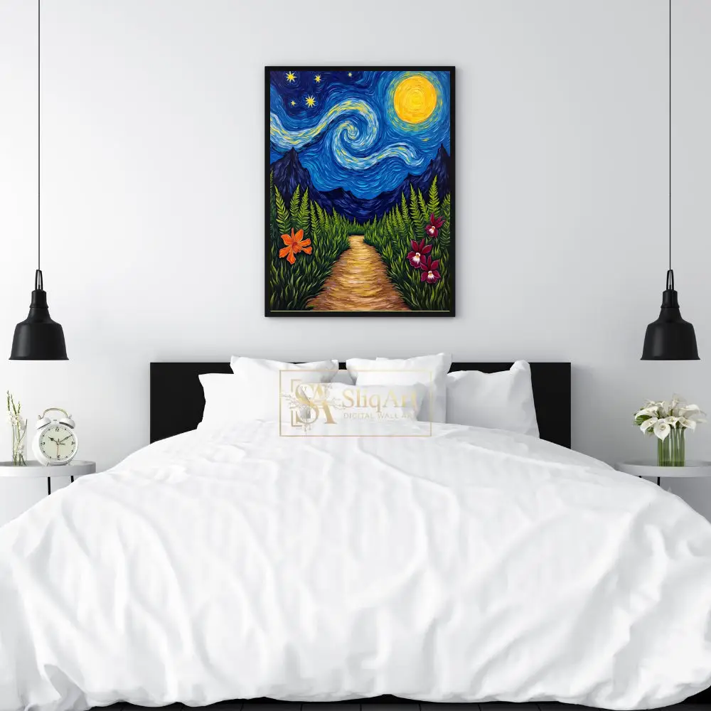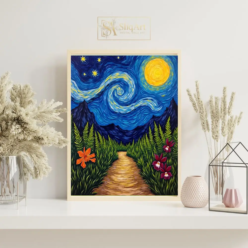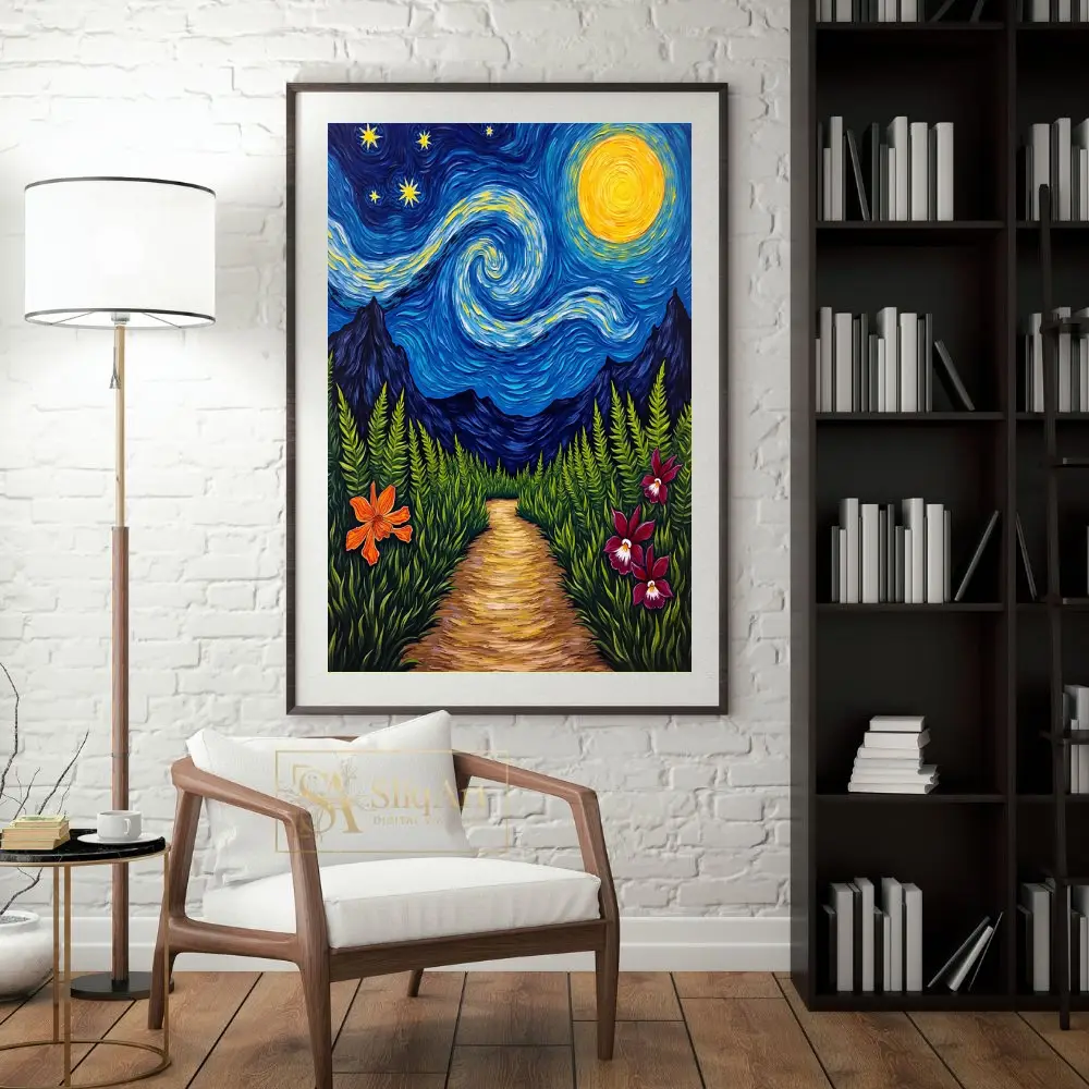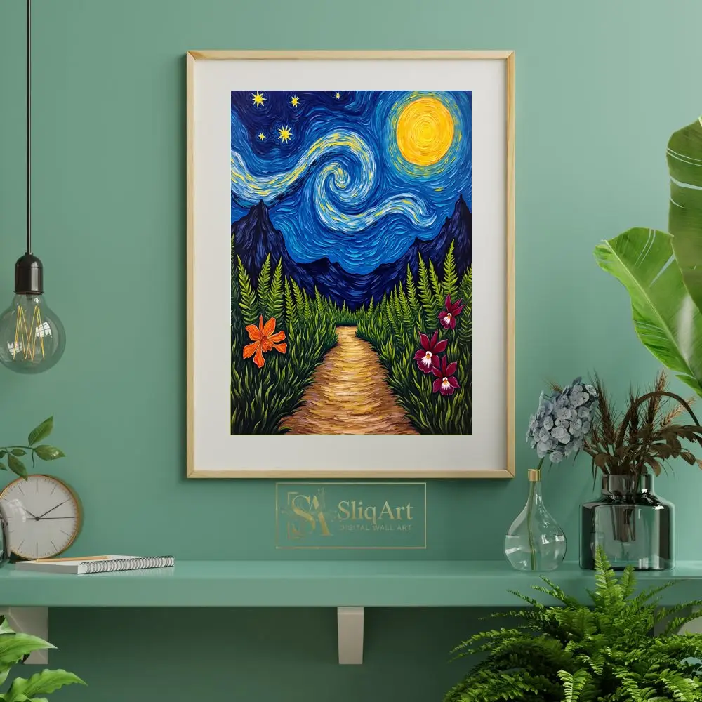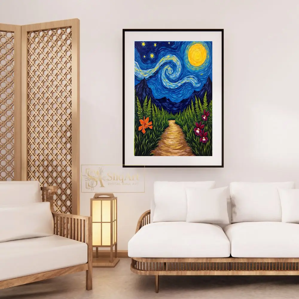 Experience a captivating fusion of classic impressionism and tropical wonder with this stunning night landscape. Inspired by the rhythmic swirls of Van Gogh, the piece features a mesmerizing celestial sky where a glowing golden moon and radiant stars dance above the silhouette of distant mountain peaks. The foreground invites you onto a sun-dappled path winding through a lush thicket of ferns, accented by vibrant orange and magenta orchids that pop against the deep greenery.