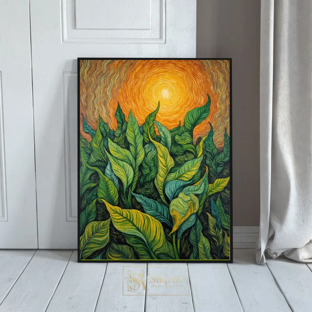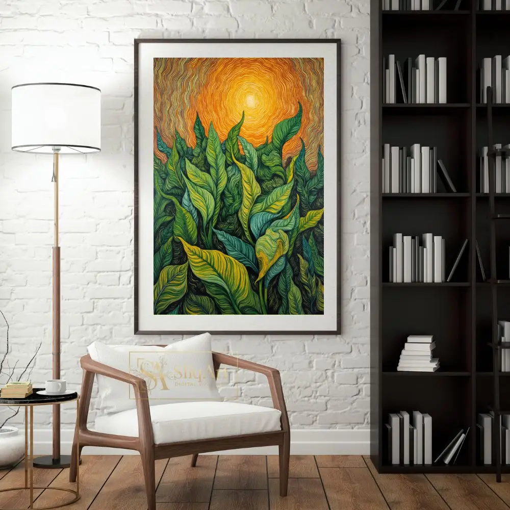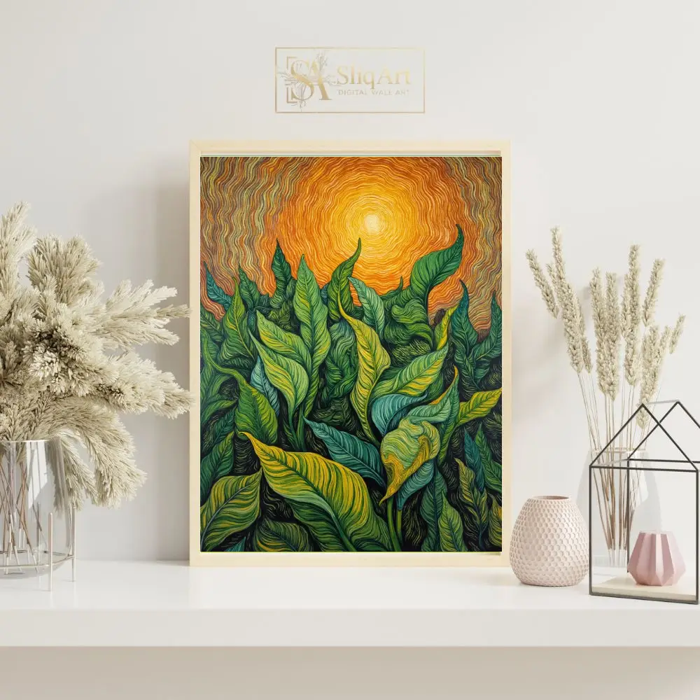 This stunning piece captures the vibrant energy of nature through rhythmic linework and a bold color palette. Thick, verdant leaves reach upward toward a swirling sun, rendered in mesmerizing shades of amber and gold.
