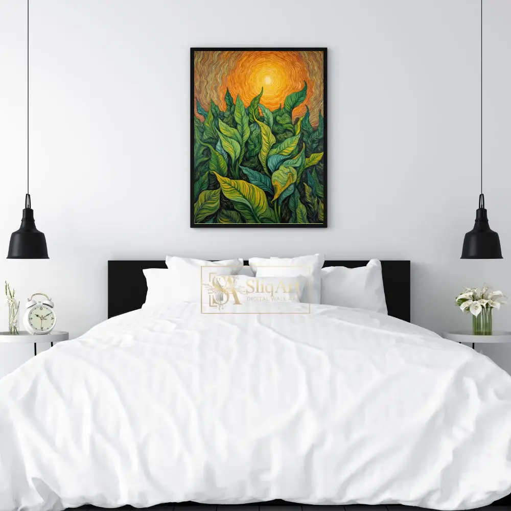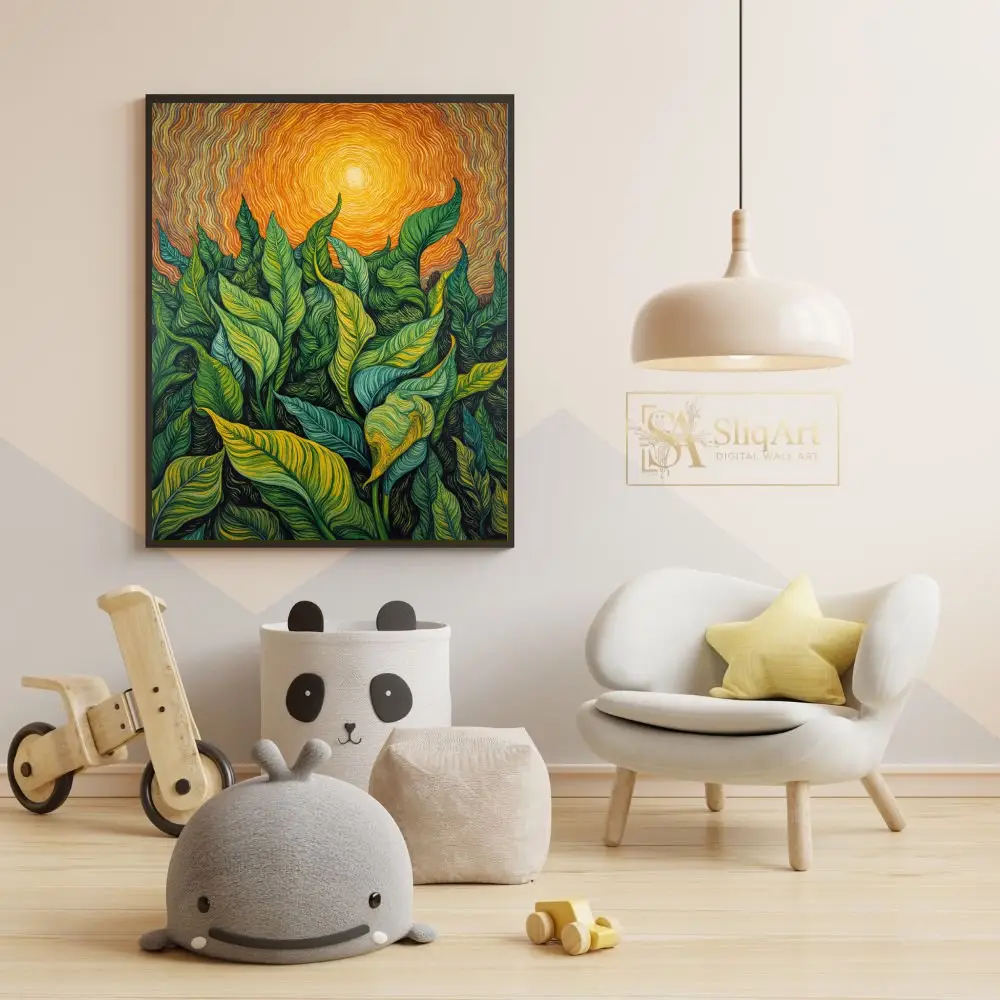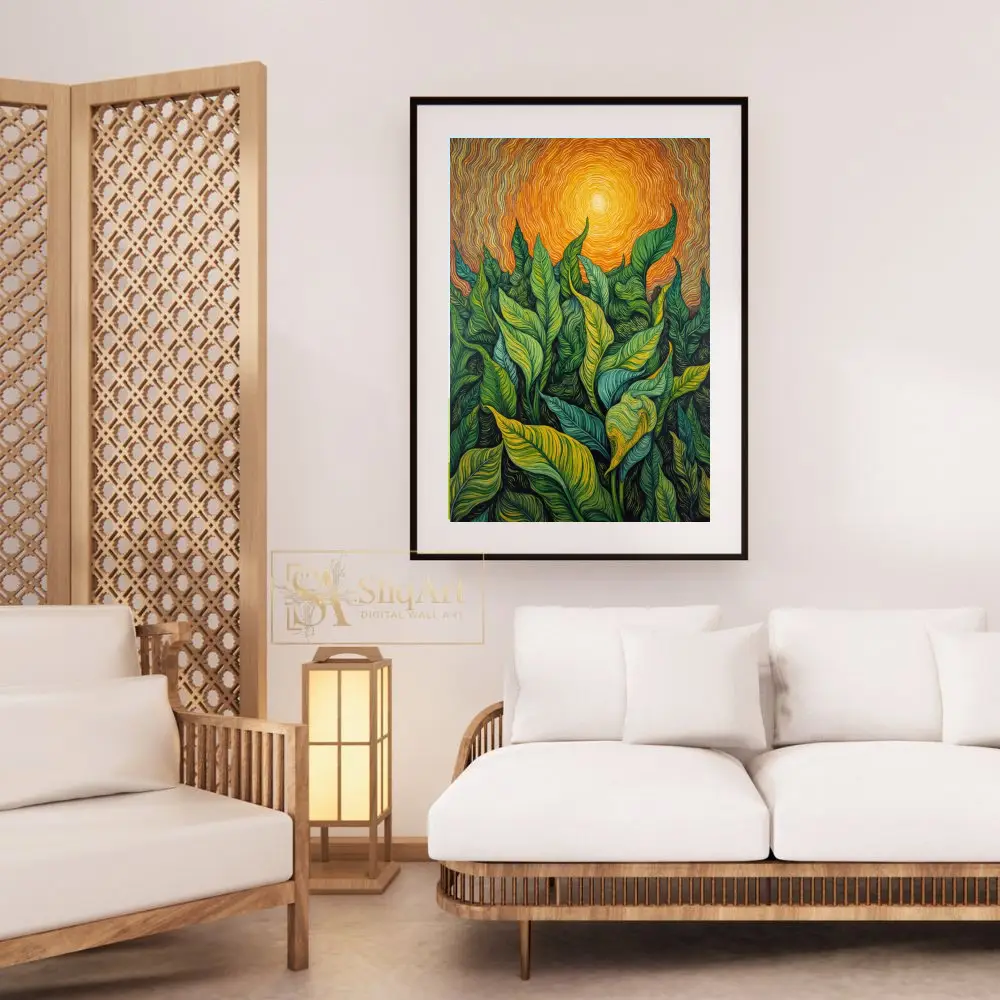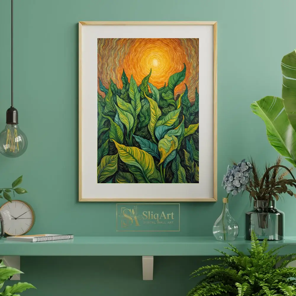 This stunning piece captures the vibrant energy of nature through rhythmic linework and a bold color palette. Thick, verdant leaves reach upward toward a swirling sun, rendered in mesmerizing shades of amber and gold.