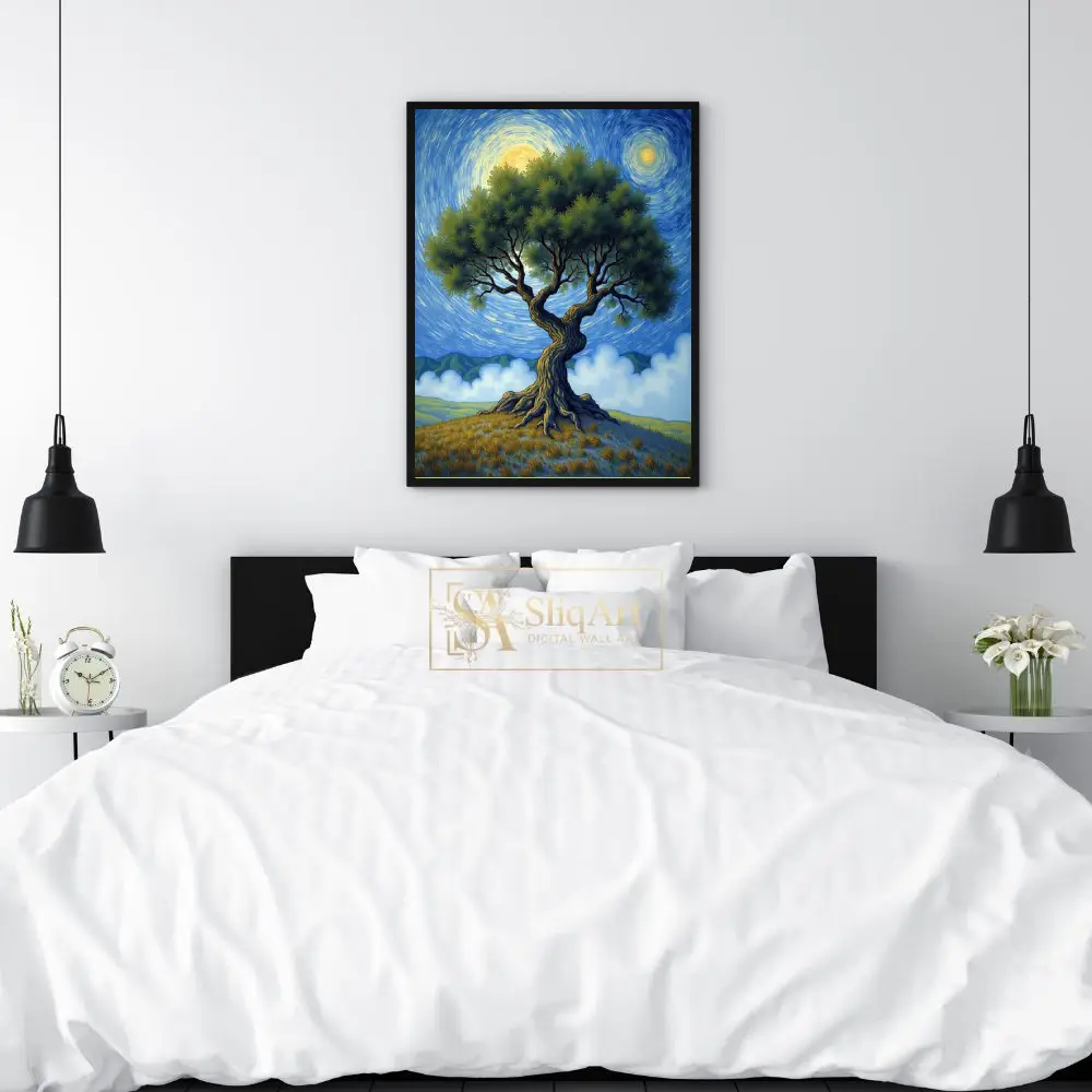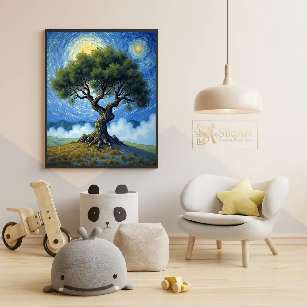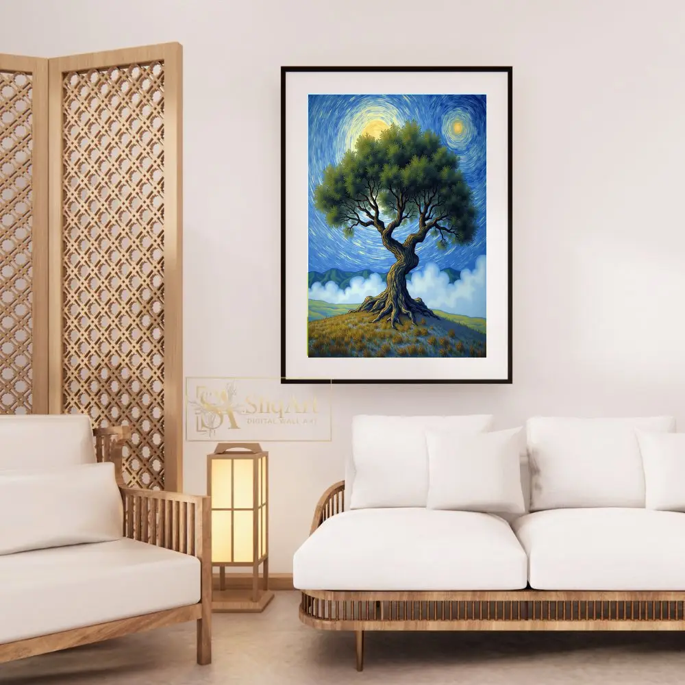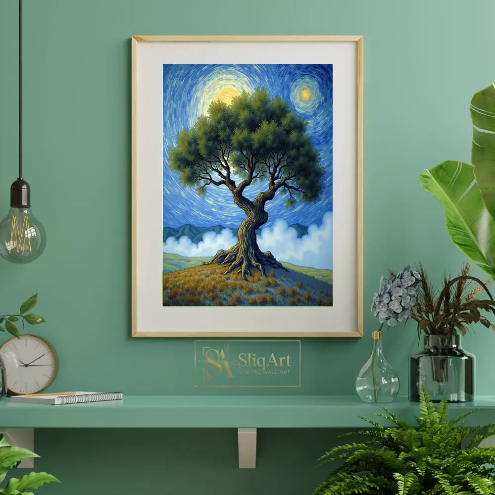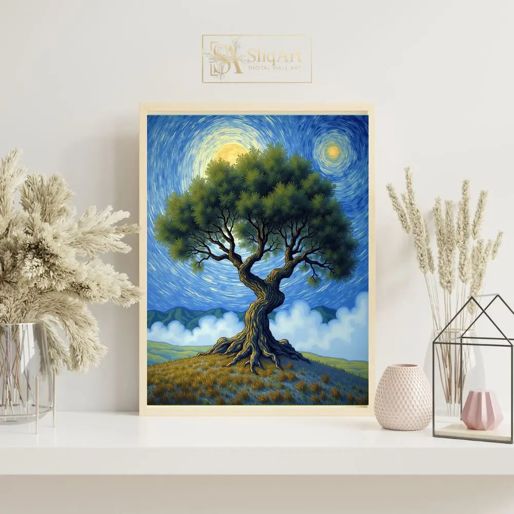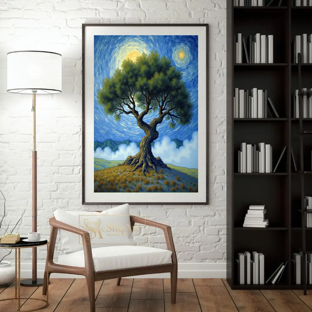 Immerse yourself in a world of rhythmic movement and natural grandeur with this striking post-impressionist landscape. At the center of the composition stands a majestic, gnarled tree, its thick, textured trunk and sprawling green canopy evoking a sense of ancient wisdom.