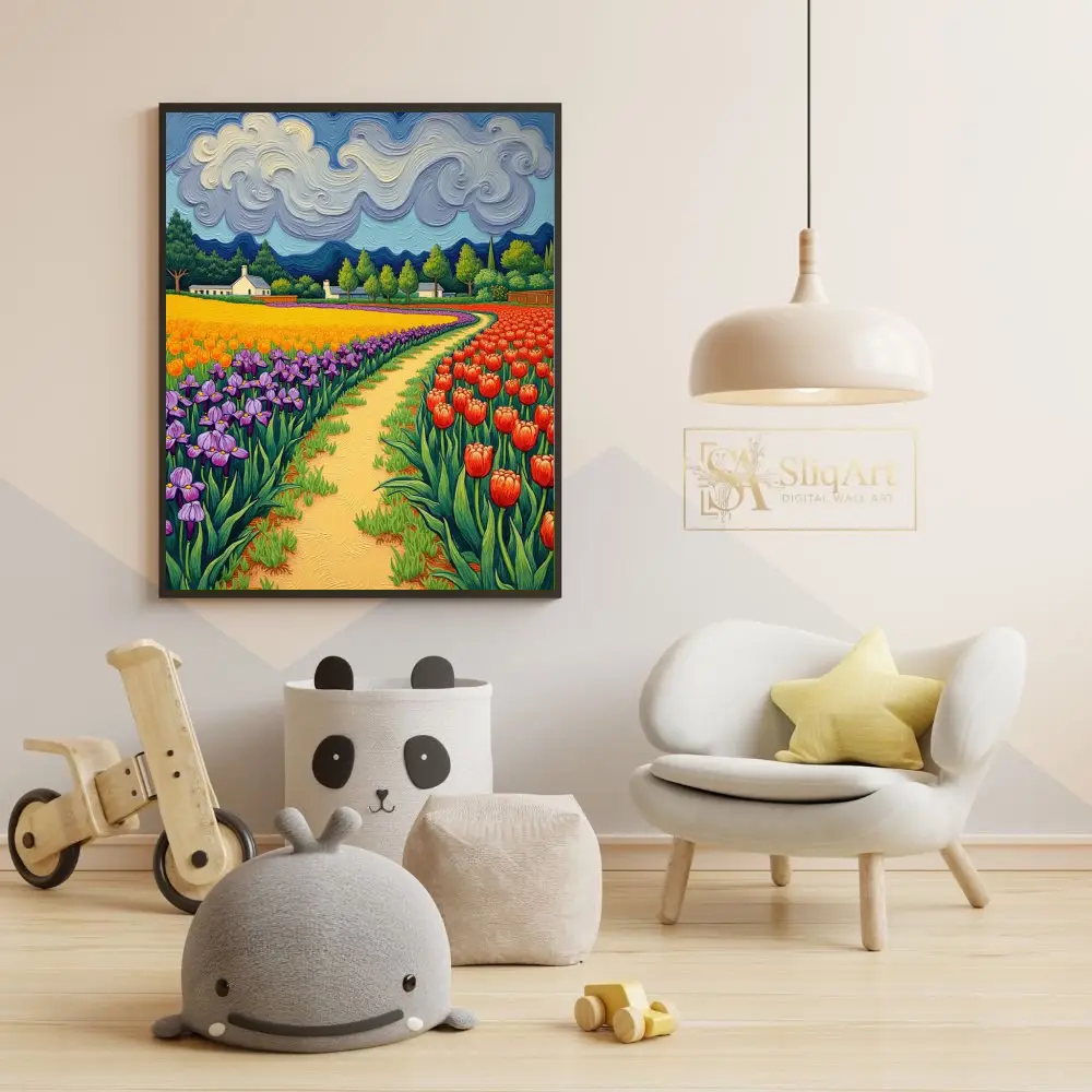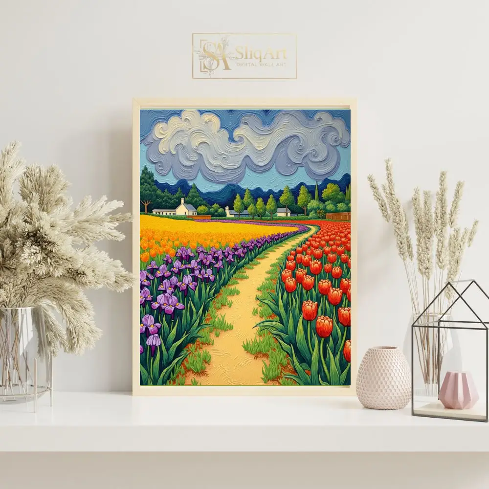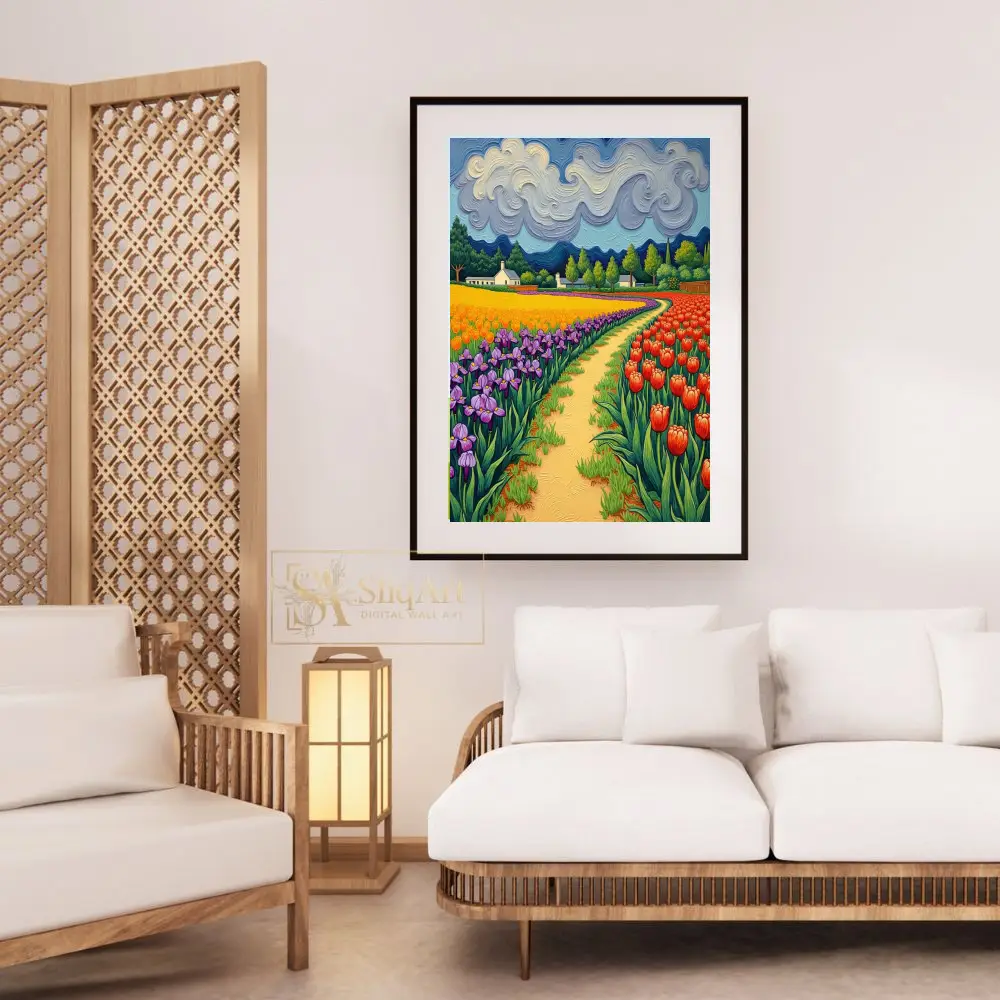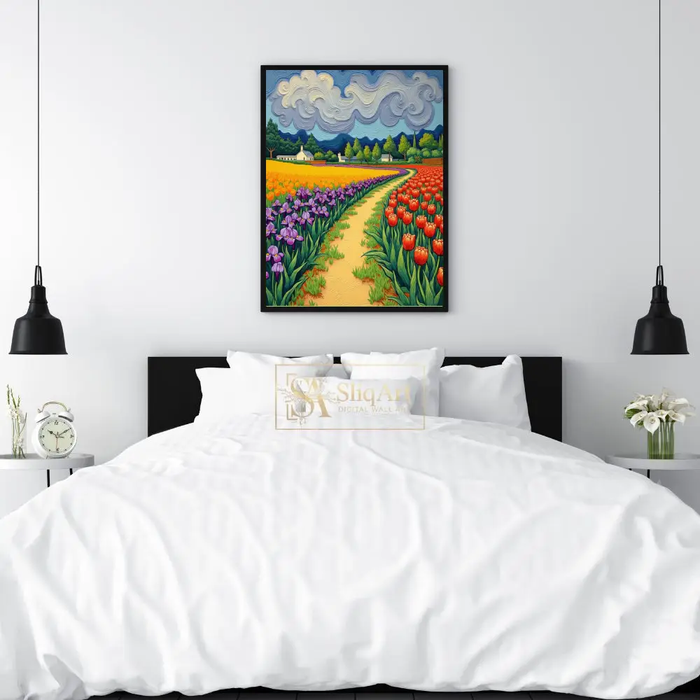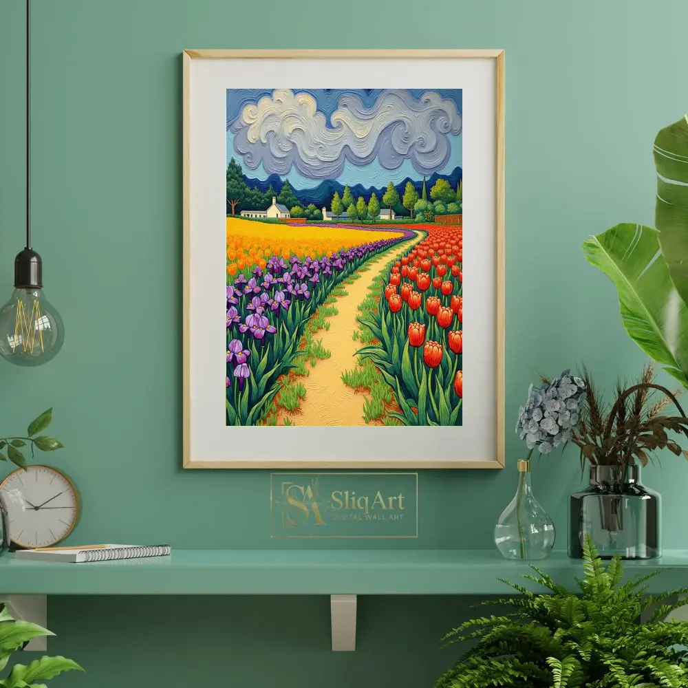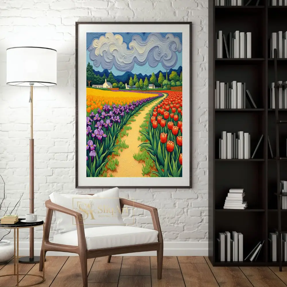 Immerse yourself in a symphony of color with this stunning expressionist landscape. Inspired by post-impressionist masters, this piece features a winding golden path that draws the viewer through lush rows of vibrant purple irises, sun-drenched yellow blooms, and fiery red tulips.