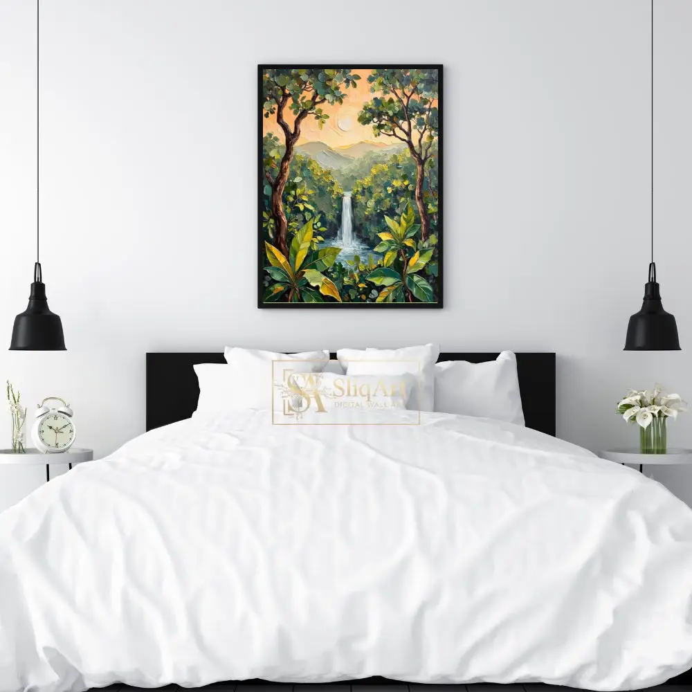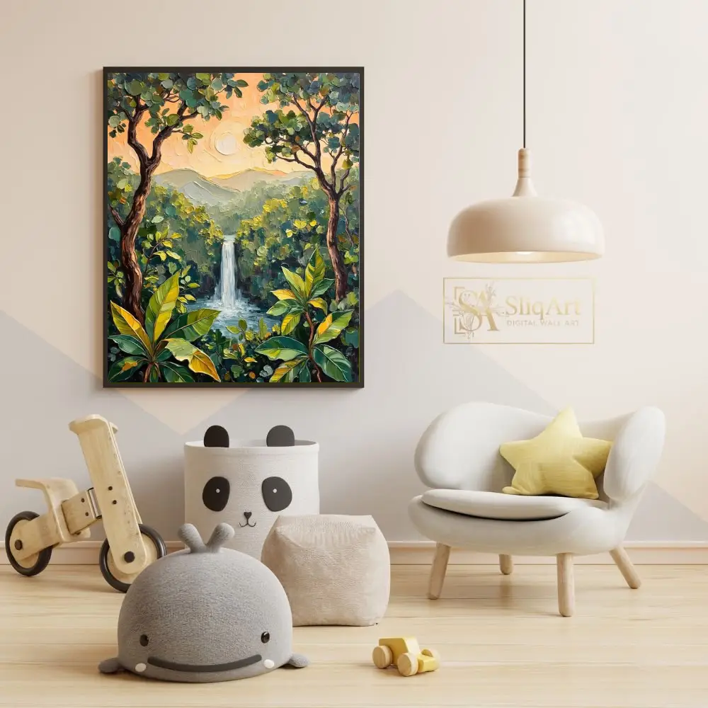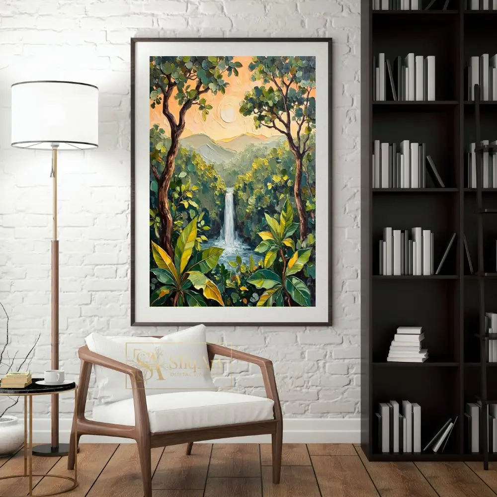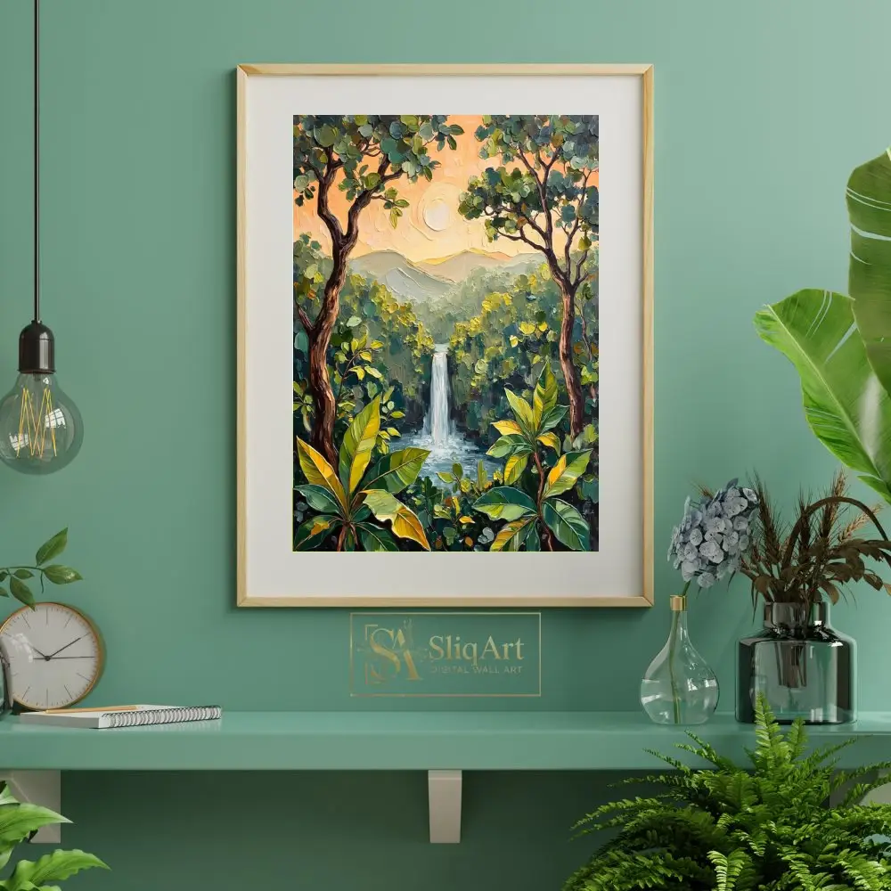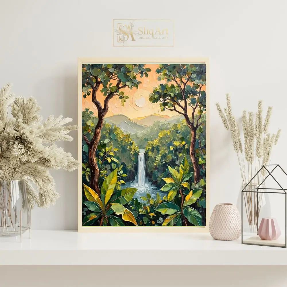 The heavy texture created by thick, expressive brushstrokes brings a tactile dimension to the scene, highlighting the movement of the water and the richness of the greenery. Bathed in the soft, warm glow of a peach-colored sunset, the distant mountains provide a serene backdrop to this vibrant jungle oasis. This piece is perfect for those looking to bring an organic, energetic, yet peaceful atmosphere into their modern home.