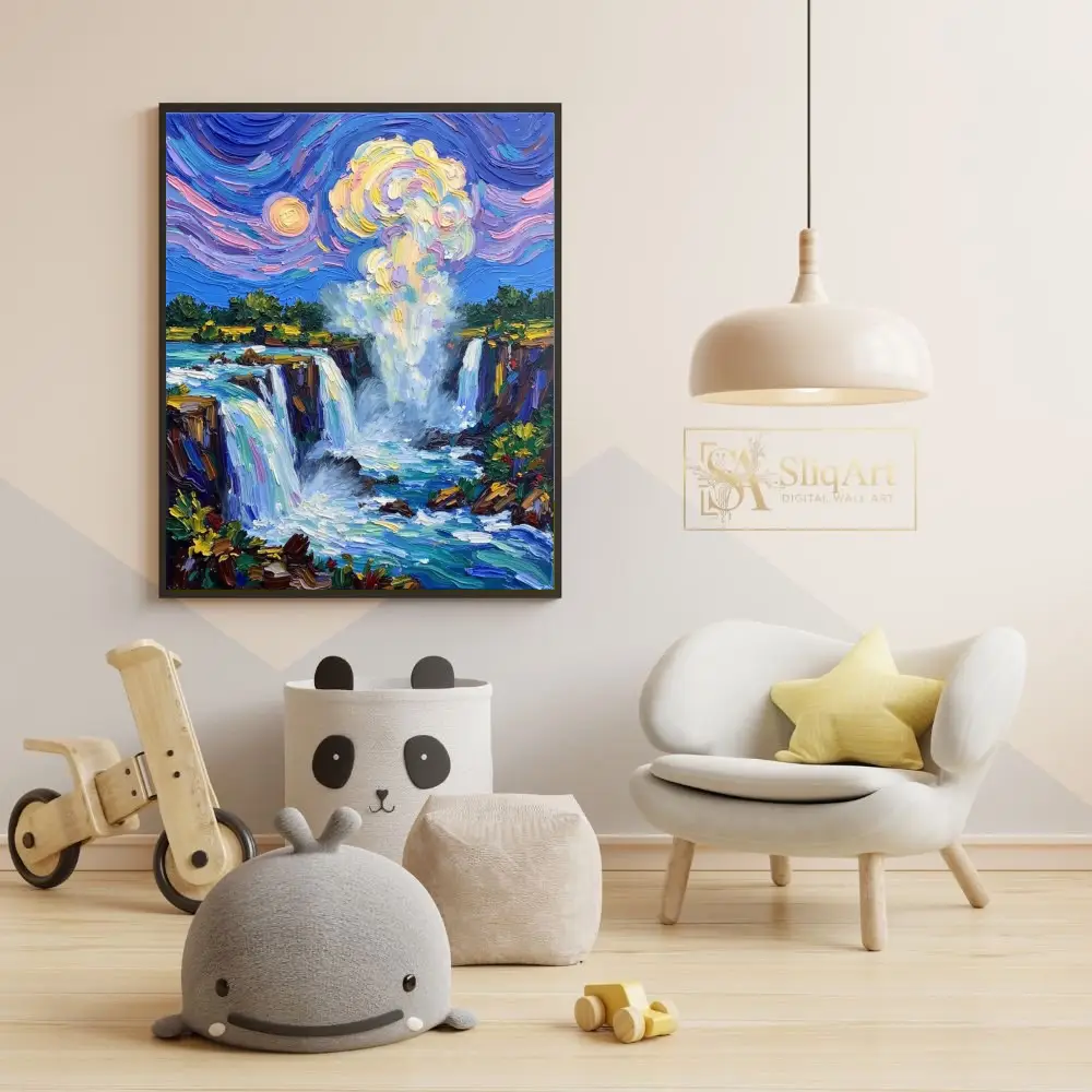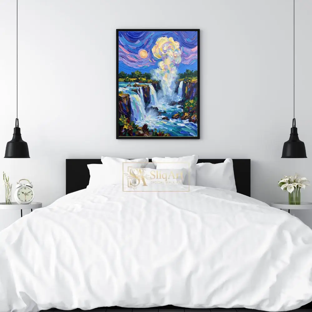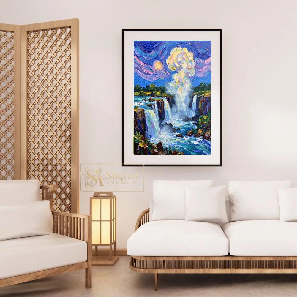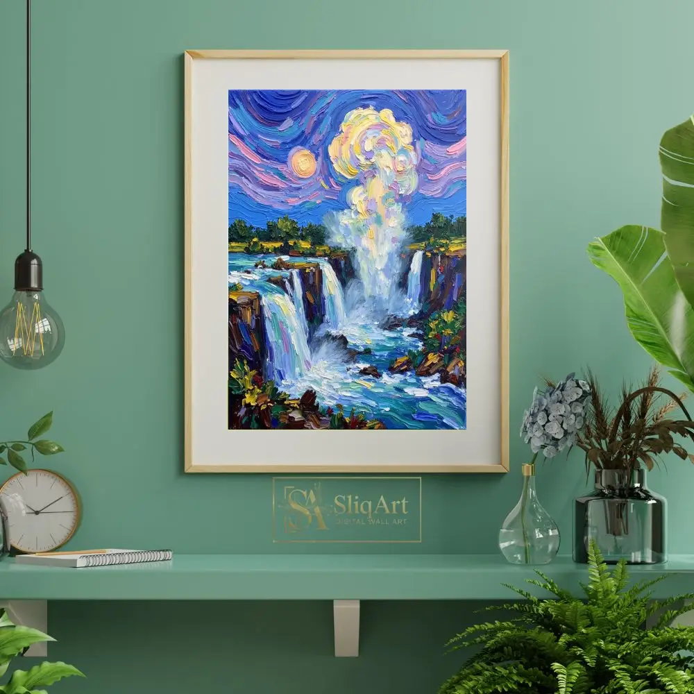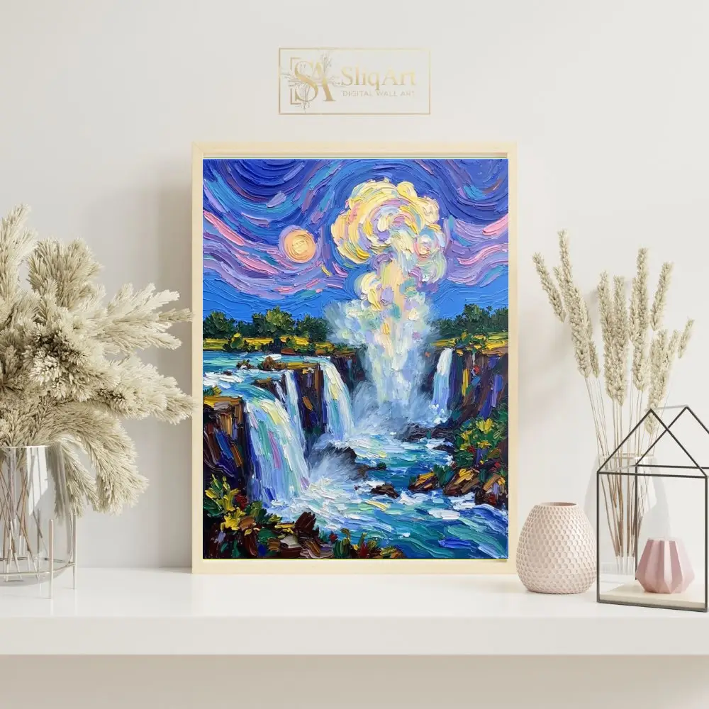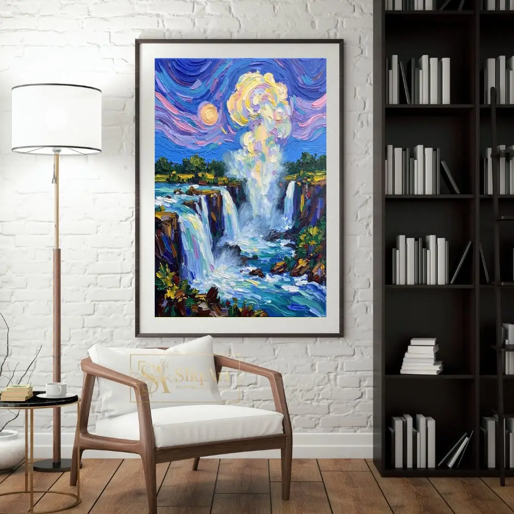 Experience the raw energy and ethereal beauty of nature with this stunning impressionist waterfall painting. Crafted with a bold impasto technique, the artwork features thick, expressive brushstrokes that give life to the cascading water and the mist rising into a swirling sky.