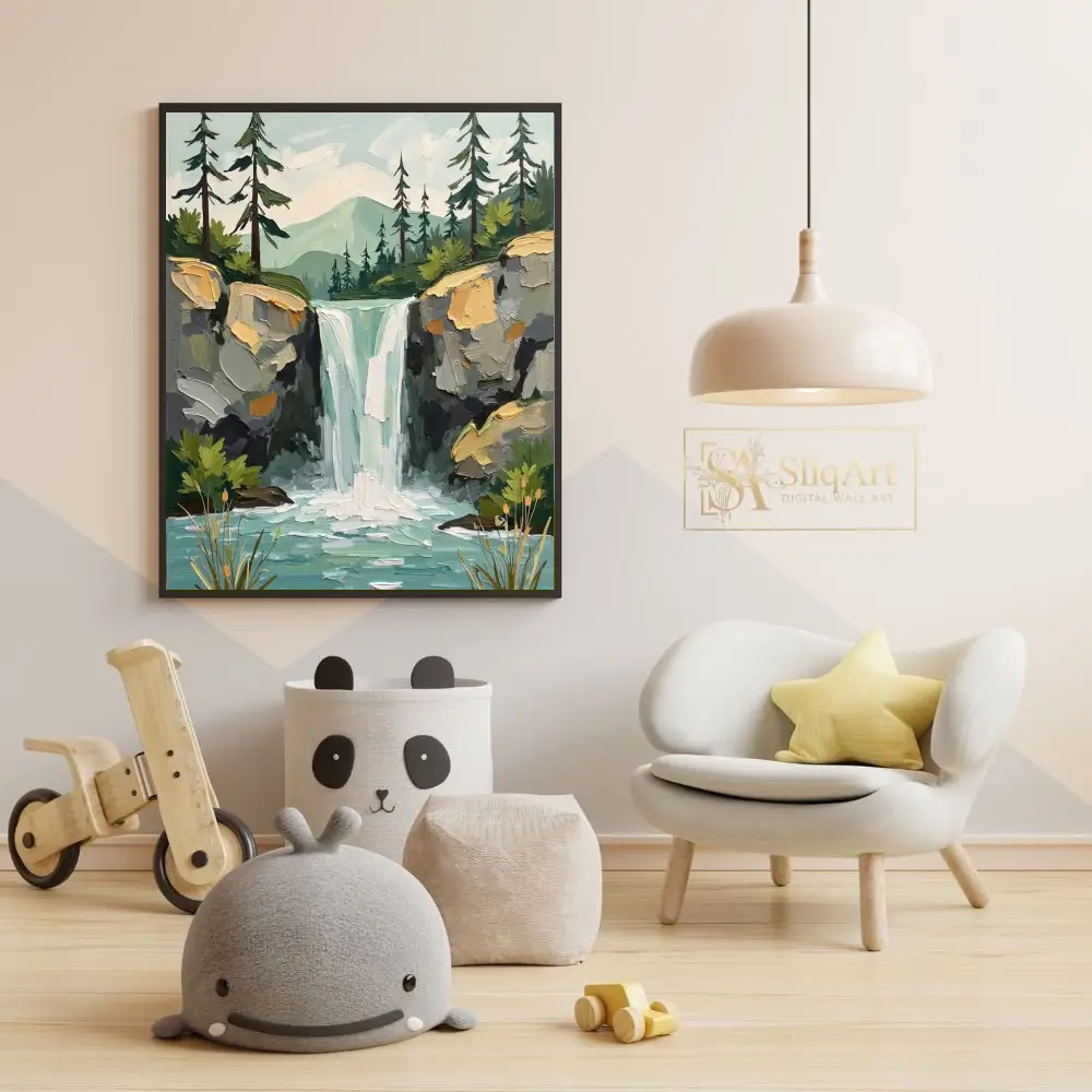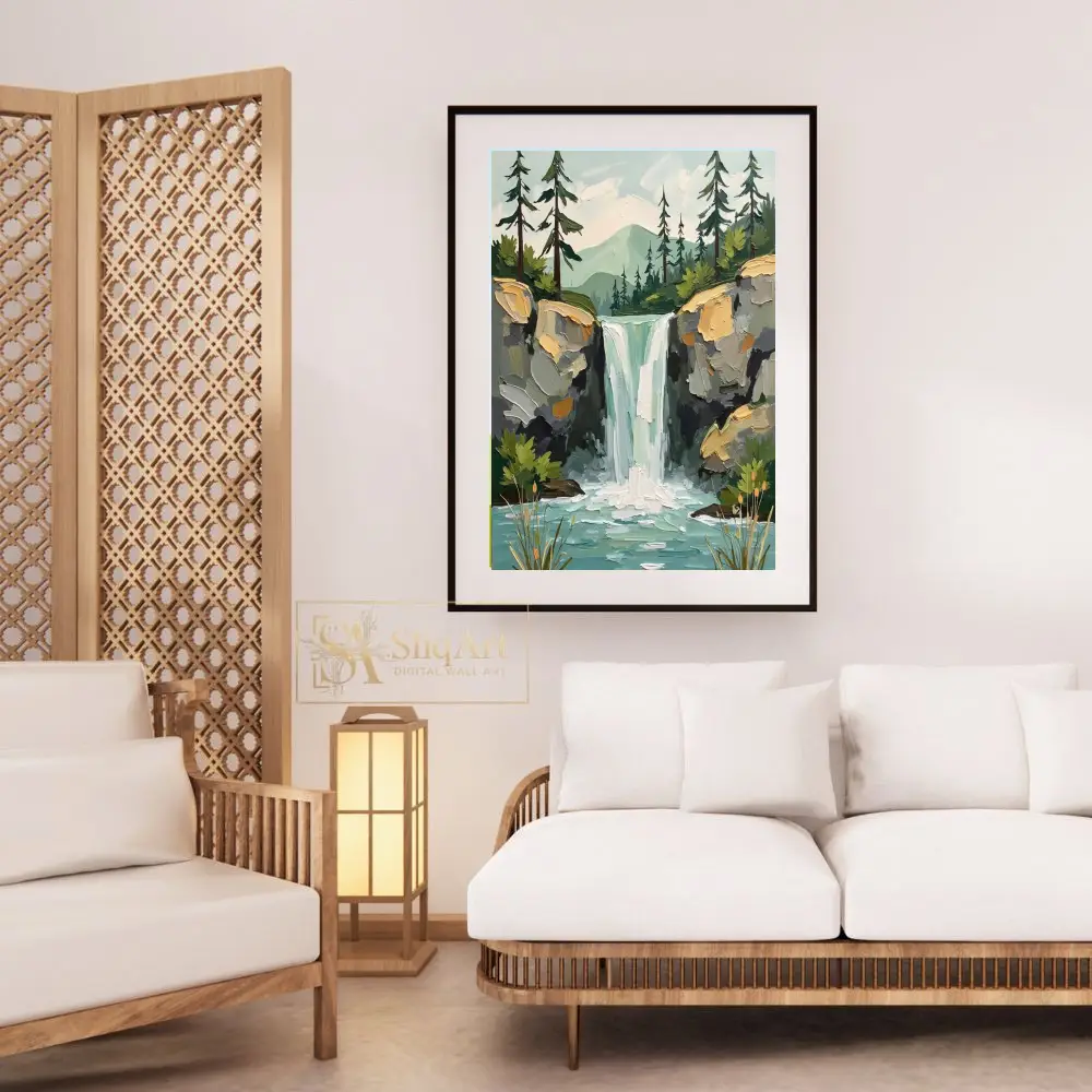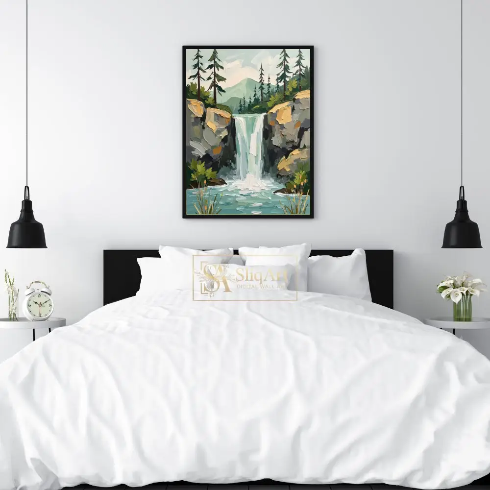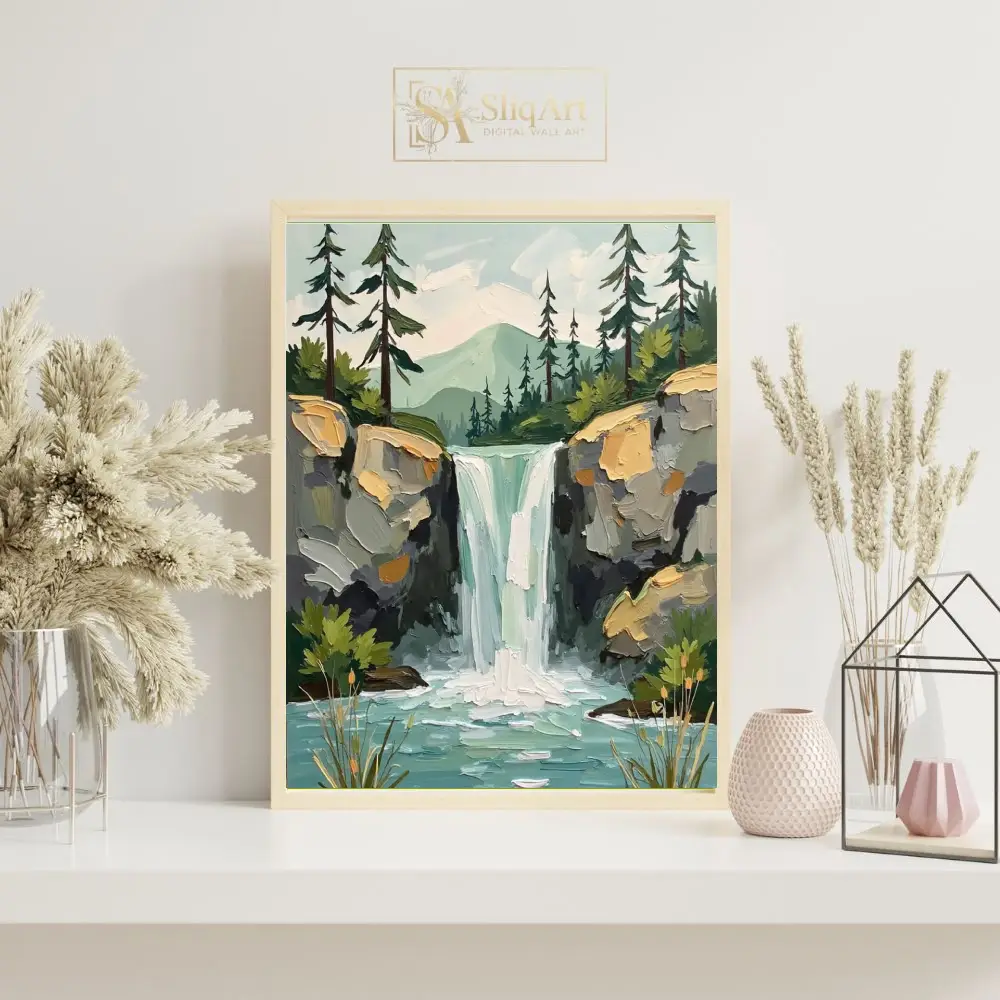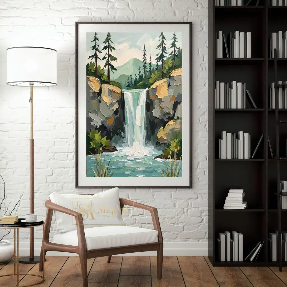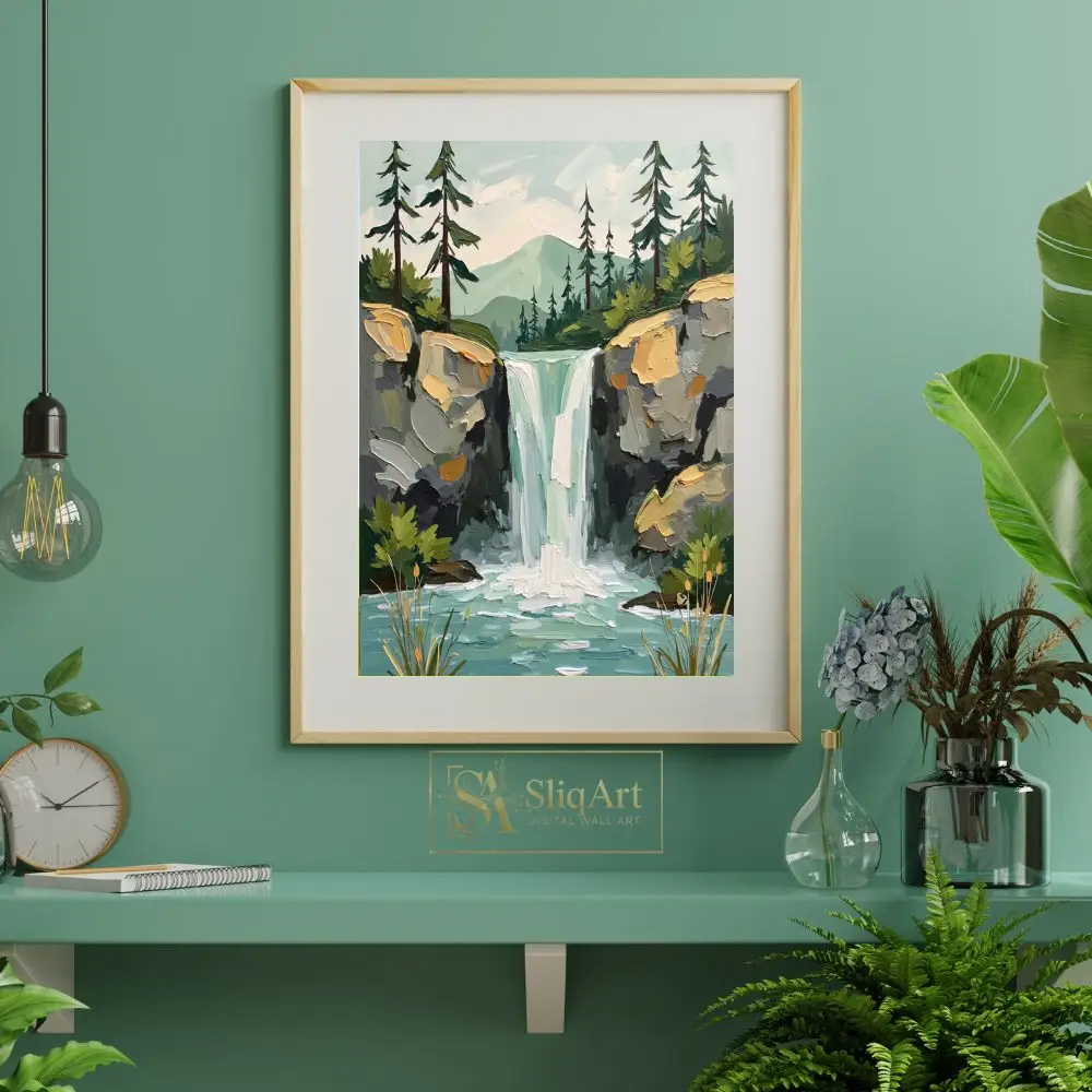 Bring the soothing energy of the outdoors into your interior with this striking impasto-style painting. Capturing a majestic waterfall as it spills into a serene turquoise pool, this piece utilizes thick, textured brushstrokes to create a sense of depth and movement.
