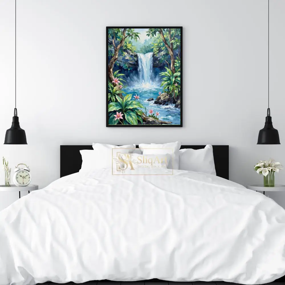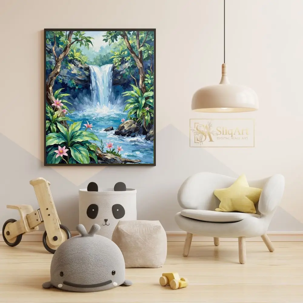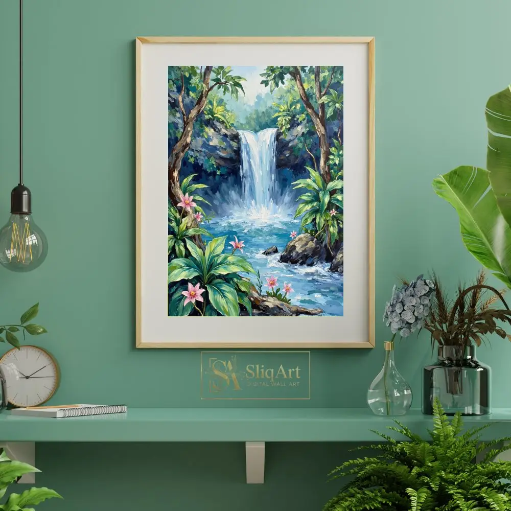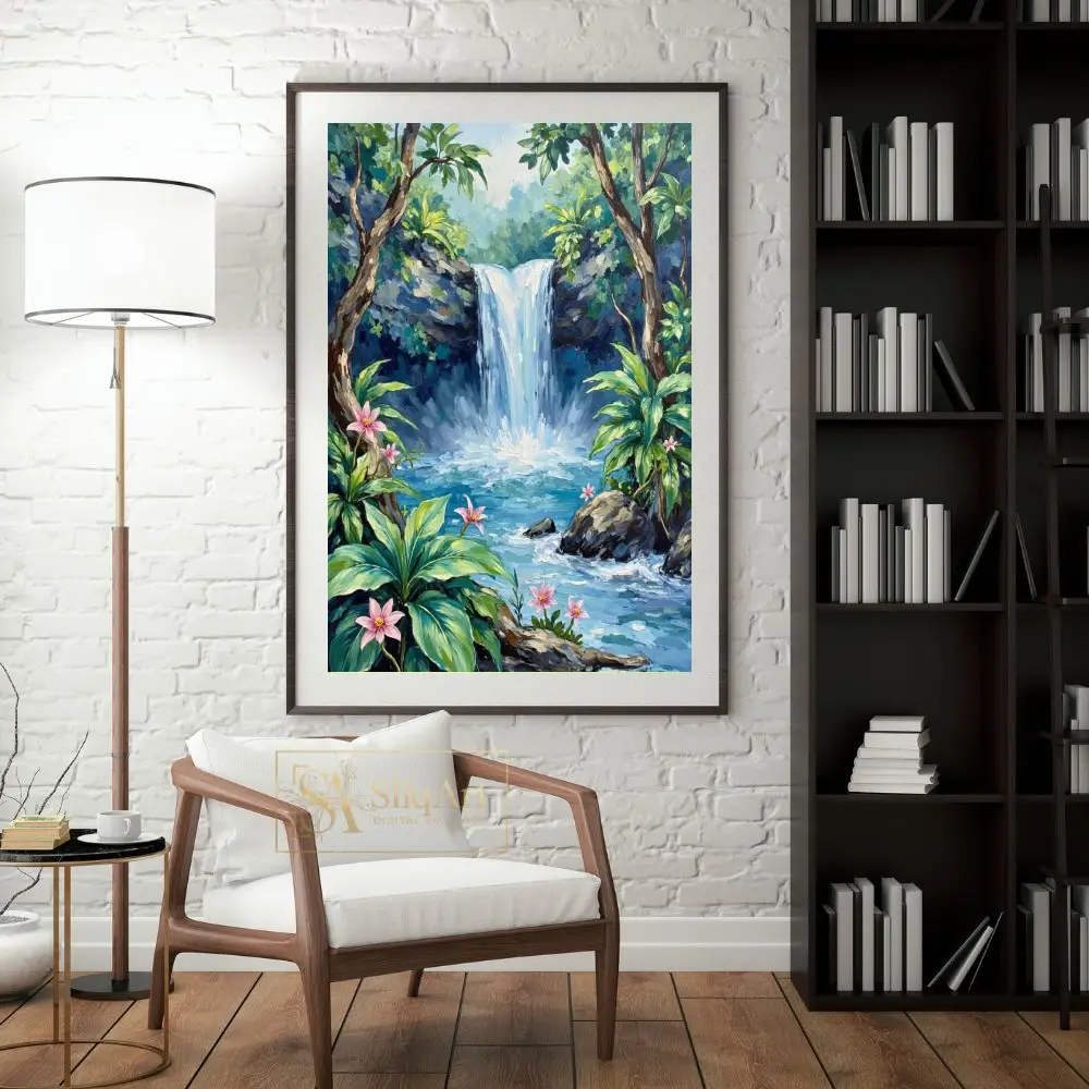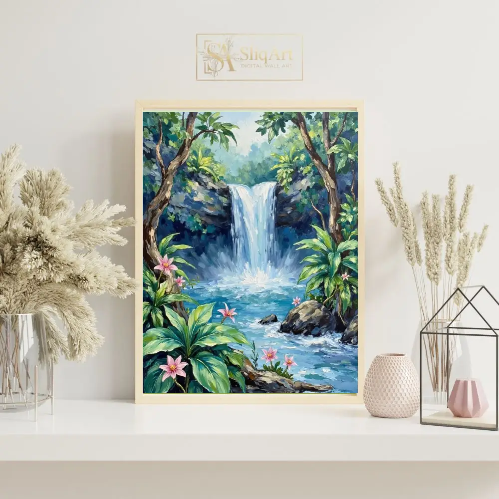 A majestic waterfall cascades into a crystal-clear blue pool, framed by lush tropical greenery and delicate pink flowers. The thick, expressive brushstrokes create a rich texture that brings the refreshing energy of the jungle to life, making it a captivating centerpiece for any nature lover’s home.