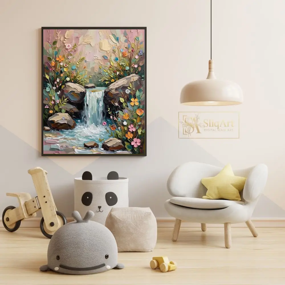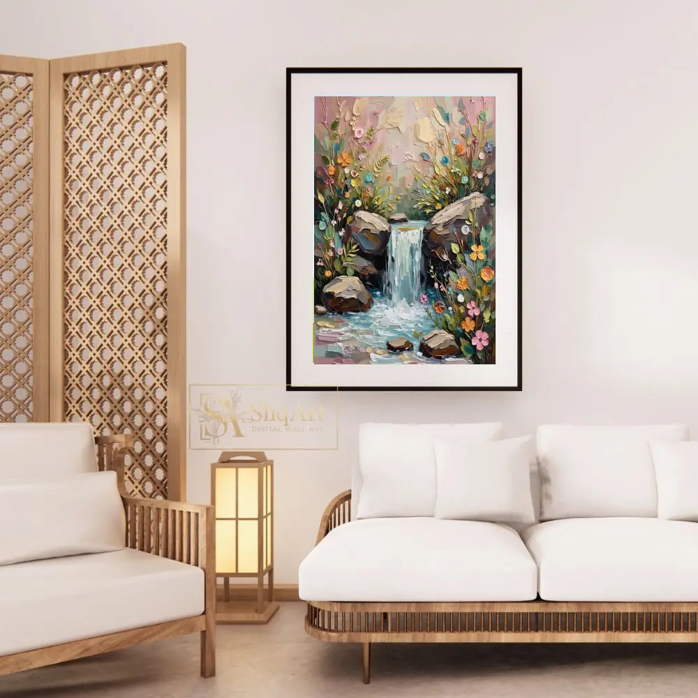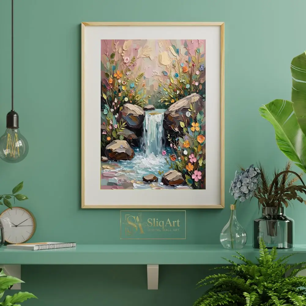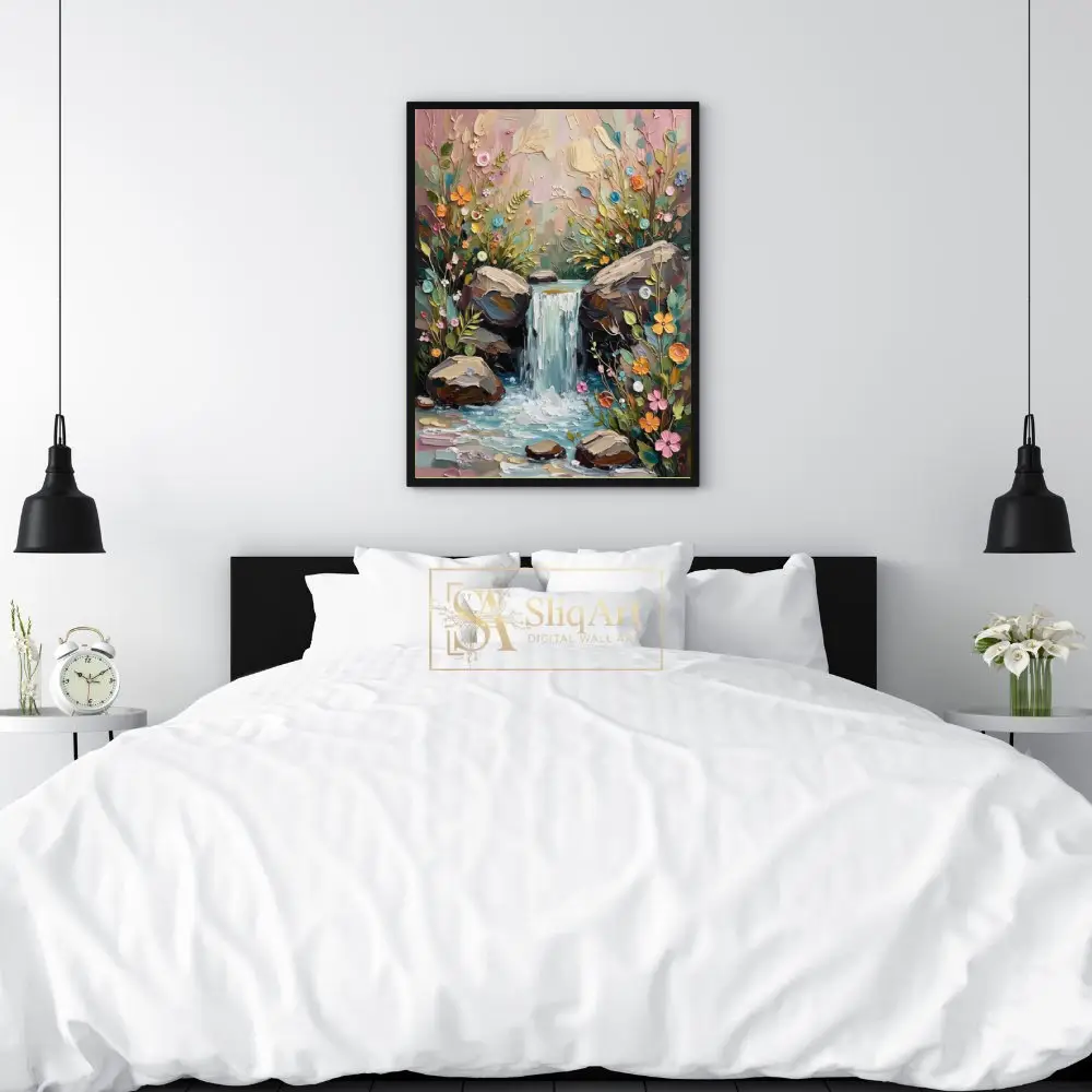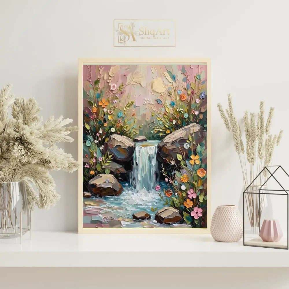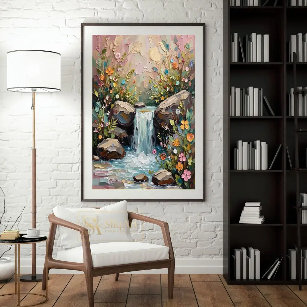 Enhance your home with this stunning impasto-style painting of a hidden woodland waterfall. Created with thick, tactile strokes of a palette knife, this artwork brings the cascading water and vibrant wildflowers to life through a beautiful 3D effect.