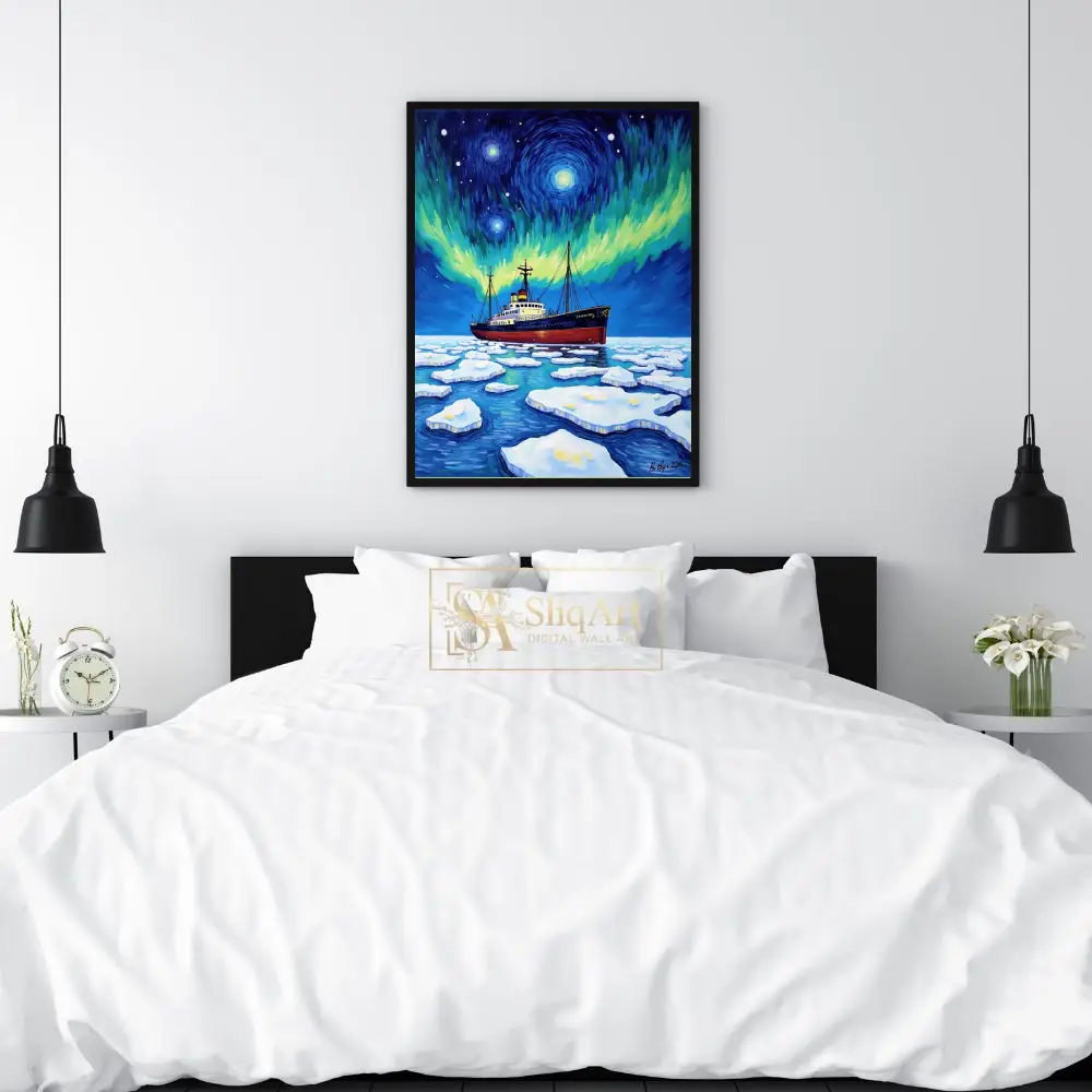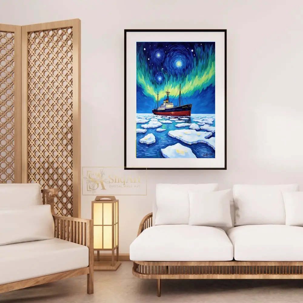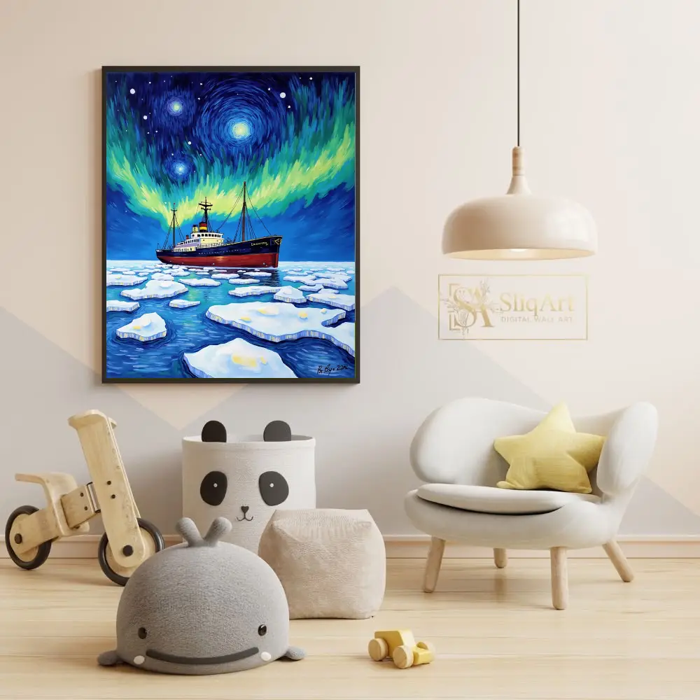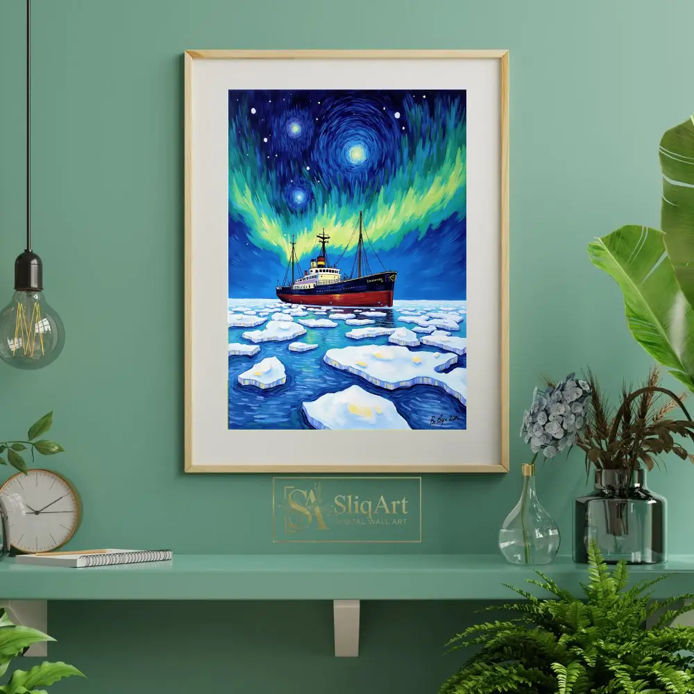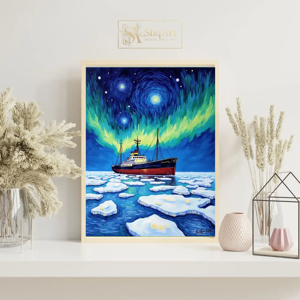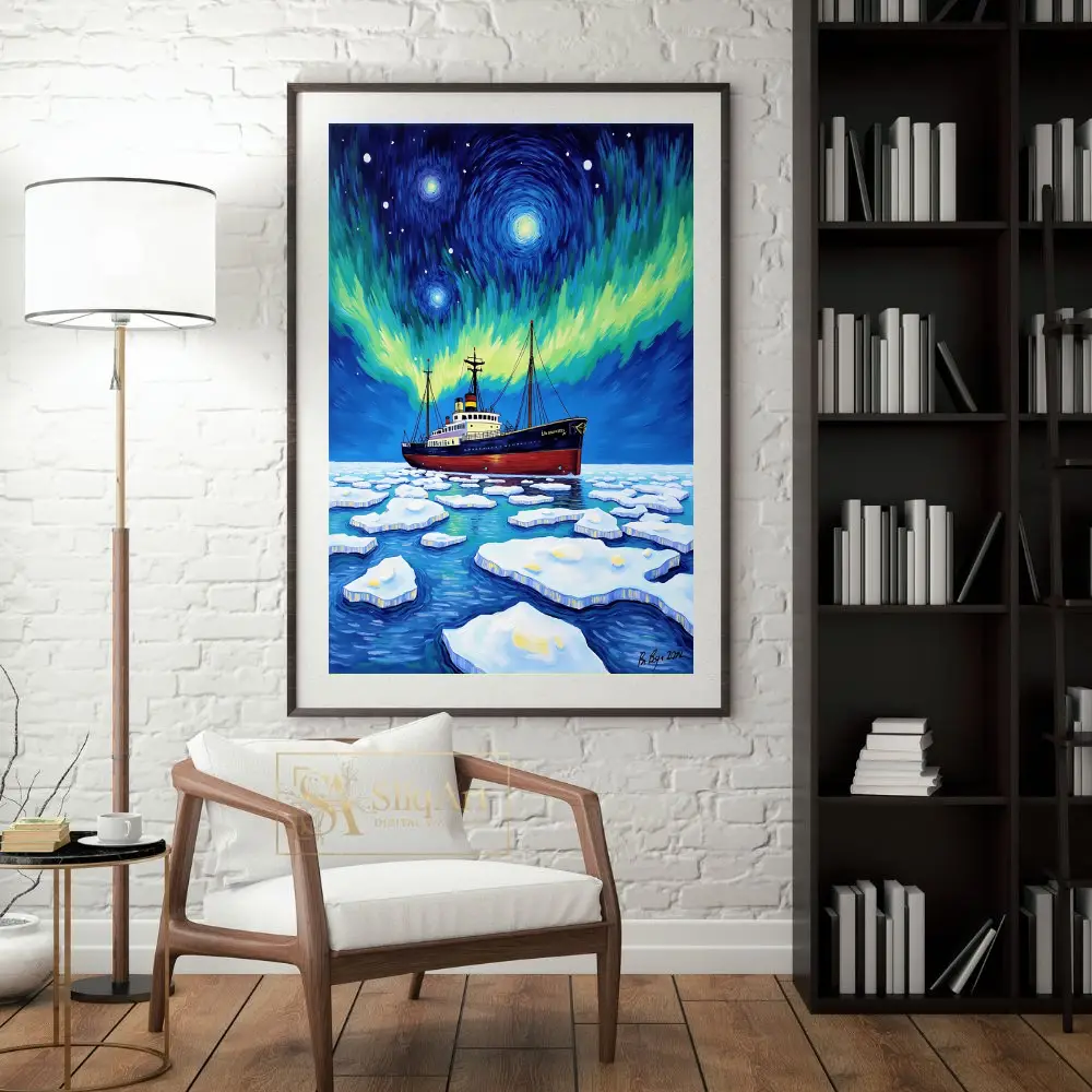 Embark on a visual journey with ‘Celestial Voyage,’ a striking expressionist piece that captures the raw power of an icebreaker ship navigating through frozen arctic waters. The composition is defined by a mesmerizing, Van Gogh-inspired sky where the Northern Lights dance in vibrant swirls of emerald and gold against a deep indigo firmament.