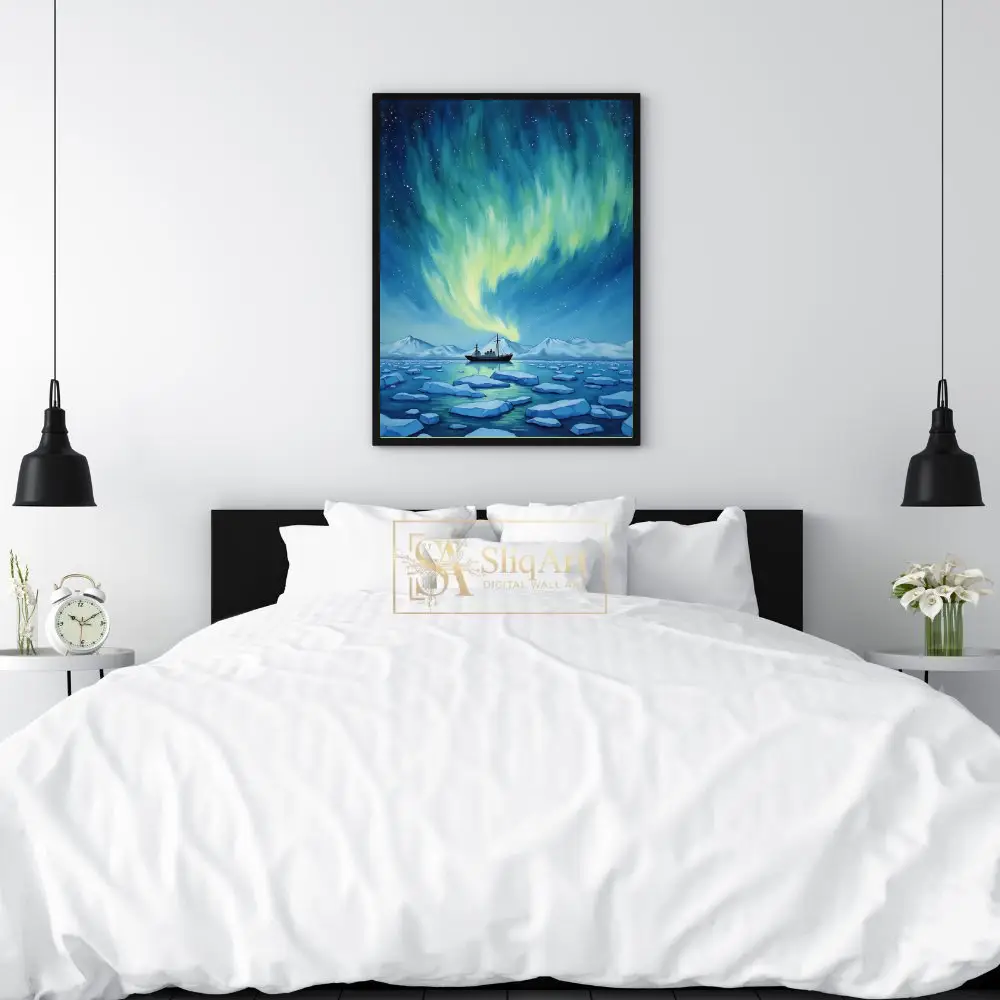 Immerse yourself in the ethereal beauty of the polar night with this captivating piece of wall art. Featuring the brilliant dance of the Northern Lights in shades of lime green and pale yellow, the sky towers over a serene Arctic landscape.