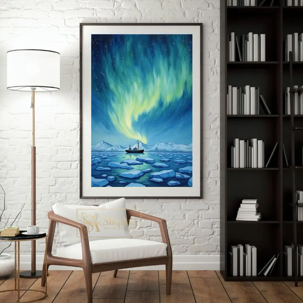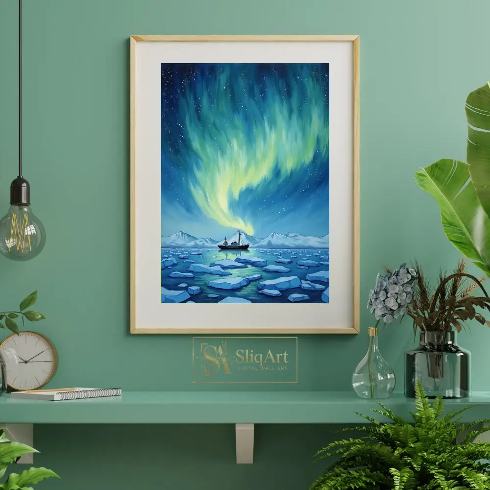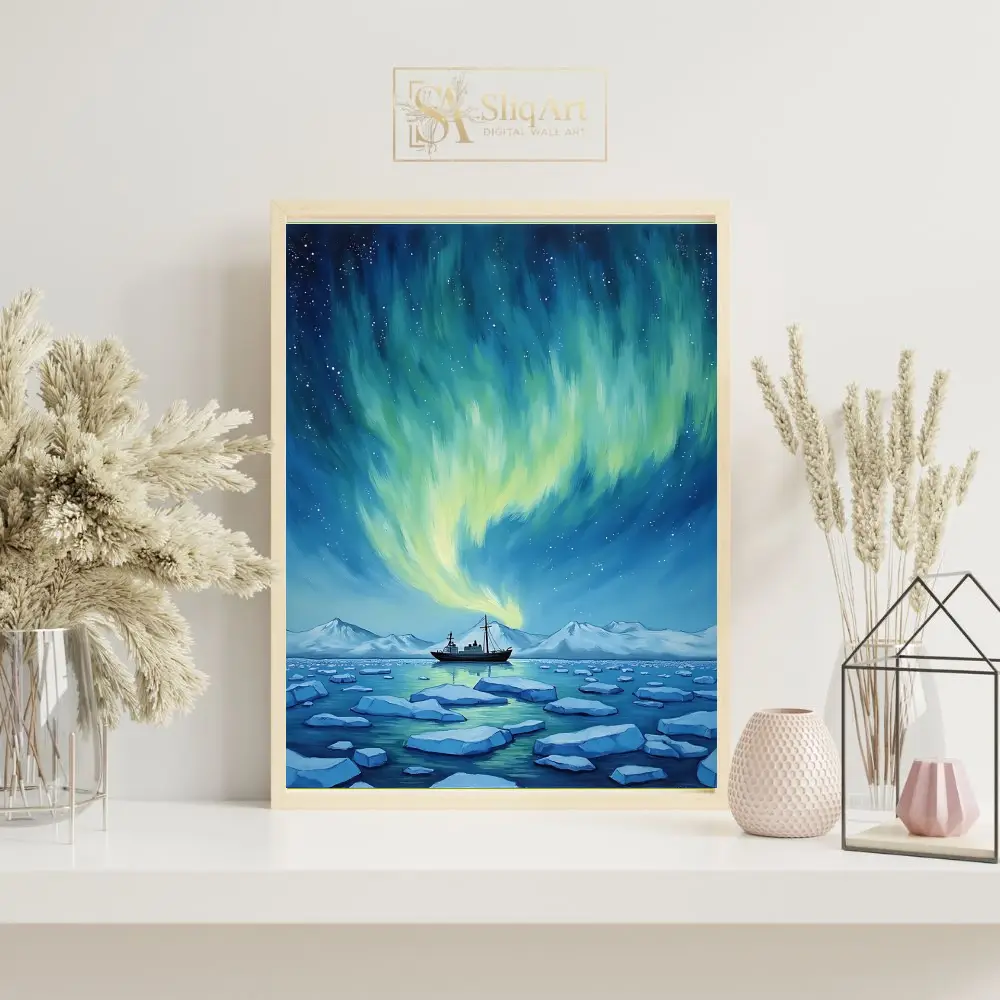 A solitary research vessel navigates through a field of shimmering blue ice floes, set against a backdrop of distant snowy mountains. The painterly style and cool color palette create a sense of tranquil wonder, making it an ideal centerpiece for those who love nautical adventure and the mysteries of the cosmos.