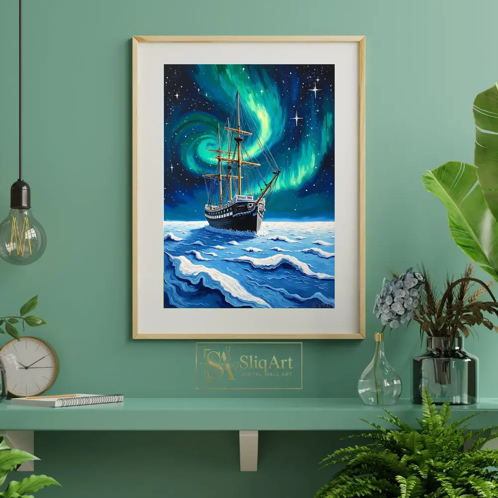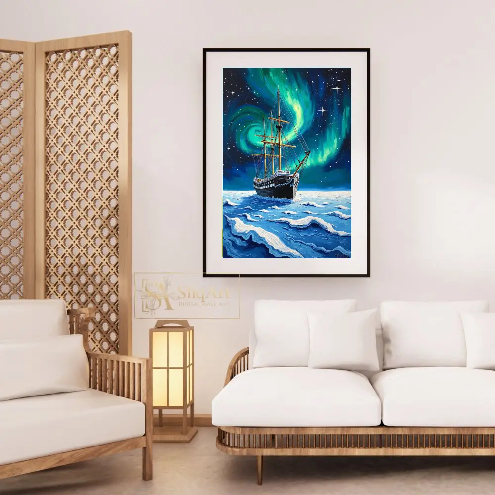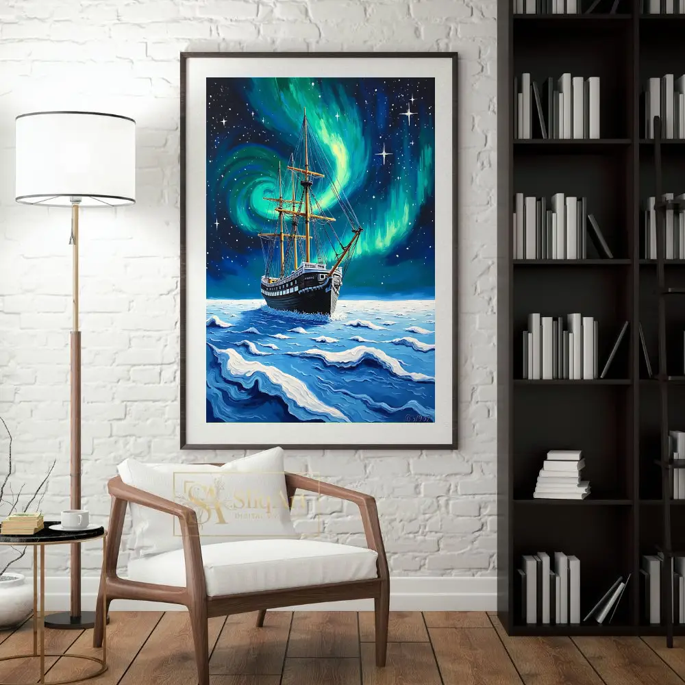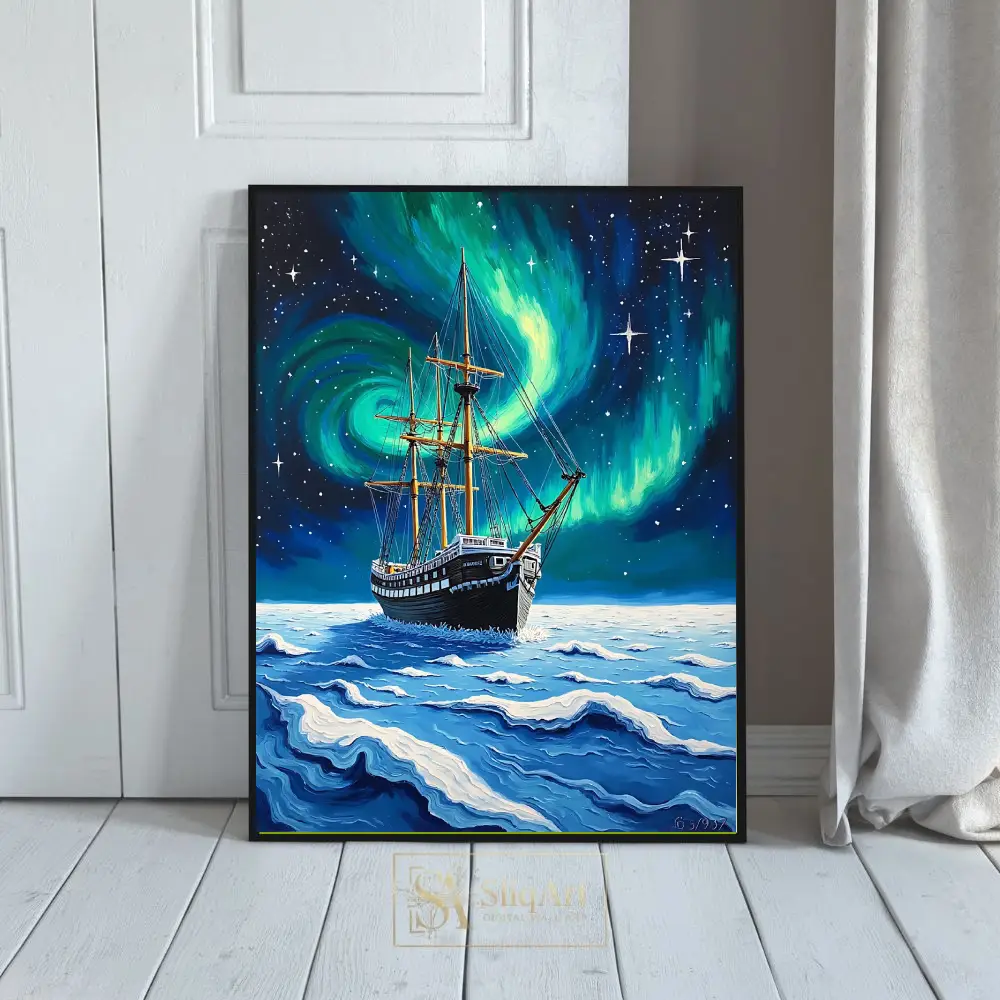 Embark on a mystical journey with this stunning piece of wall art featuring a majestic sailing vessel navigating through icy arctic waters.
