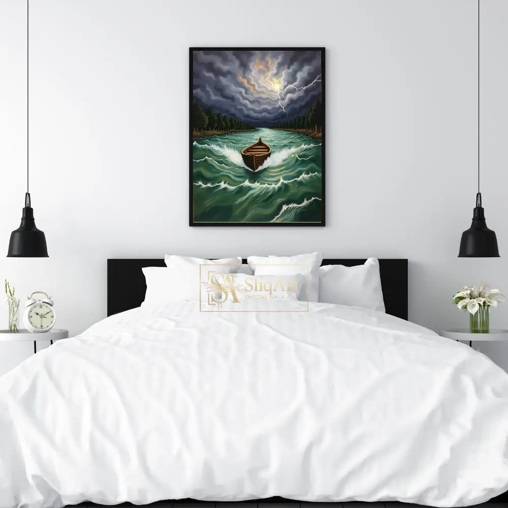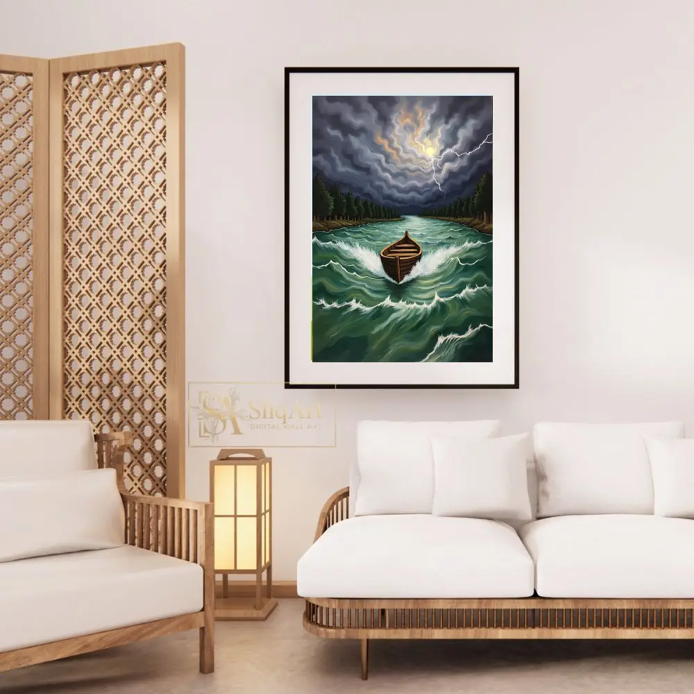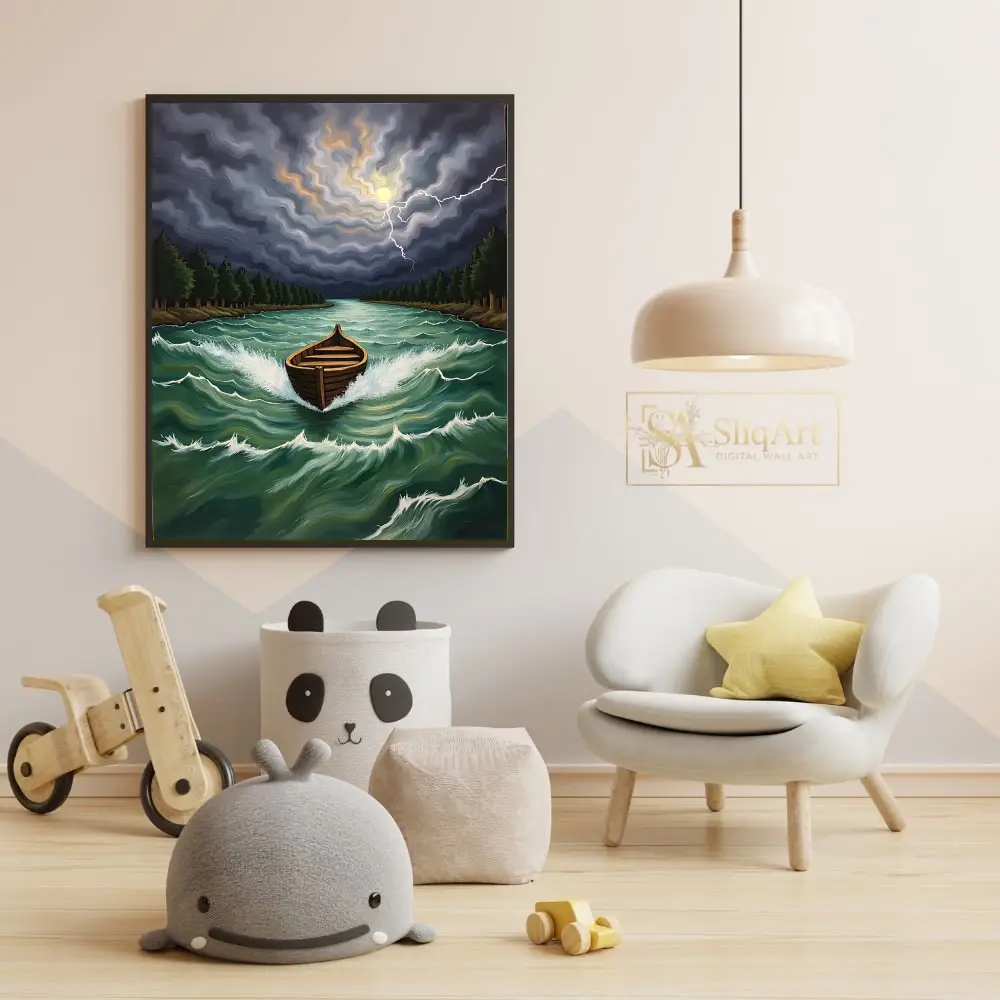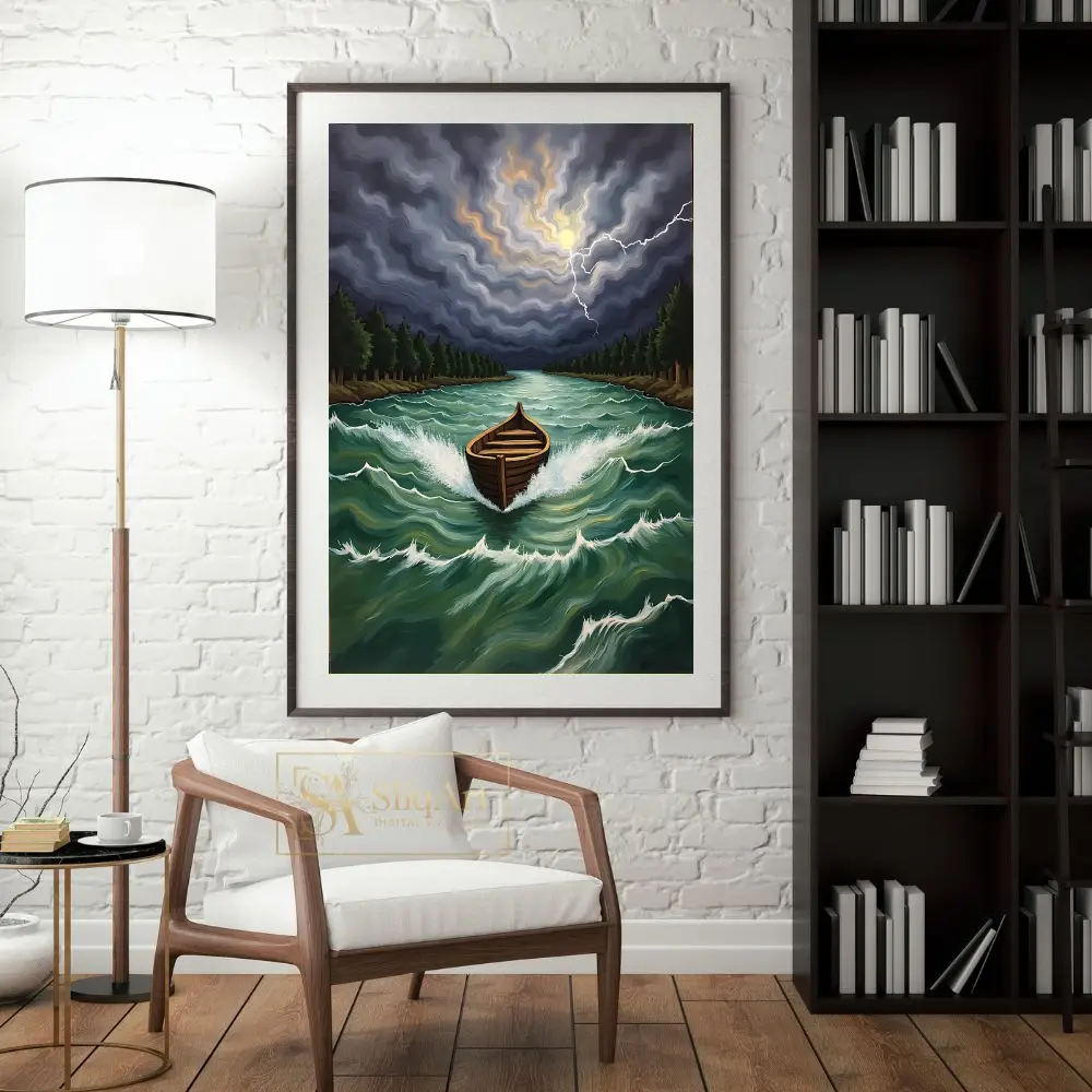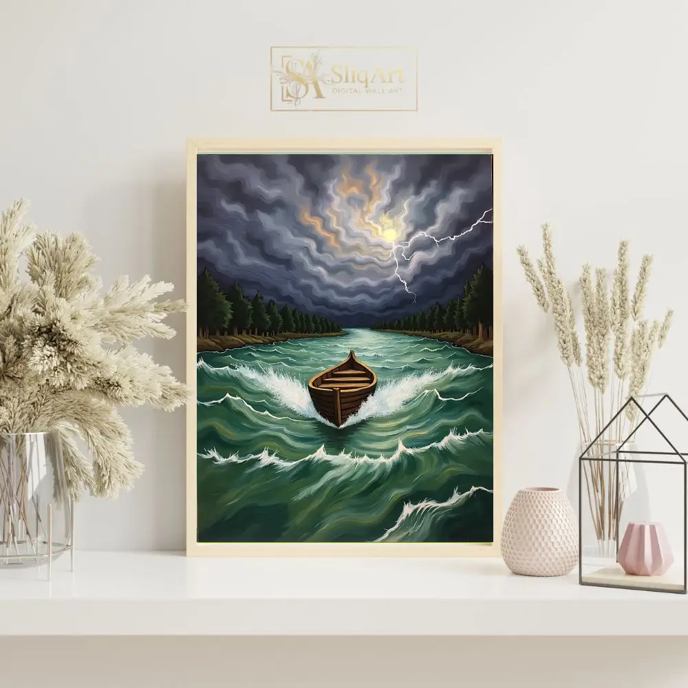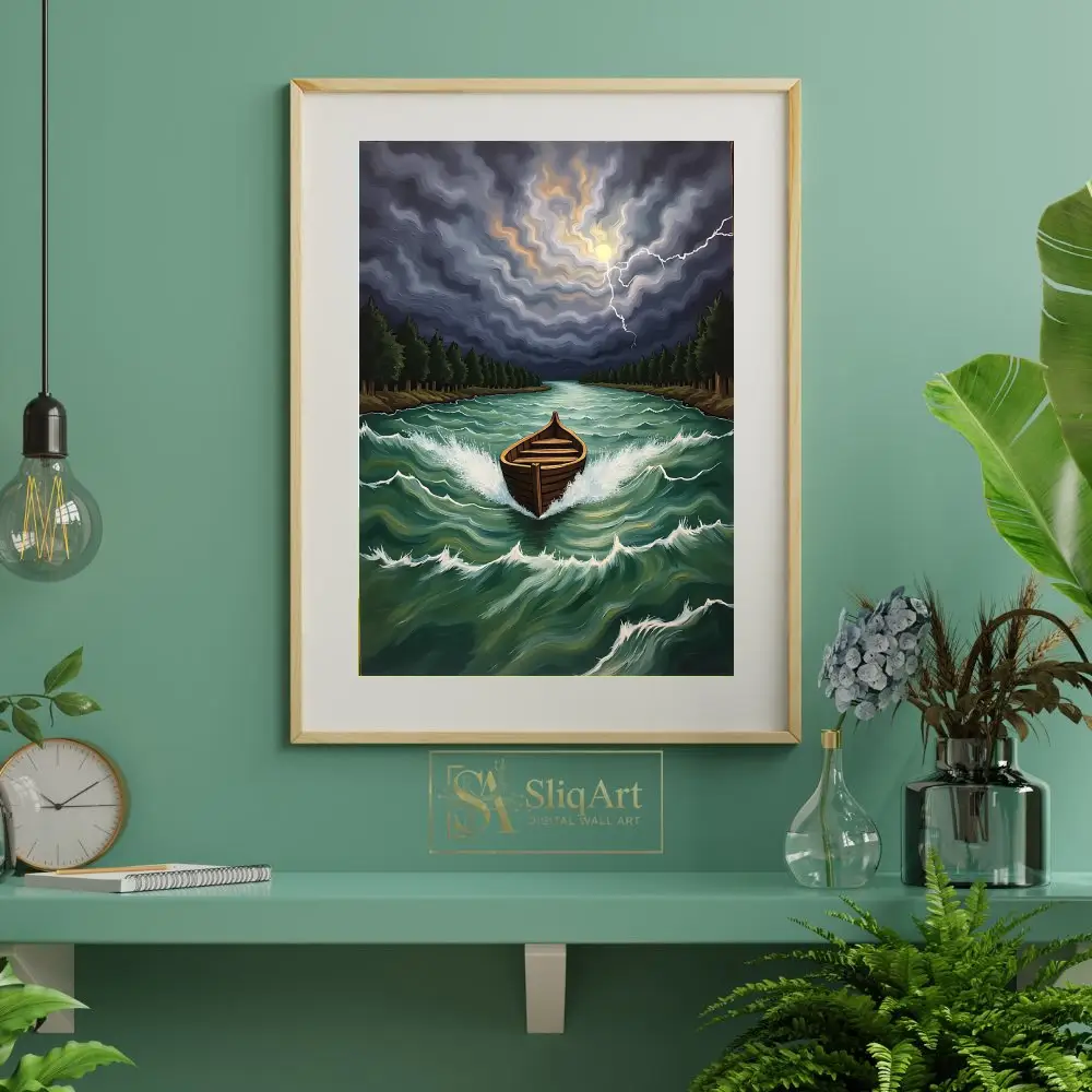 Witness the intensity of nature captured in a unique, stylized aesthetic. This painting features a classic wooden boat cutting through turbulent green waves on a river flanked by dense forests.