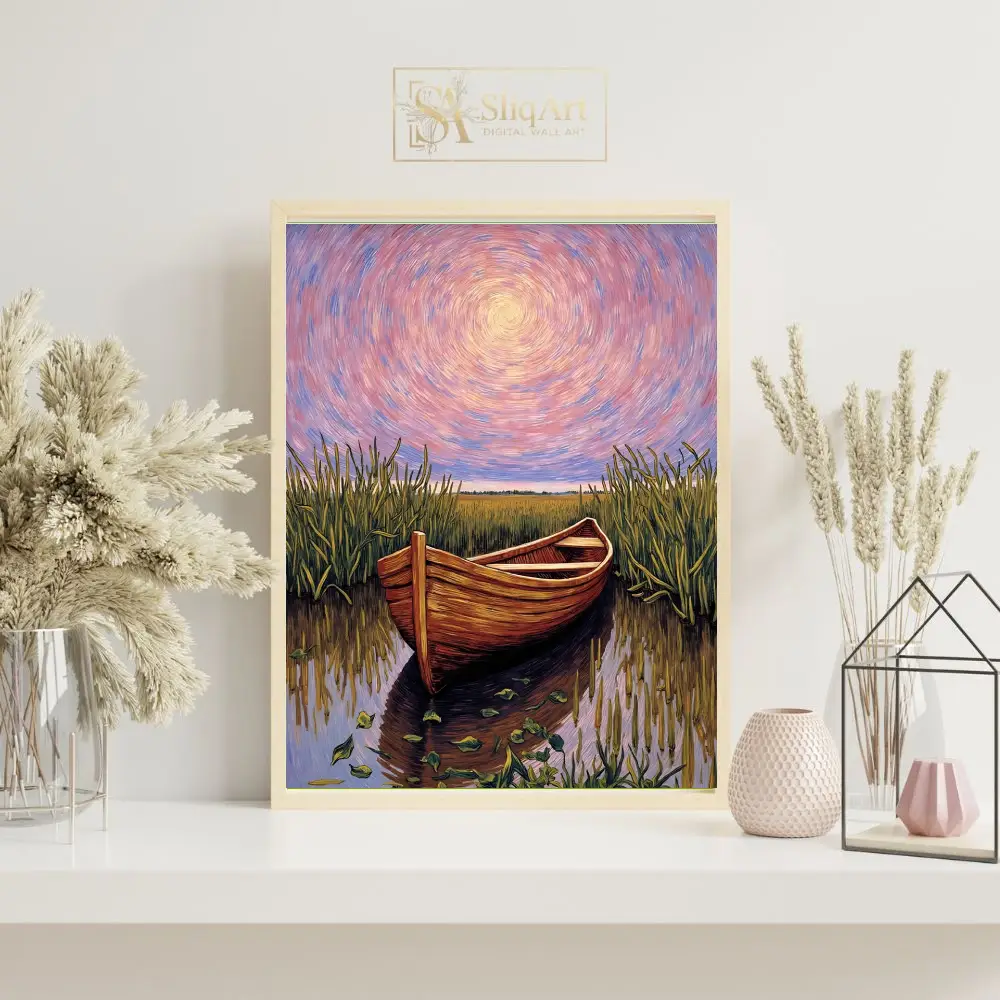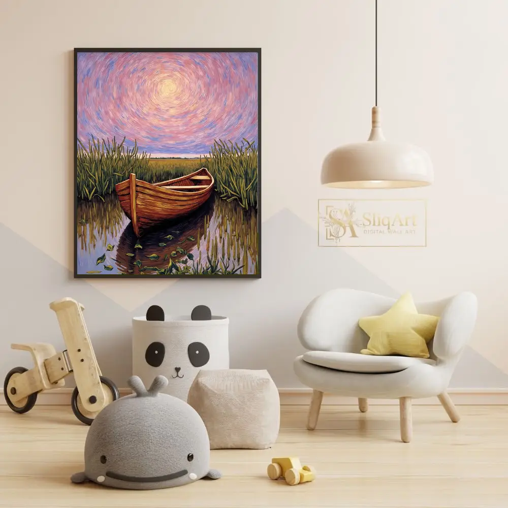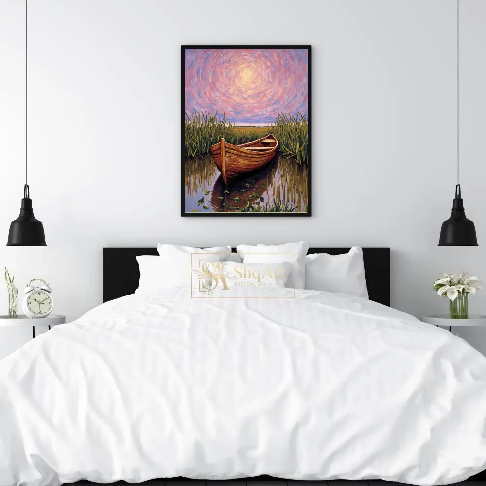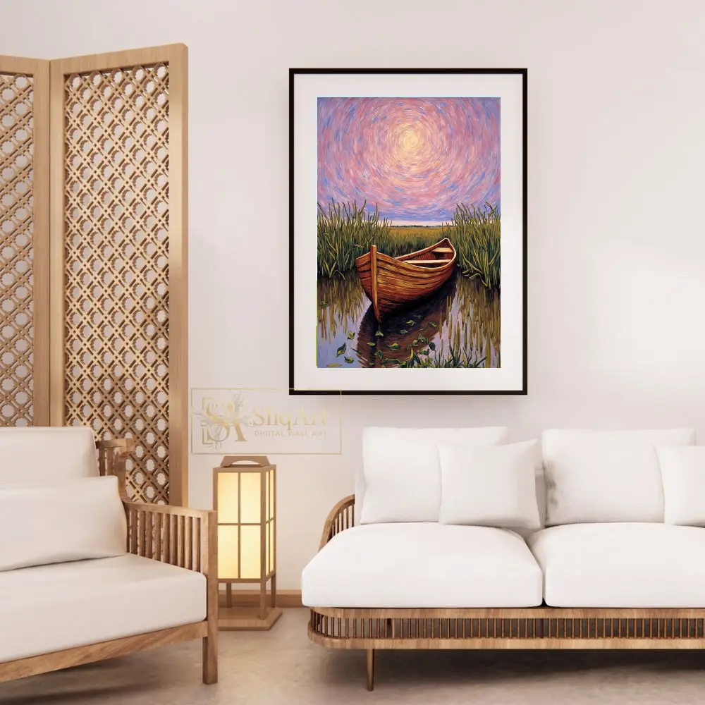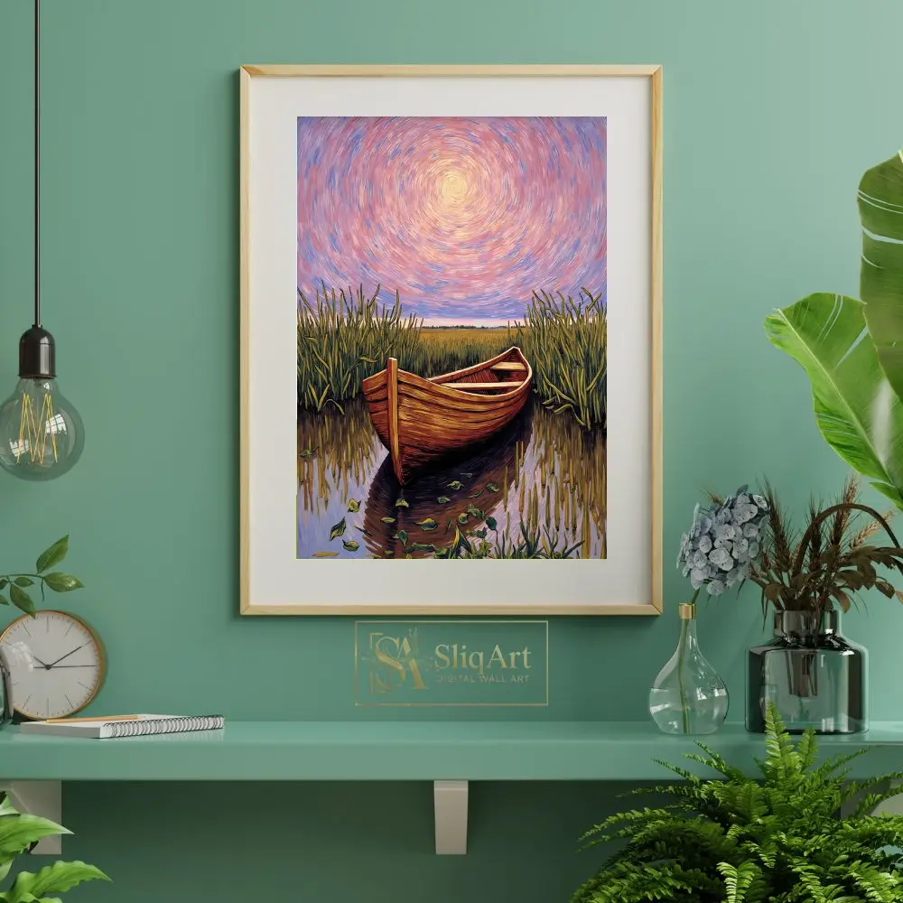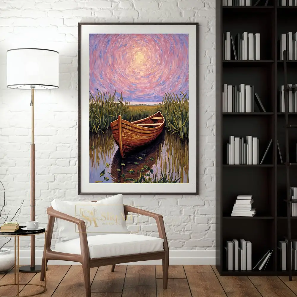 Immerse yourself in a world of tranquil beauty with this breathtaking impressionist painting. A rustic wooden boat rests peacefully in the heart of a lush marsh, surrounded by swaying reeds and shimmering water.