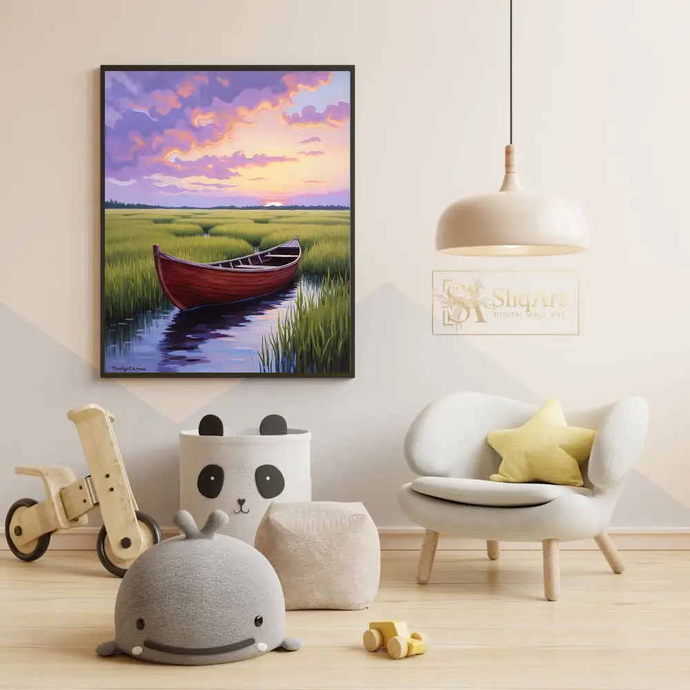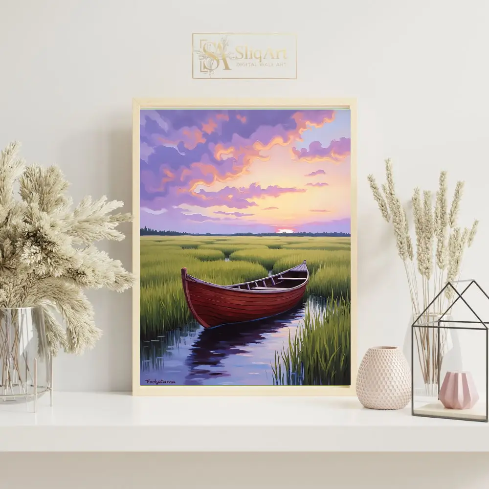 Be the first to review “Serene Sunset Marsh Boat Art – Vibrant Impressionist Landscape”