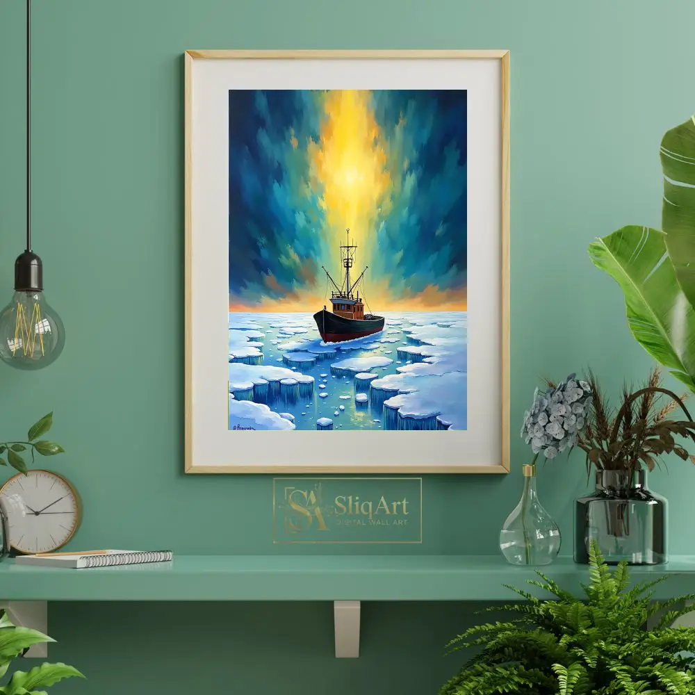 This captivating piece of nautical wall art depicts a resilient fishing boat navigating through a vast field of floating ice floes. The scene is illuminated by a dramatic, celestial sky where a radiant core of golden light bursts through layers of deep teal and navy.