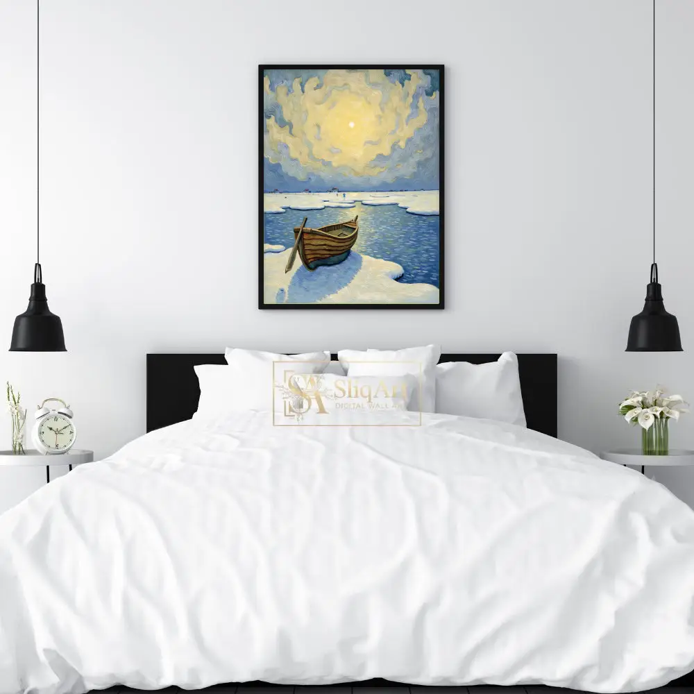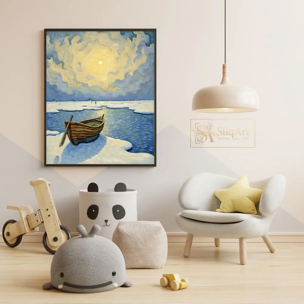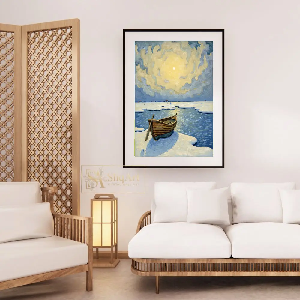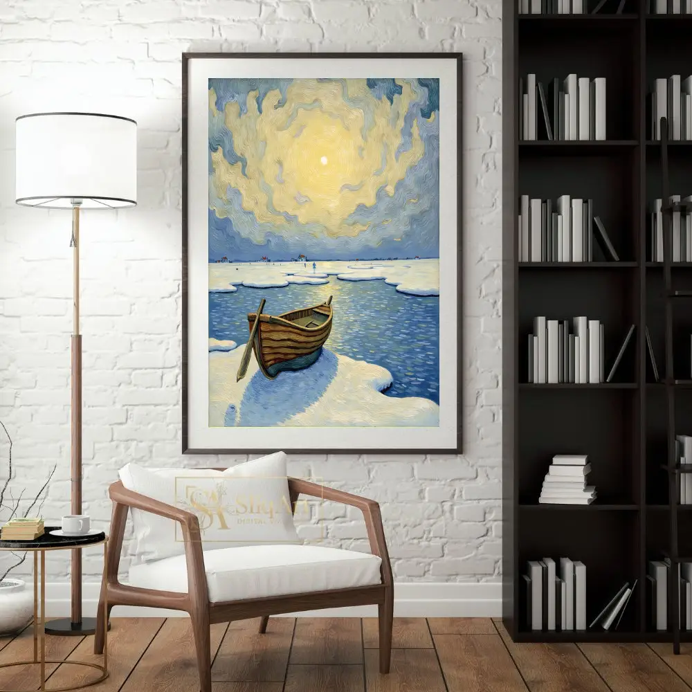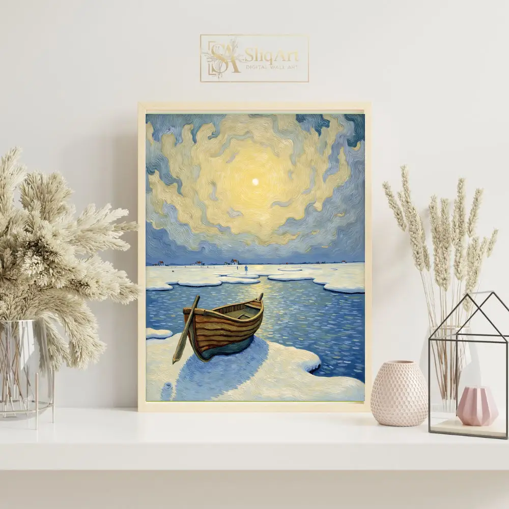 Capture the serene yet powerful beauty of a winter landscape with this stunning Impressionist wall art. Featuring a solitary wooden boat perched on a snow-covered ice floe, the piece is dominated by a radiant, swirling sky that echoes the legendary style of Vincent van Gogh.