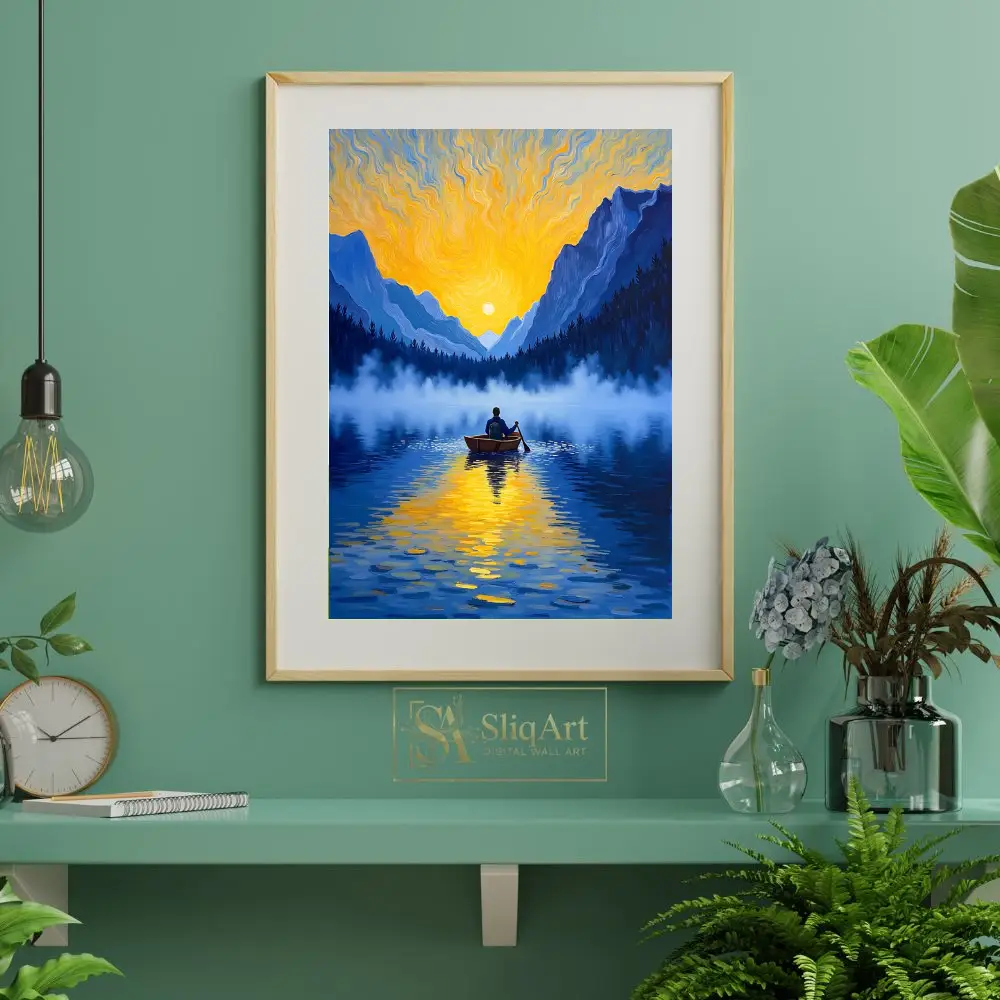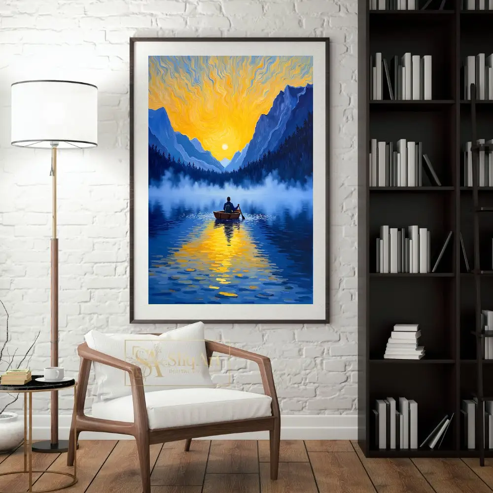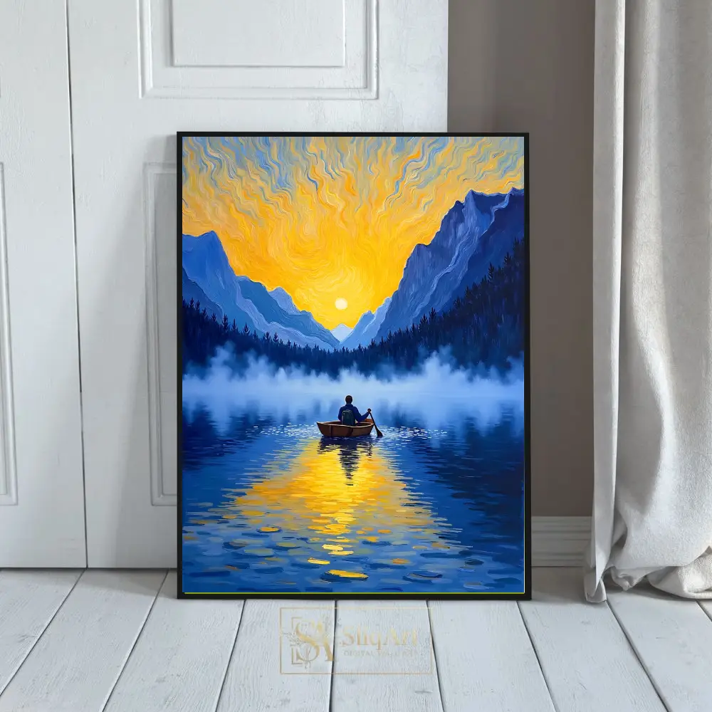 Elevate your interior with this breathtaking impressionist painting depicting a solitary figure rowing across a mist-covered mountain lake. The composition captures the ethereal beauty of a golden sunrise, with vibrant yellow and orange light swirling across the sky in a style that pays homage to classic post-impressionist techniques.