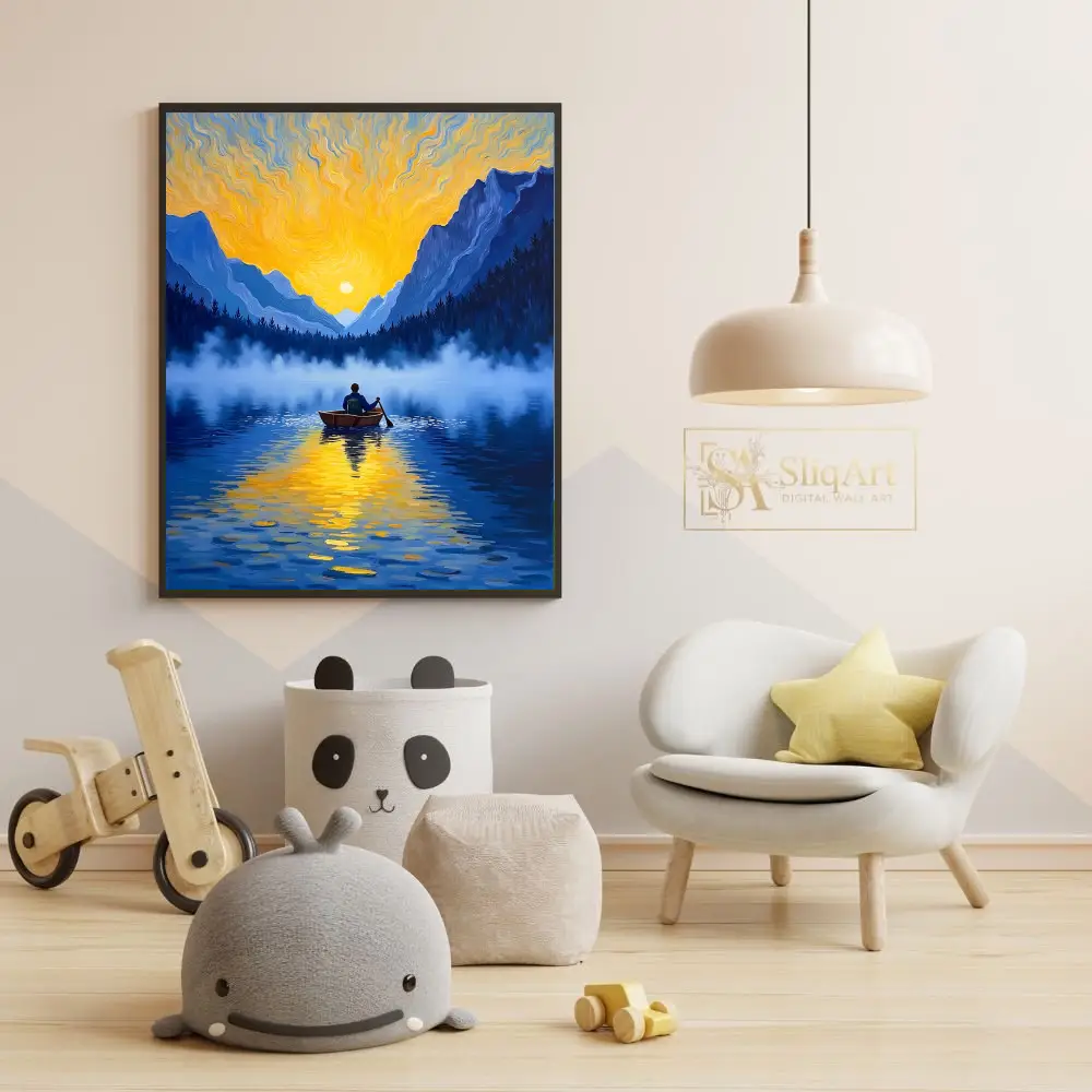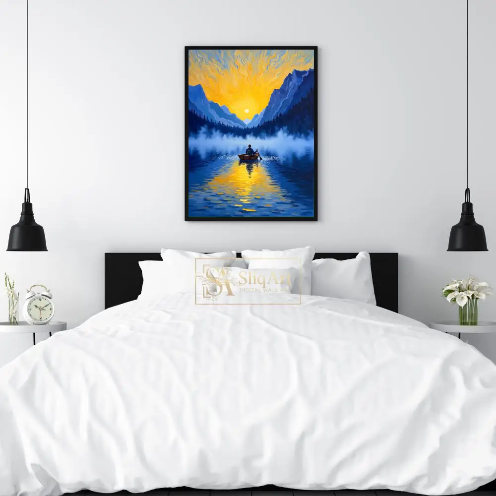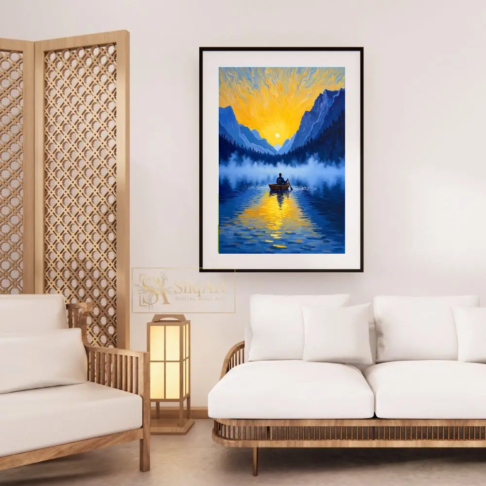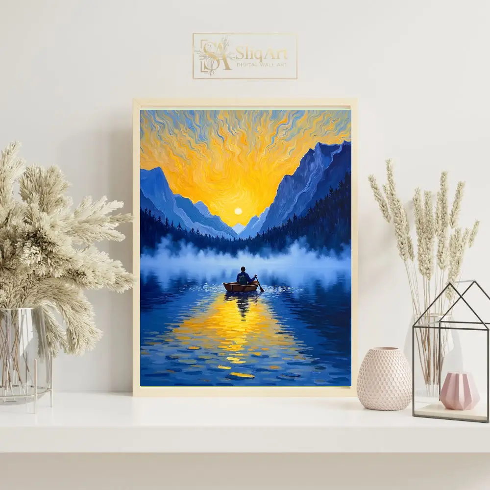 Elevate your interior with this breathtaking impressionist painting depicting a solitary figure rowing across a mist-covered mountain lake. The composition captures the ethereal beauty of a golden sunrise, with vibrant yellow and orange light swirling across the sky in a style that pays homage to classic post-impressionist techniques.