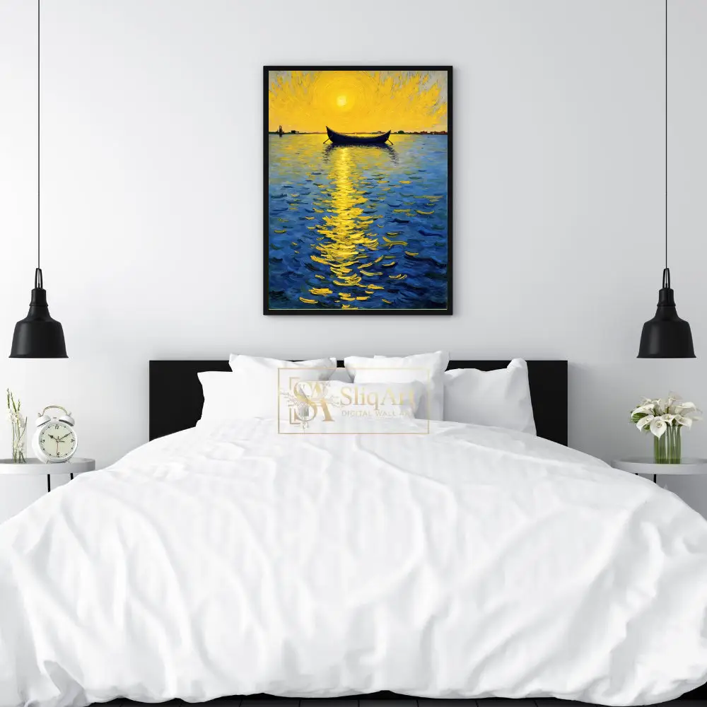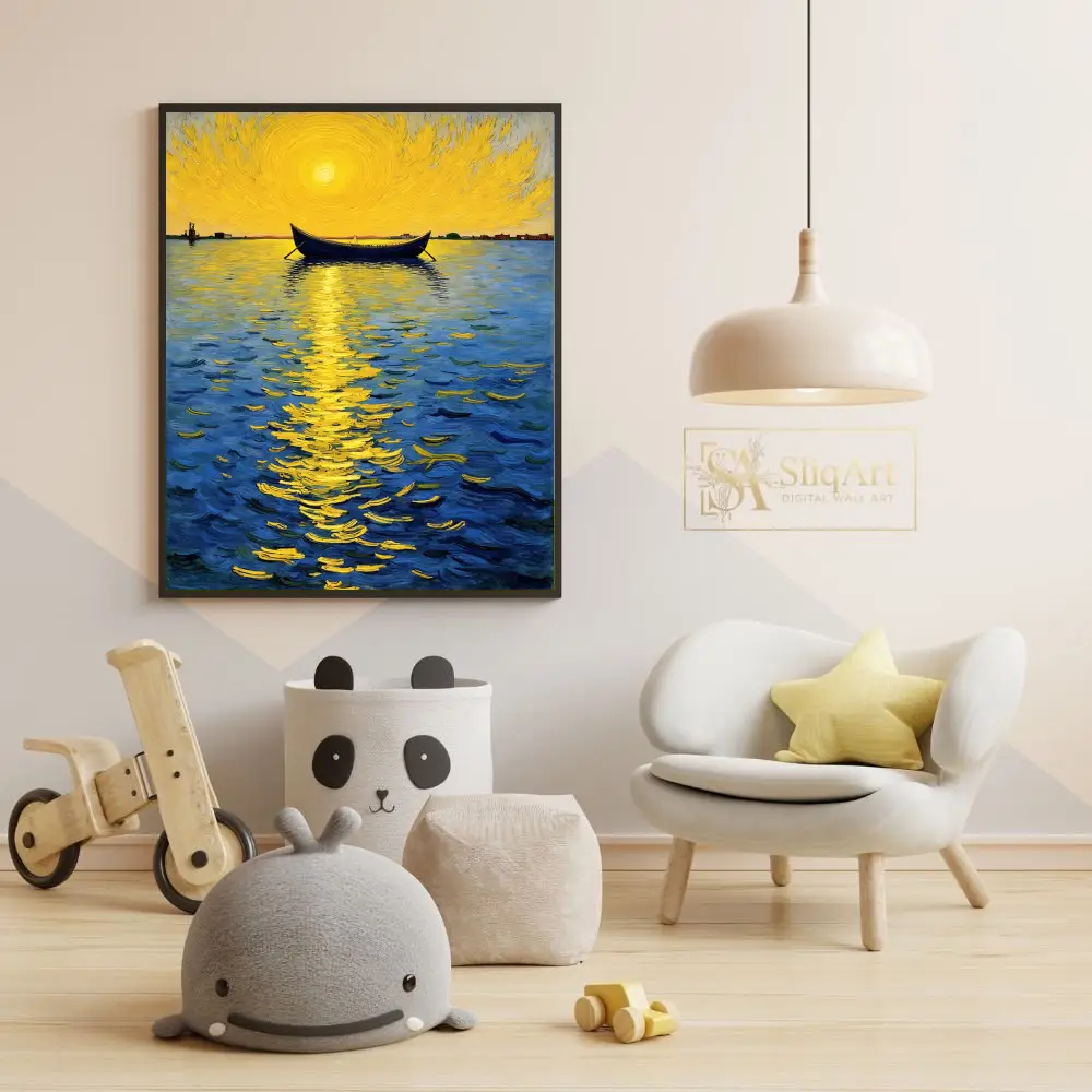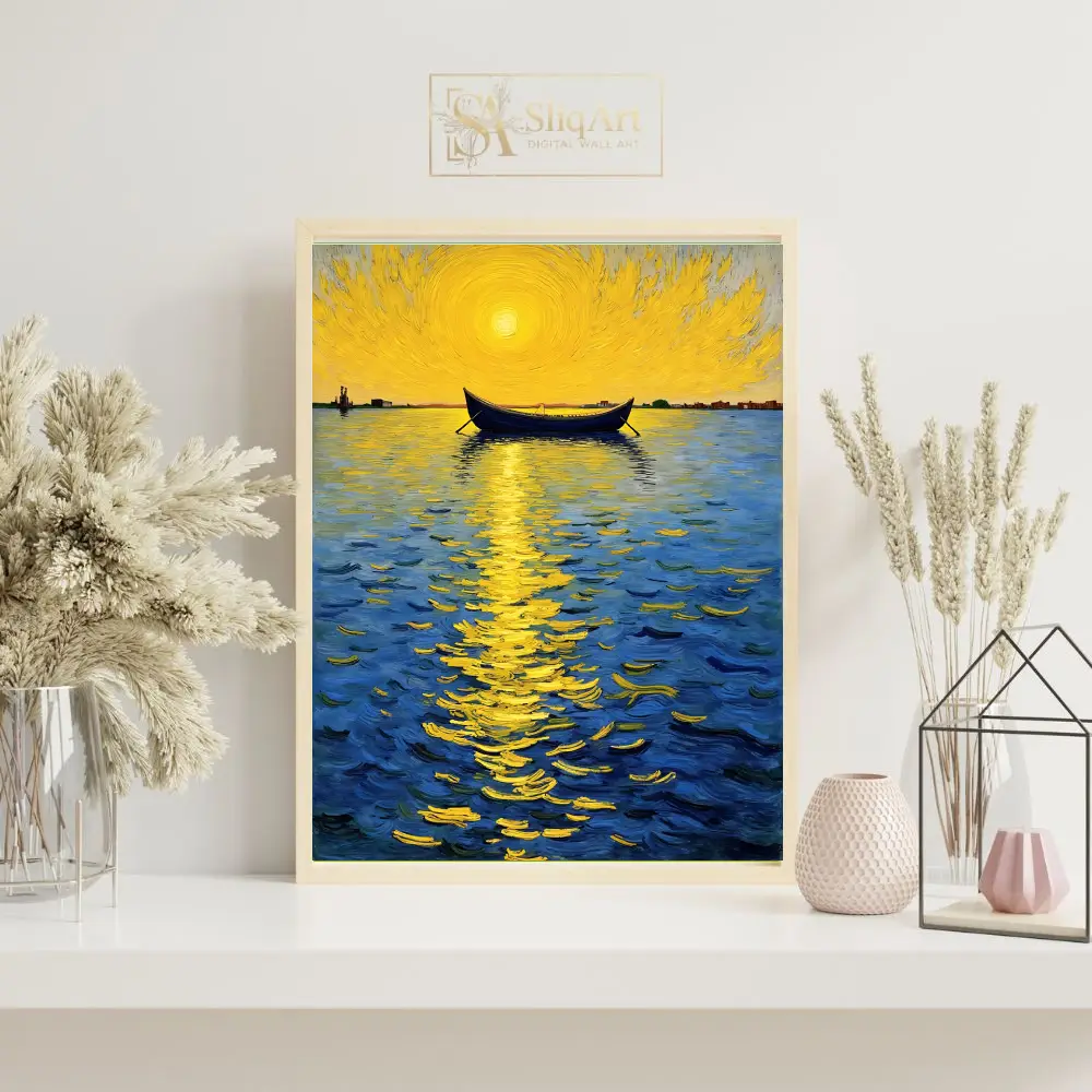 Embrace the radiant energy of a setting sun with ‘Golden Horizon,’ a stunning piece inspired by the iconic post-impressionist style of Vincent van Gogh. This artwork captures a solitary rowboat drifting on tranquil blue waters, bathed in the overwhelming glow of a massive, swirling sun.