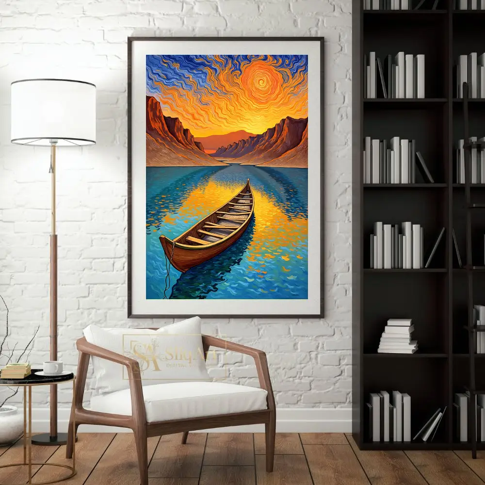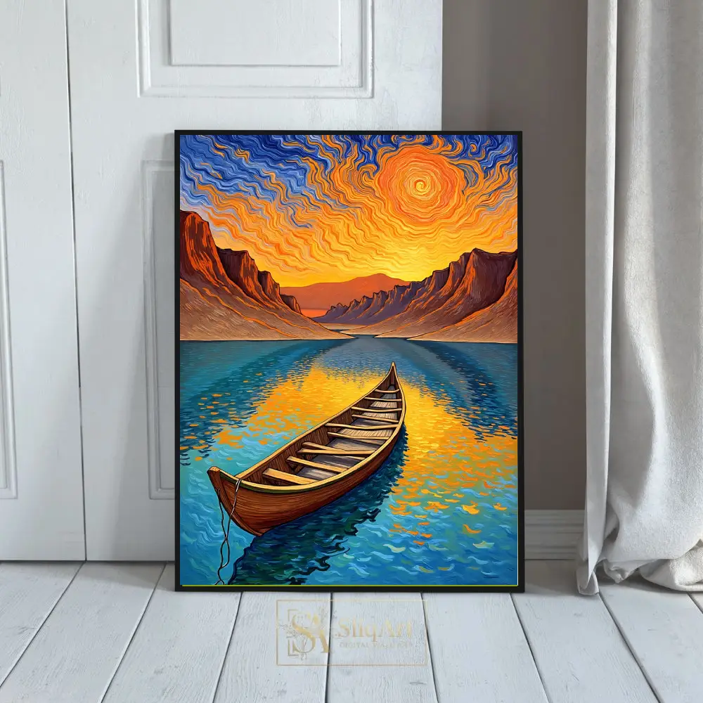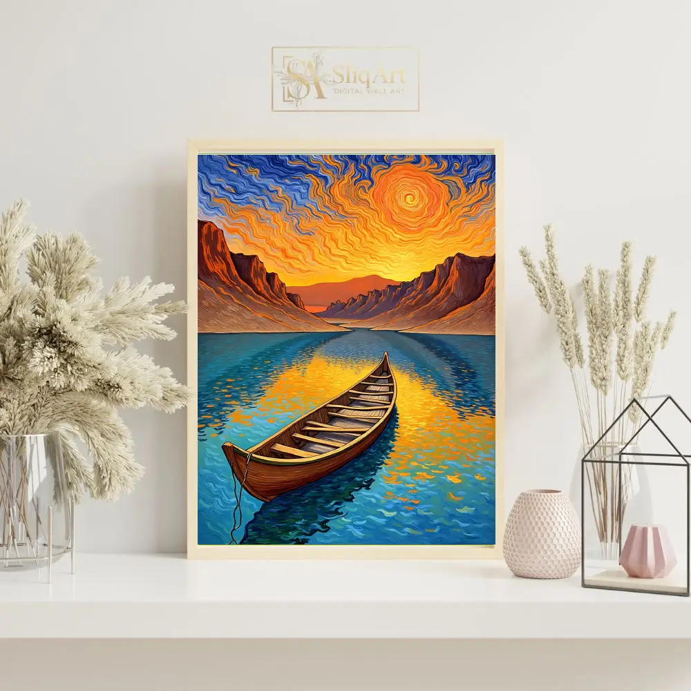 This stunning piece captures a serene moment on the water, featuring a rustic wooden boat floating peacefully on a shimmering lake. The background is a breathtaking display of mountains under a swirling, Van Gogh-inspired sky filled with vibrant shades of orange, yellow, and deep blue.