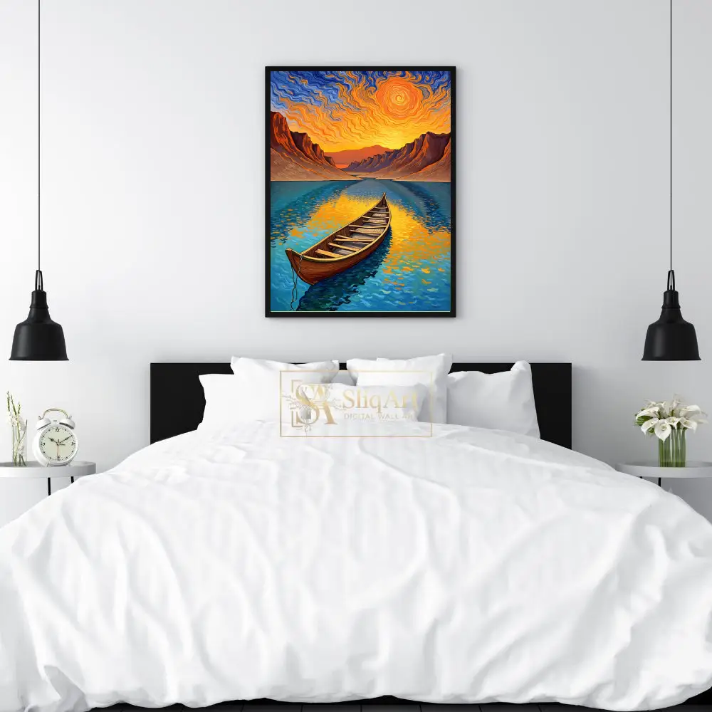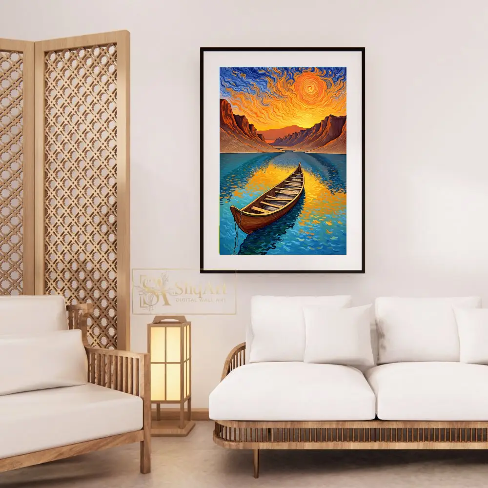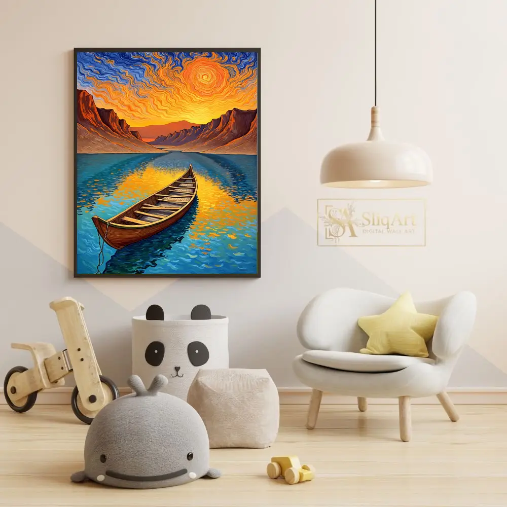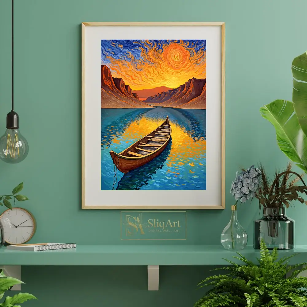 This stunning piece captures a serene moment on the water, featuring a rustic wooden boat floating peacefully on a shimmering lake. The background is a breathtaking display of mountains under a swirling, Van Gogh-inspired sky filled with vibrant shades of orange, yellow, and deep blue.