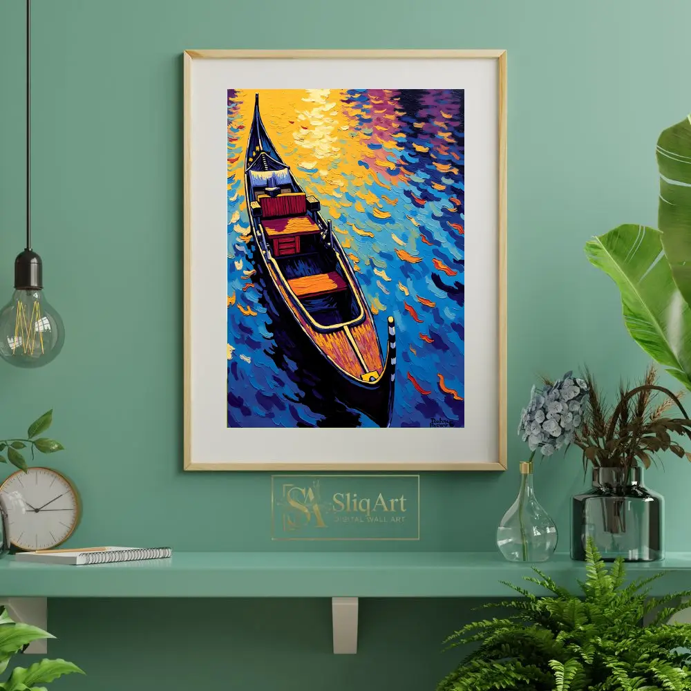 Experience the romantic allure of Venice through this striking impressionist artwork. This piece features a traditional gondola floating on shimmering, textured waters, rendered with bold and energetic impasto brushstrokes.
