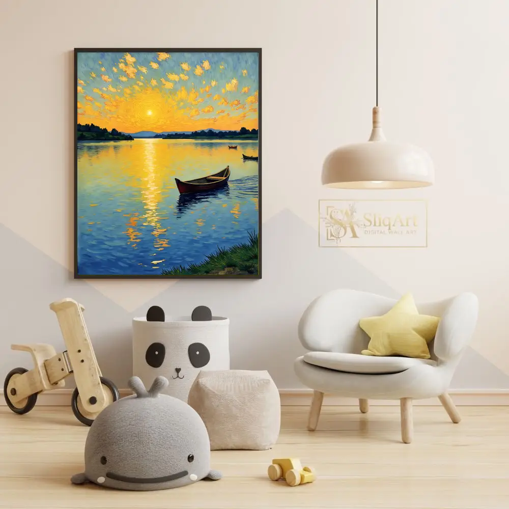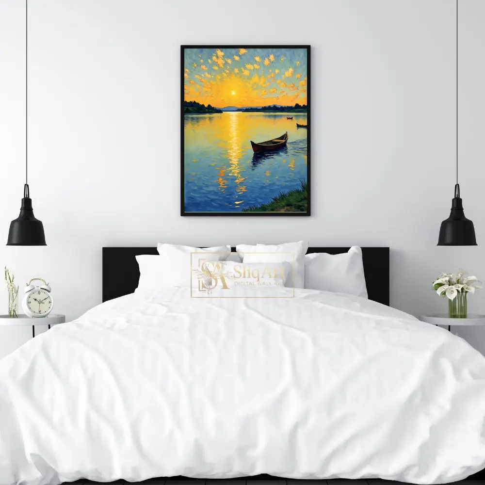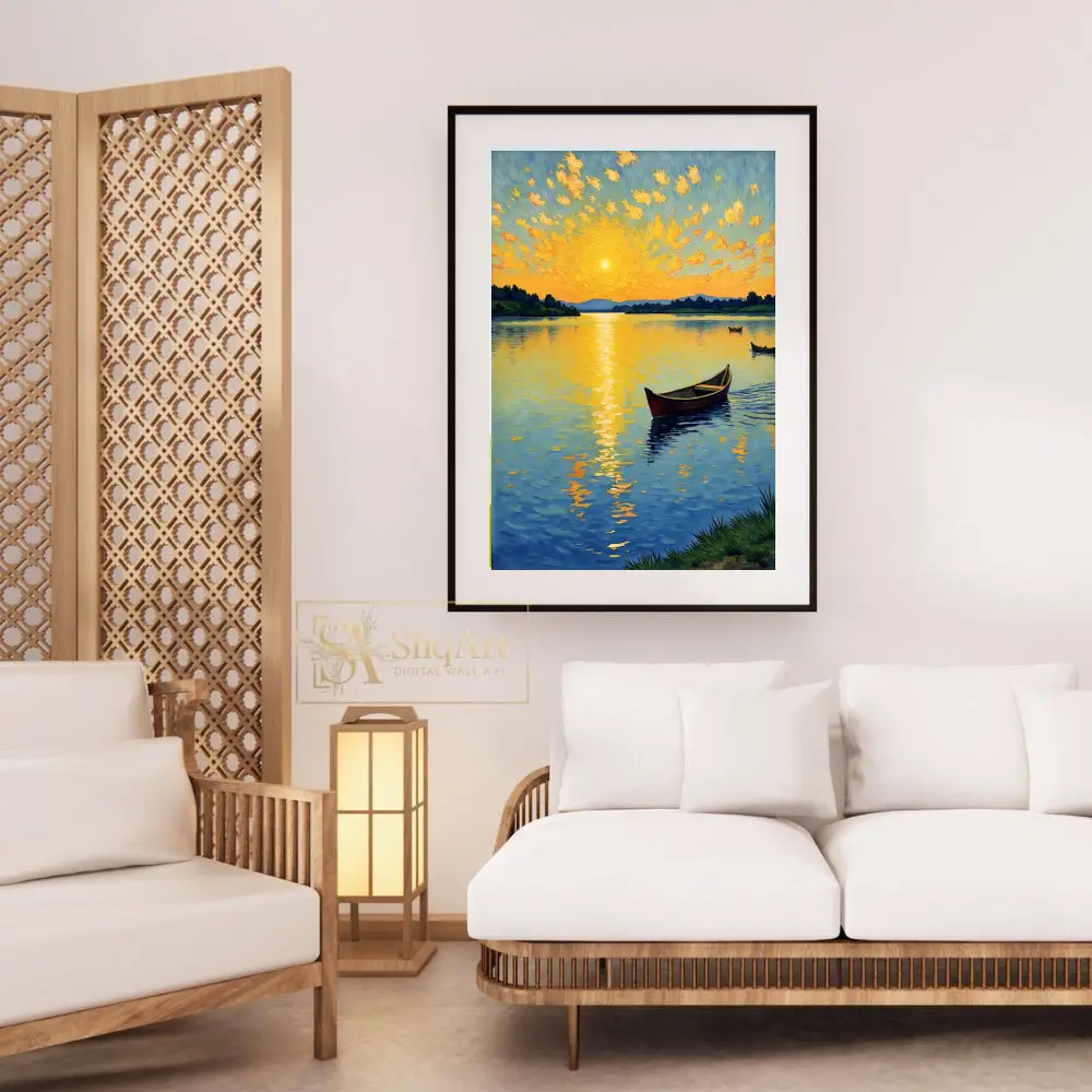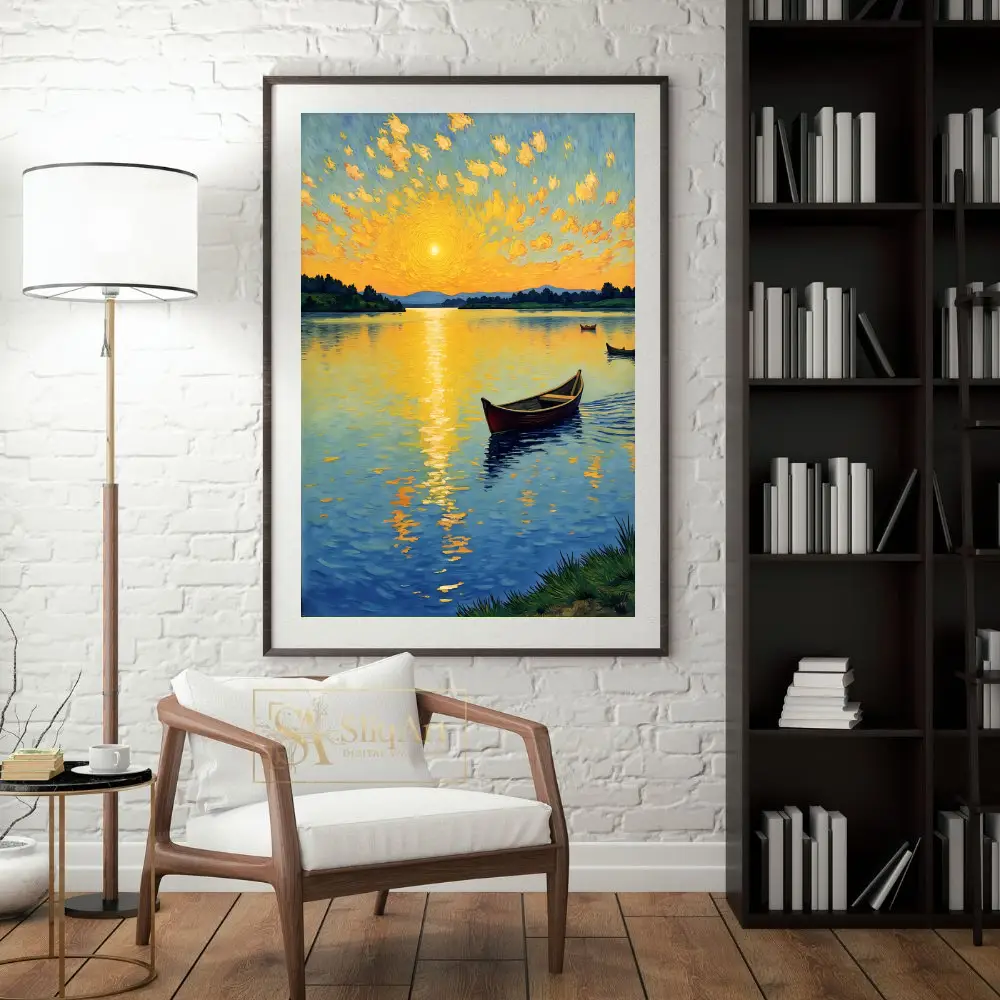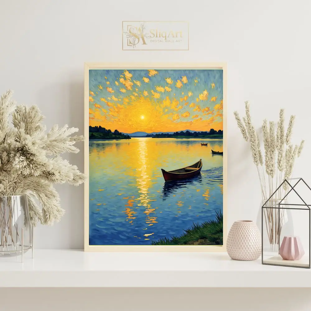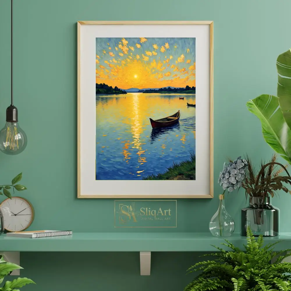 Transform your space with this stunning impressionist canvas art capturing the ethereal beauty of a sunset over a calm lake. The artwork features a radiant sun casting a shimmering golden path across the water, where traditional wooden boats drift peacefully.