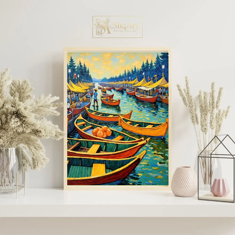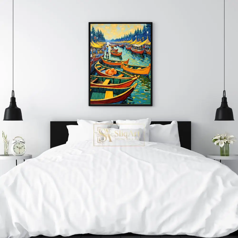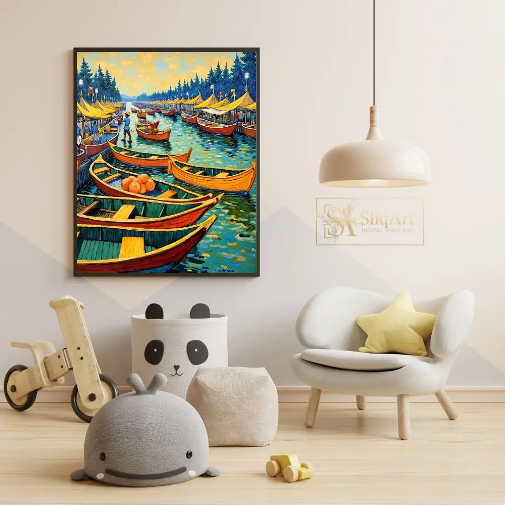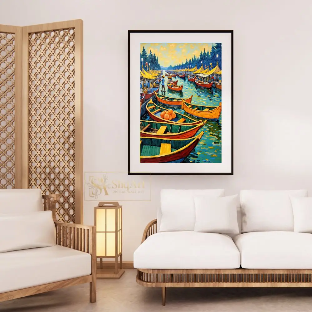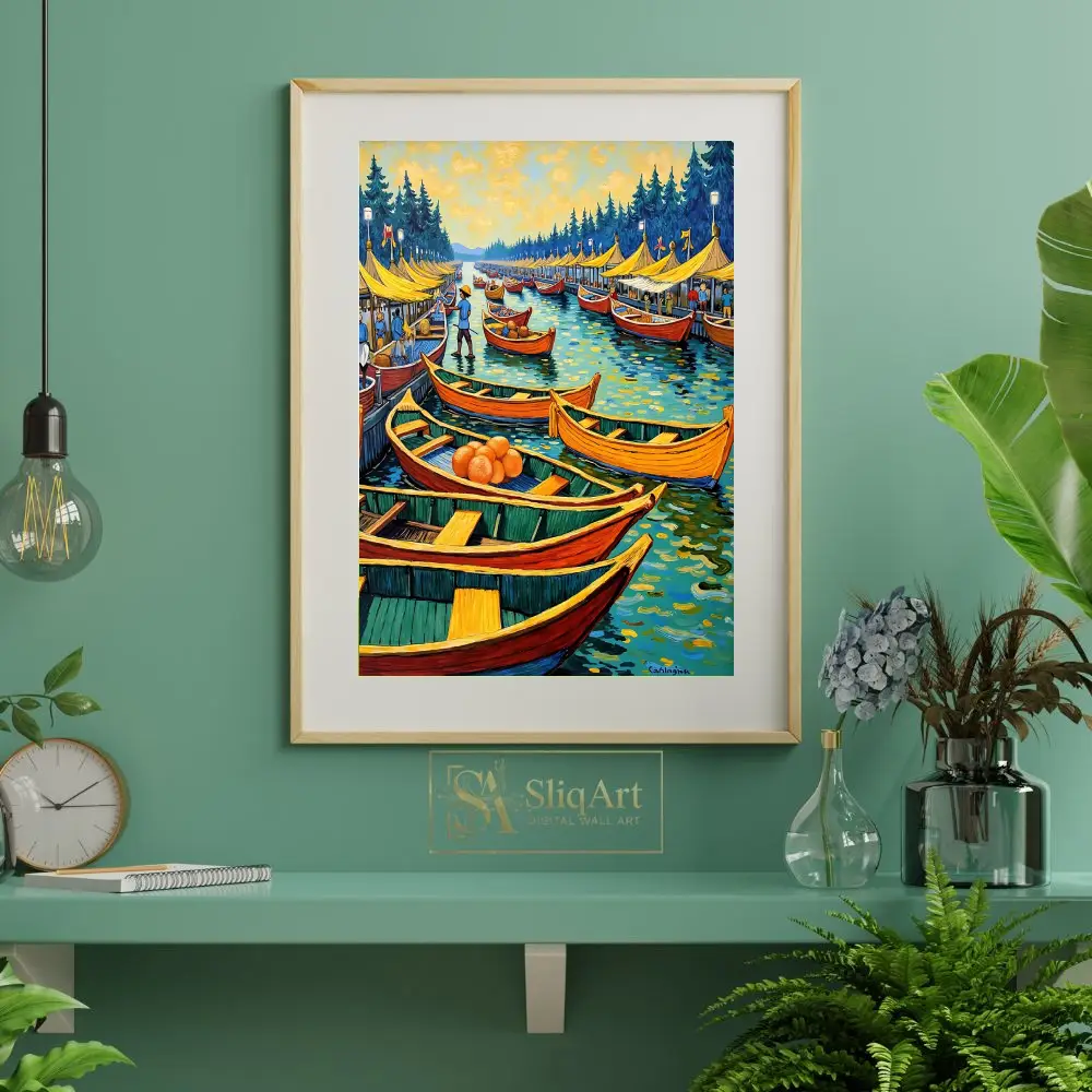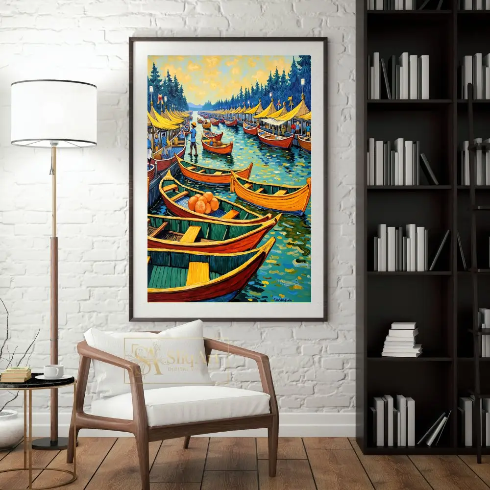 Transform your space with the vibrant energy of this impressionist-style floating market painting. Featuring a bustling harbor filled with colorful orange and red boats, this artwork captures a lively coastal scene under a golden, swirling sky.