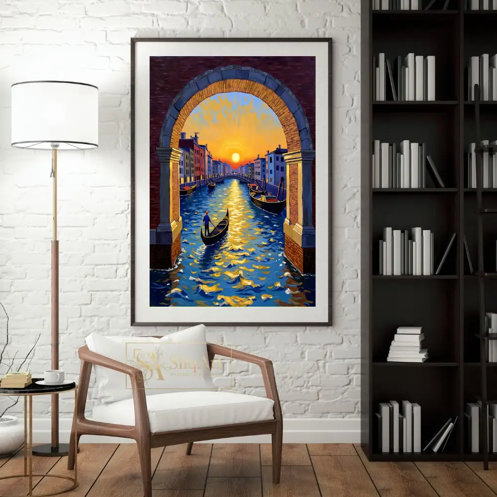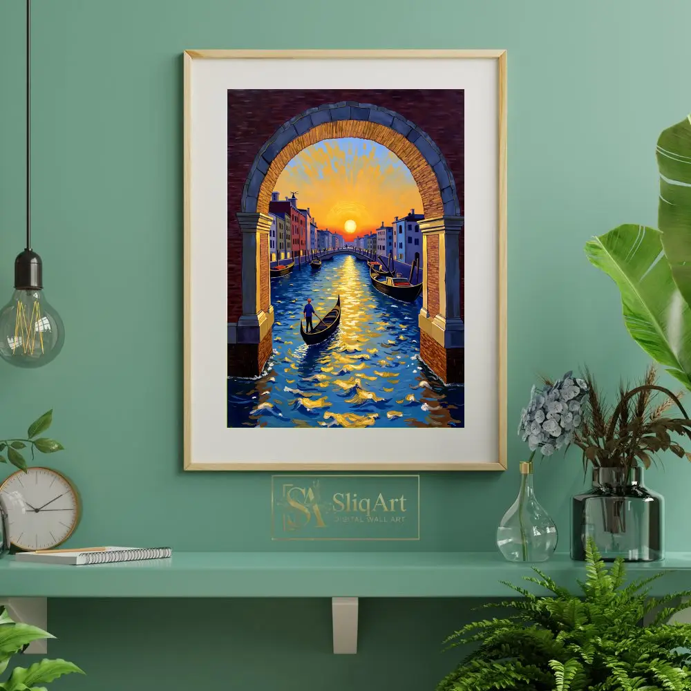 Experience the romantic allure of Venice through this stunning impressionistic masterpiece. Framed by a majestic stone archway, the scene captures a solitary gondolier navigating the shimmering blue waters of a Venetian canal as the setting sun bathes the city in a radiant golden glow.