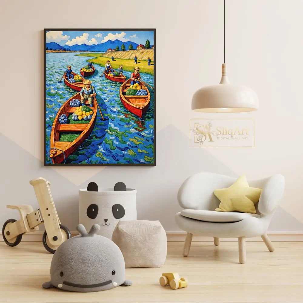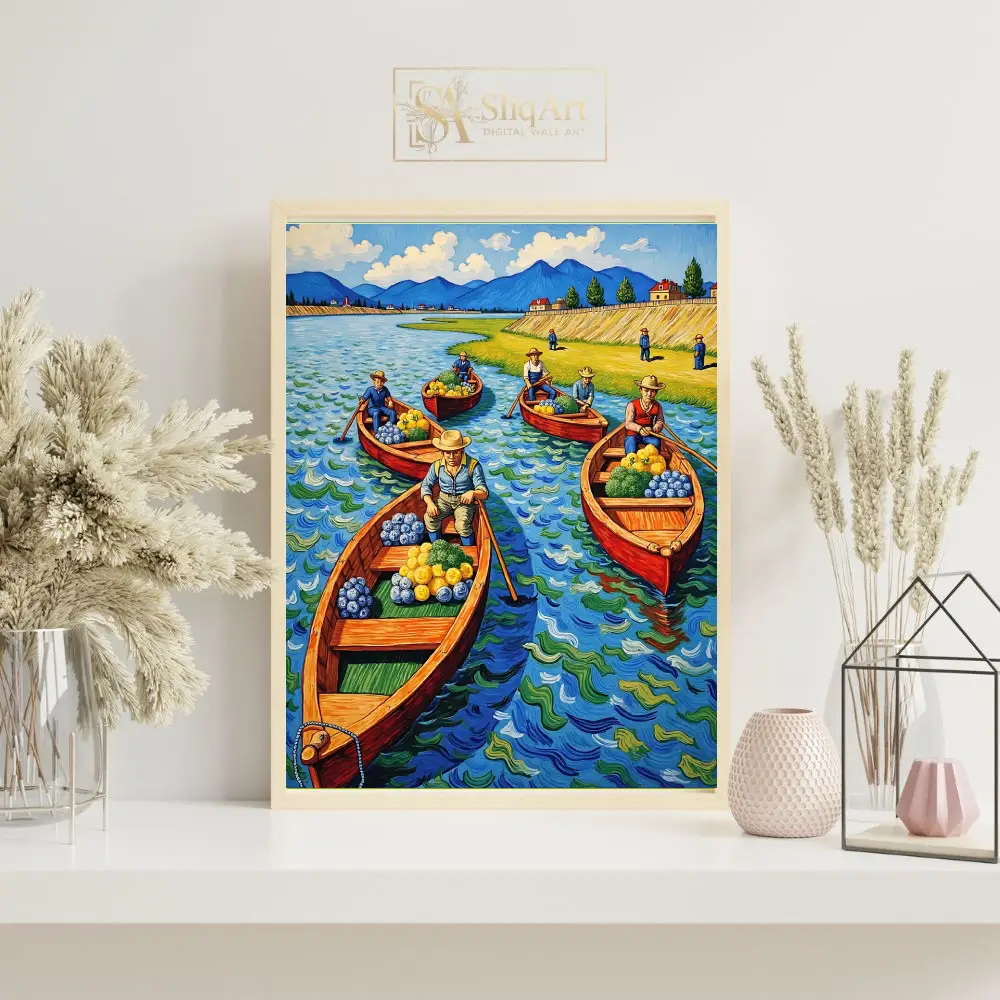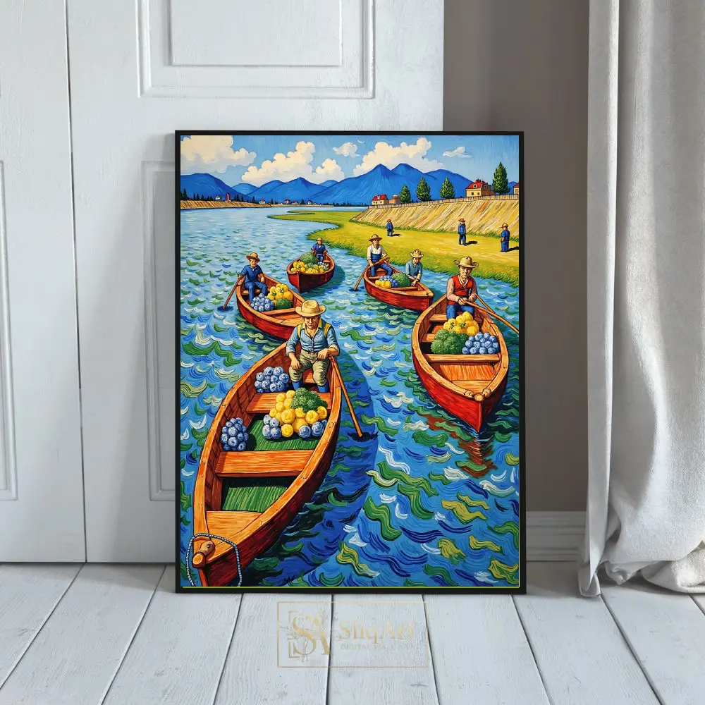 This captivating post-impressionist artwork depicts a bustling river harvest with vibrant energy. Several wooden rowboats, manned by laborers in wide-brimmed hats, navigate a churning blue river while brimming with colorful produce like lemons and berries.