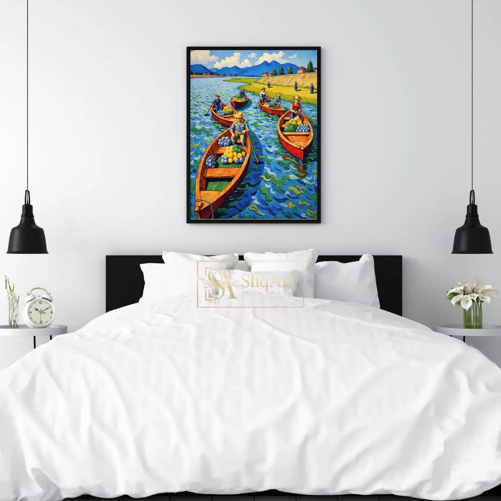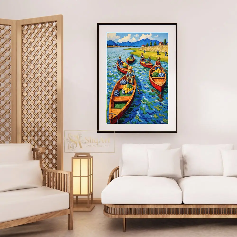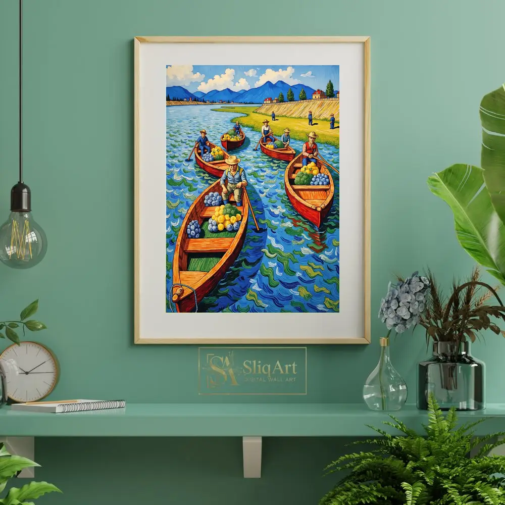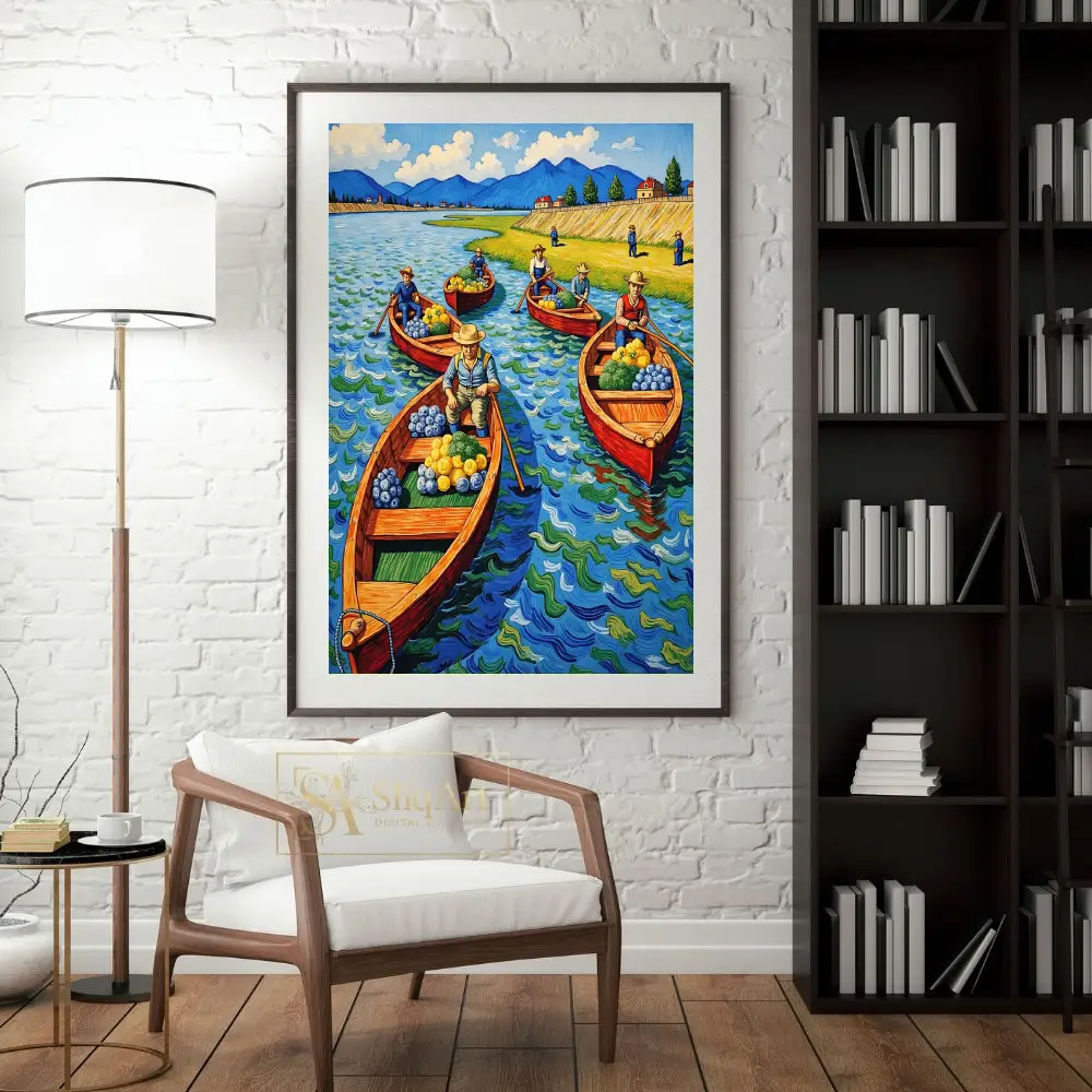 This captivating post-impressionist artwork depicts a bustling river harvest with vibrant energy. Several wooden rowboats, manned by laborers in wide-brimmed hats, navigate a churning blue river while brimming with colorful produce like lemons and berries.