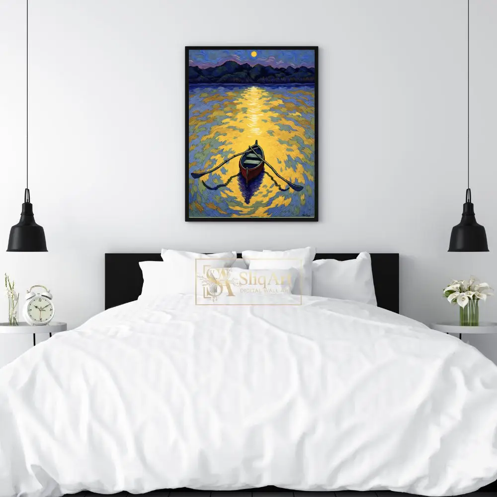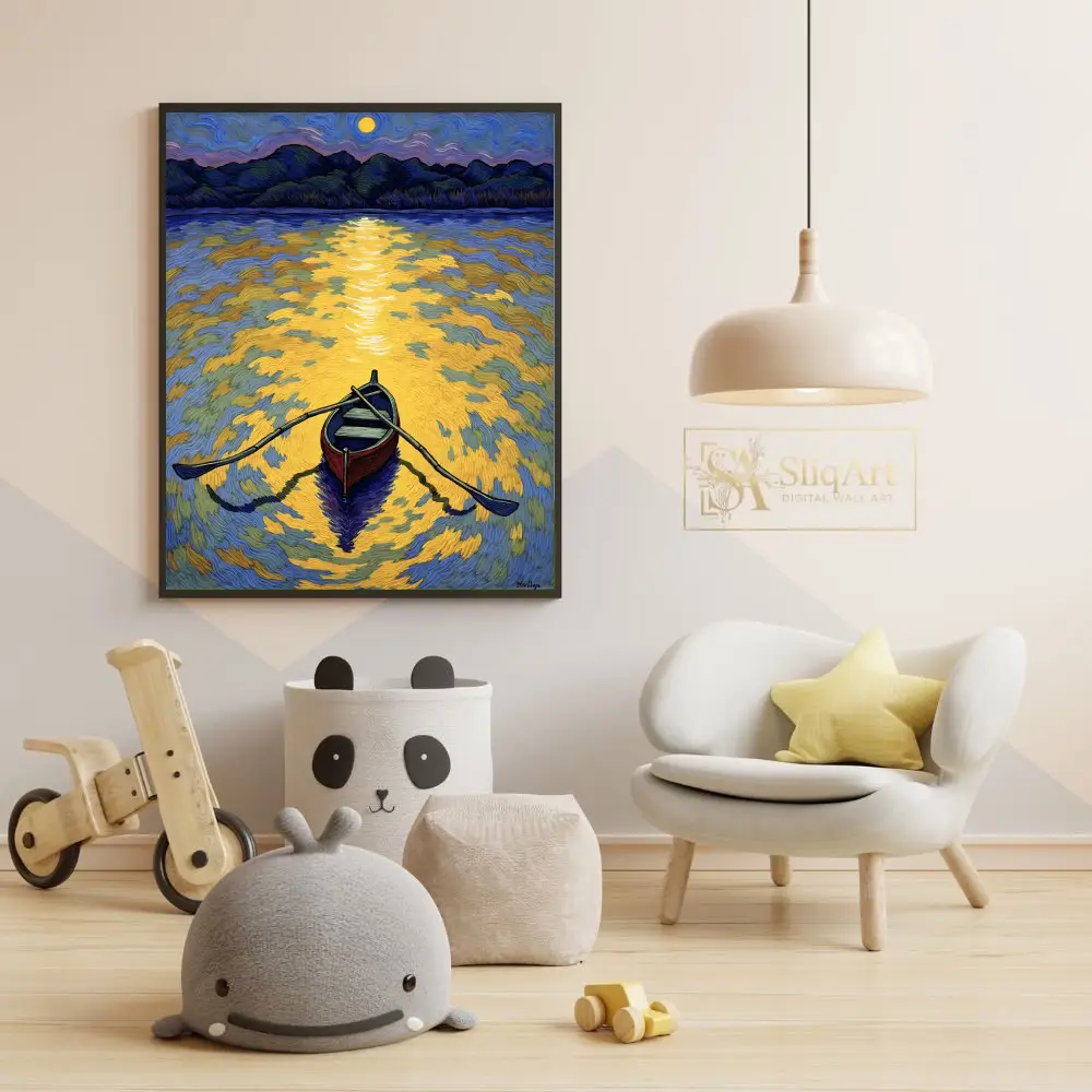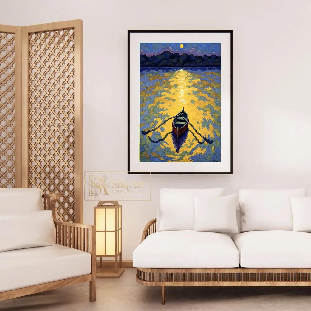 Capture the tranquil essence of a moonlit night with this breathtaking Post-Impressionist landscape. Featuring a solitary red rowboat resting upon shimmering golden waters, this artwork utilizes bold, rhythmic brushstrokes that echo the legendary style of Vincent van Gogh.
